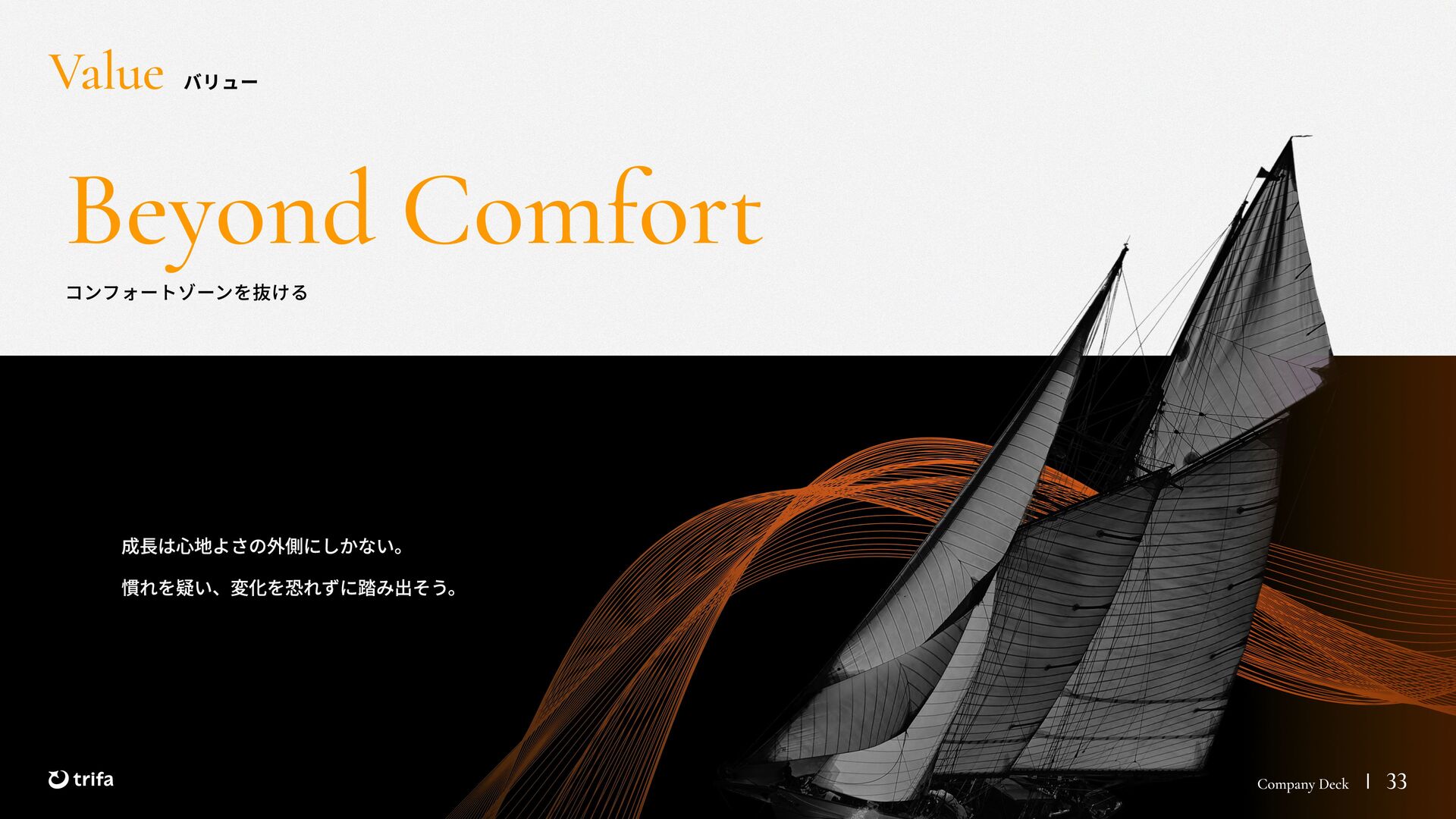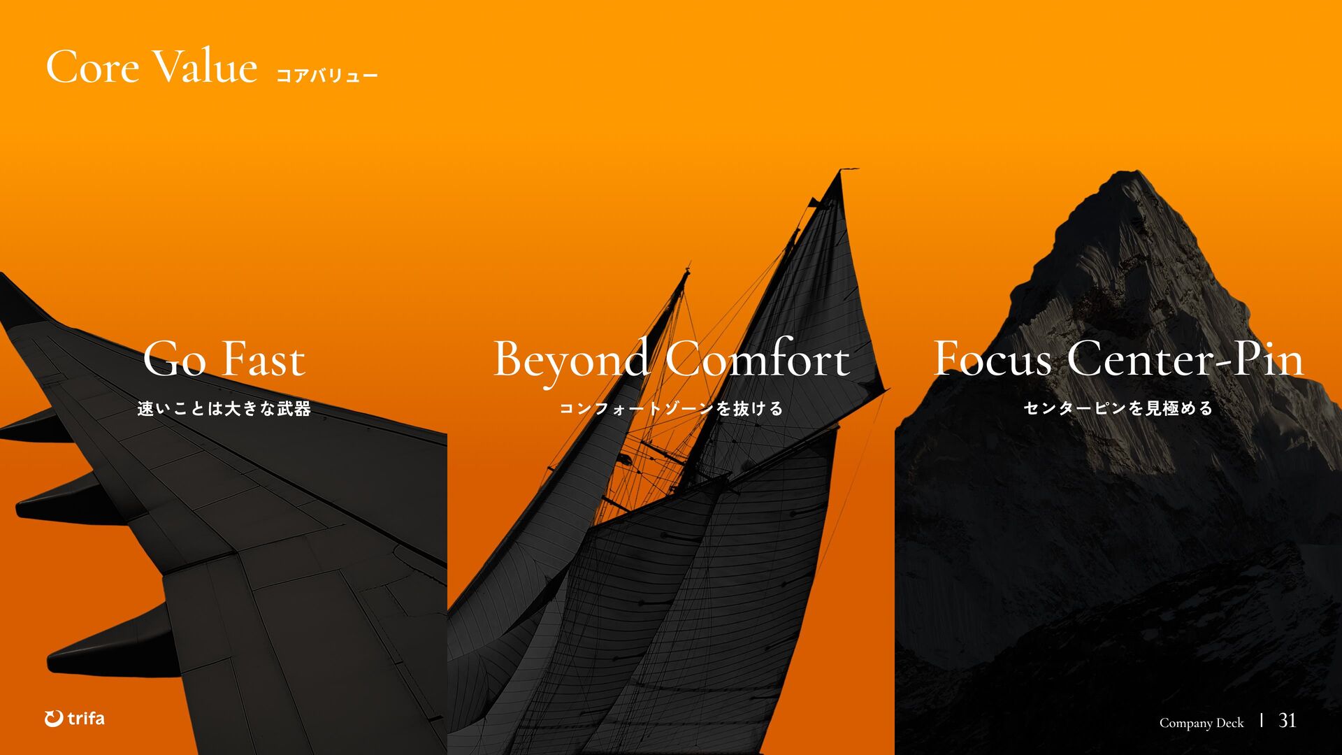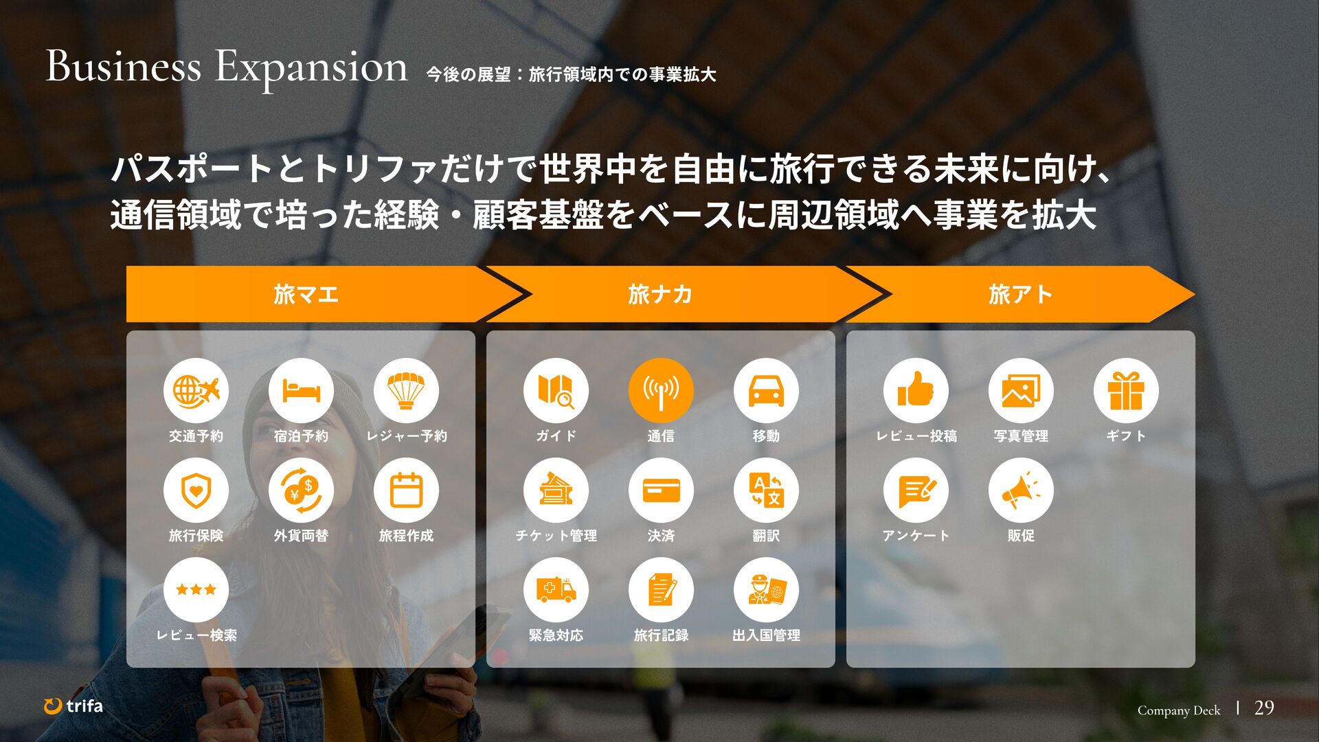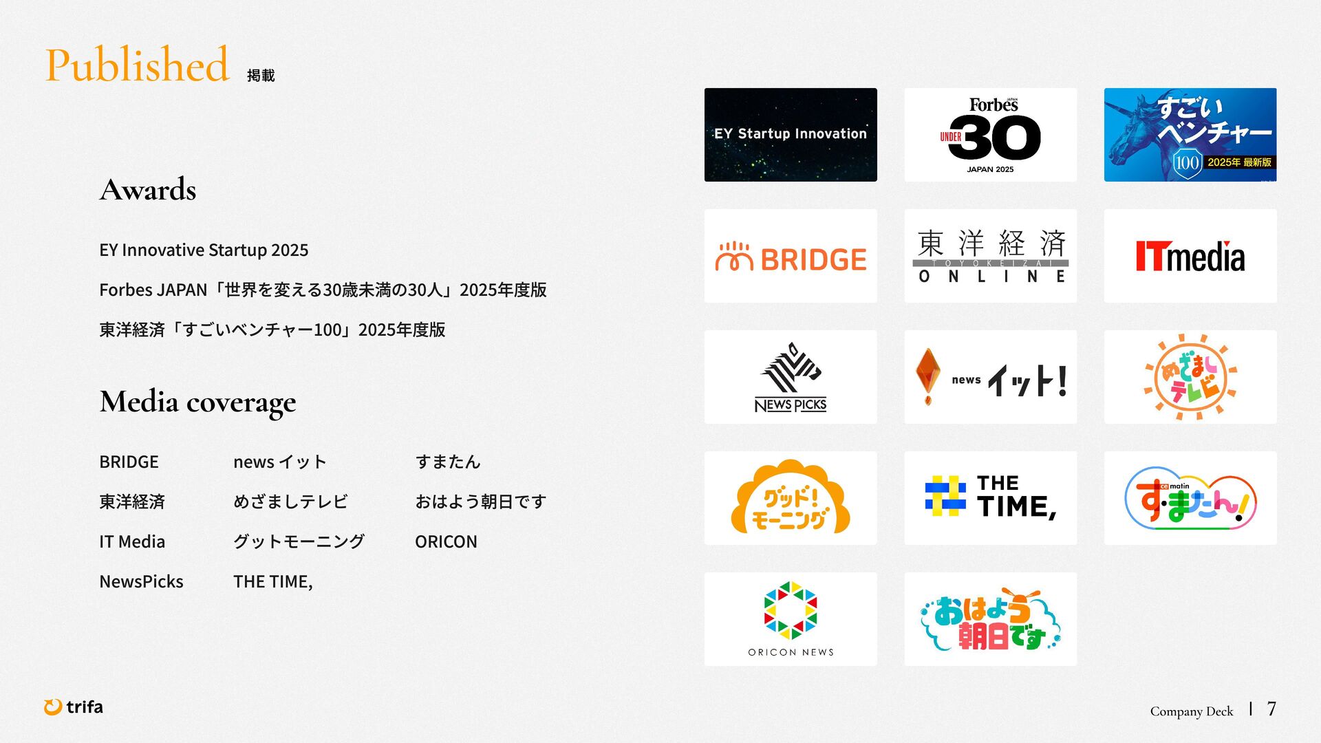 2019年 株式会社ZEALS 入社 2020年 株式会社ERAKE(現:トリファ)創業 2021年 トリファ リリース 2025年 Forbes JAPAN の「世界を変える30歳未満の30人」に選出 執行役員 永井 健太郎 1995年 石川県小松市生まれ 2018年 防衛大学校卒業 2018年 レバレジーズ株式会社 入社 2023年 株式会社トリファ 入社 2025年 執行役員就任 海外事業本部 大江 悠介 1996年 神奈川県川崎市生まれ 2019年 早稲田大学卒業 2019年 株式会社ZEALS 入社 2022年 株式会社ZEALS 米国事業立ち上げ 2024年 株式会社トリファ 入社 マーケティング事業本部 水野 祐也 198 7年 京都府伏見区生まれ 2009年 立 命館大学卒業 2020年 株式会社 Ye ny 入社 2024年 楽天シー シー アライアン スプラン ニング株式会社 入社 2025年 株式会社トリファ 入社 事業 開発本部 飯島 悠太 198 7年 東京都練馬区生まれ 2009年 早稲田大学卒業 2009年 大 和証券株式会社 入社 2022年 株式会社 INF OR ICH 入社 2025年 株式会社トリファ 入社 顧問 会田 容弘 1984年 ソニー株式会社 入社 2001年 ソネ ット ・ワー クスコミュニケー ションズ株式会社 入社 200 7年 同社 取締役 執行役員 就 任 2024年 株式会社トリファ 顧問就任 Com pa ny Dec k 40