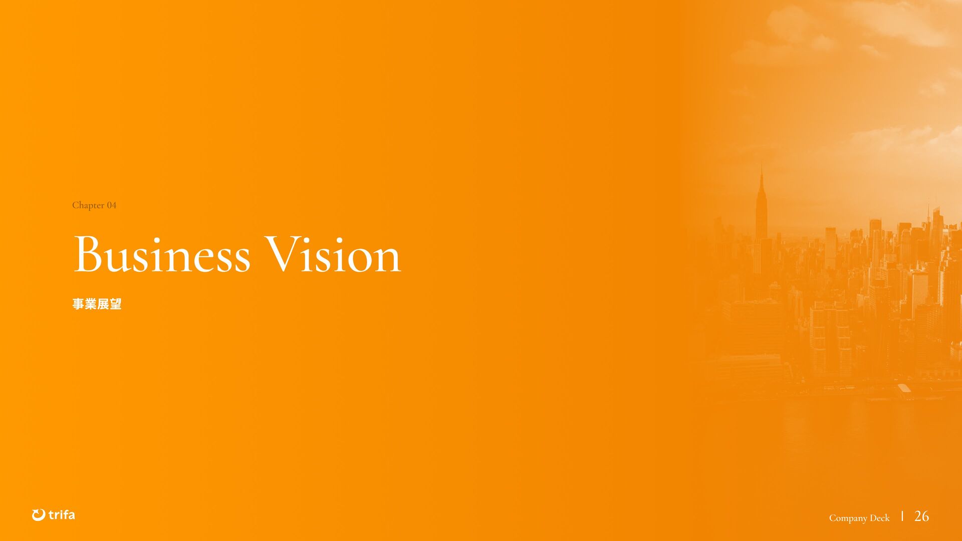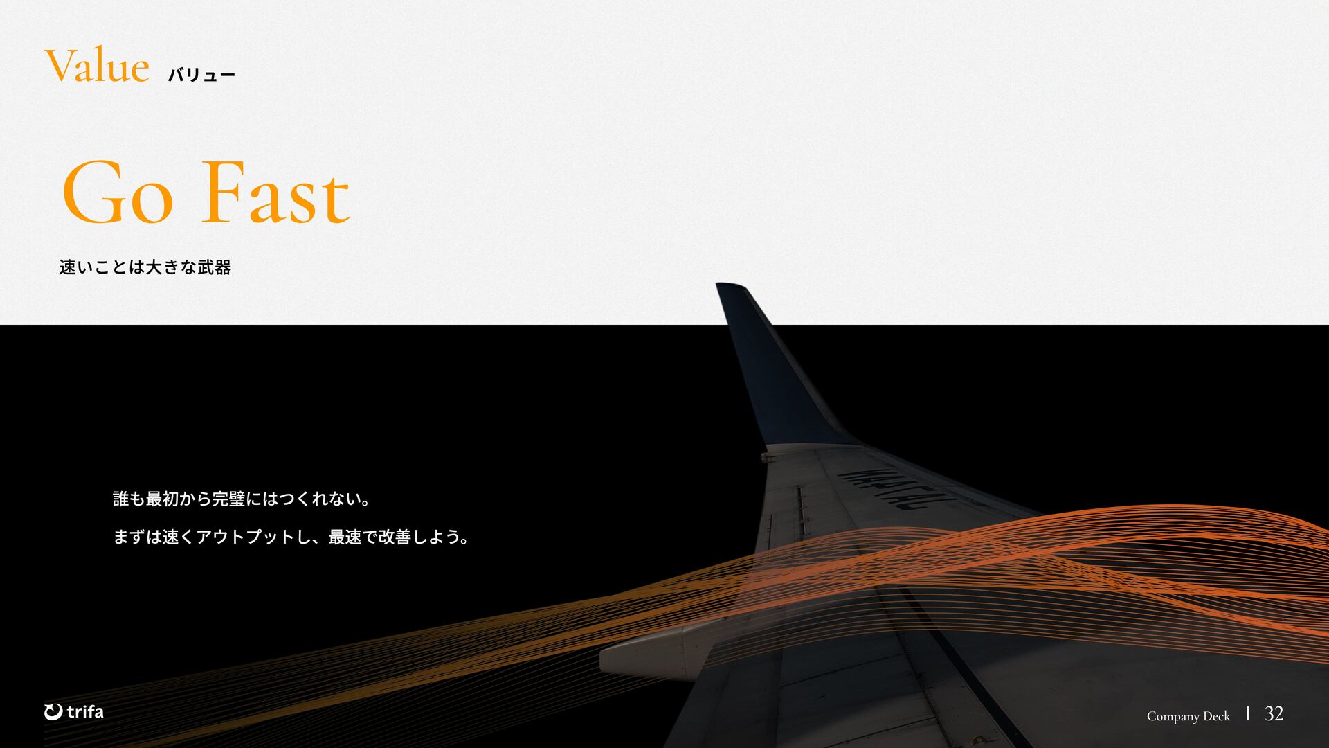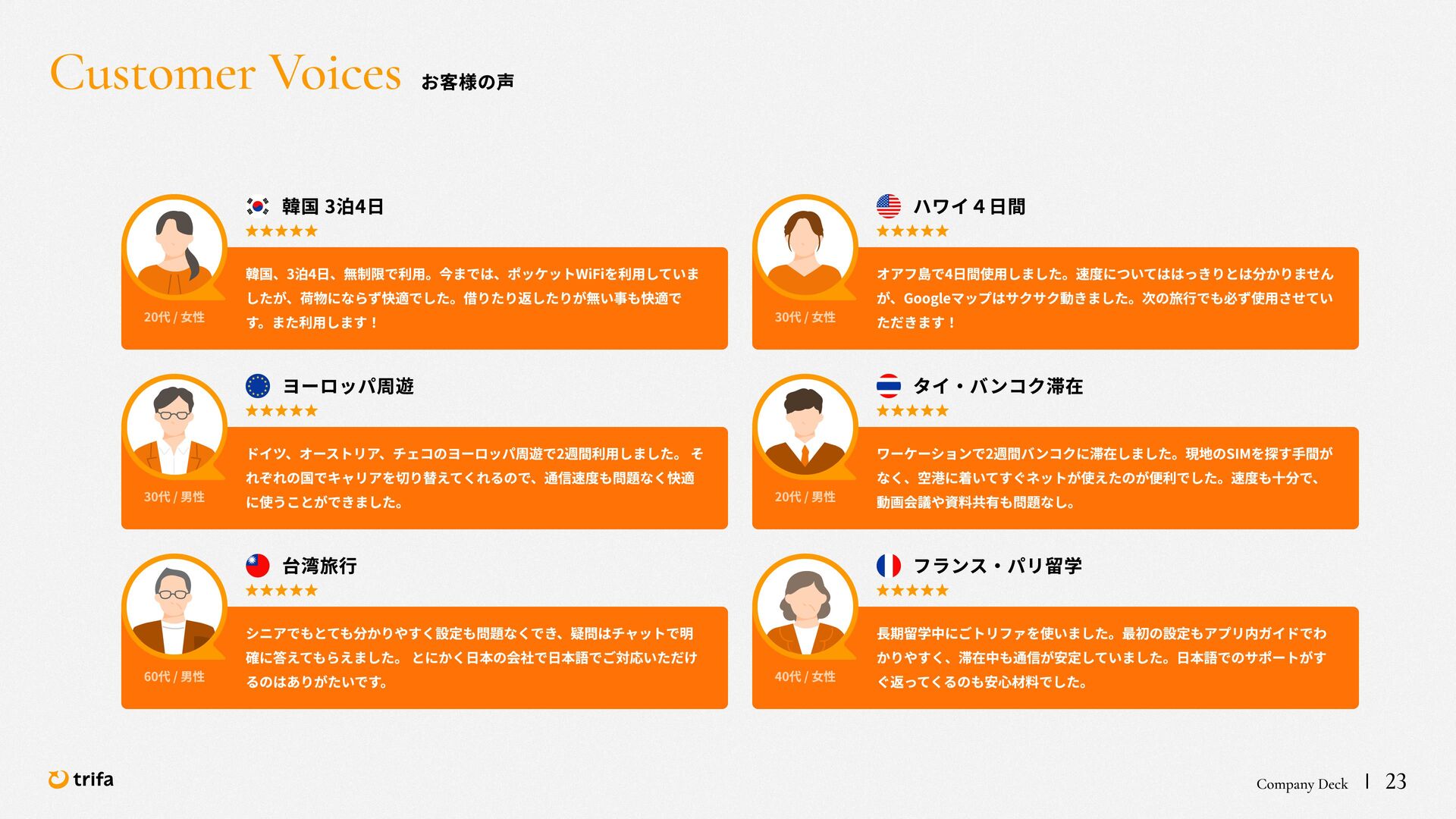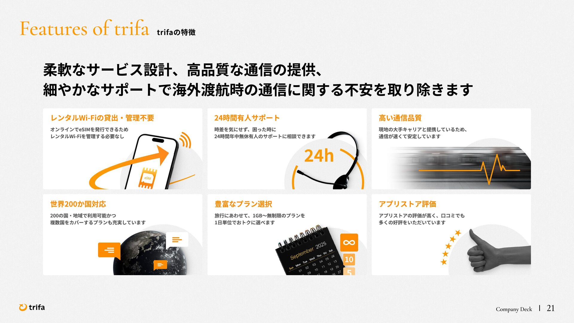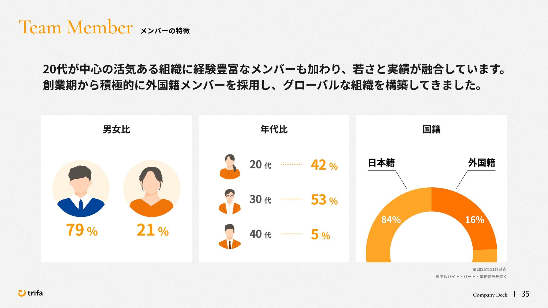 2019年 株式会社ZEALS 入社 2020年 株式会社ERAKE(現:トリファ)創業 2021年 トリファ リリース 2025年 Forbes JAPAN の「世界を変える30歳未満の30人」に選出 執行役員 永井 健太郎 1995年 石川県小松市生まれ 2018年 防衛大学校卒業 2018年 レバレジーズ株式会社 入社 2023年 株式会社トリファ 入社 2025年 執行役員就任 海外事業本部 大江 悠介 1996年 神奈川県川崎市生まれ 2019年 早稲田大学卒業 2019年 株式会社ZEALS 入社 2022年 株式会社ZEALS 米国事業立ち上げ 2024年 株式会社トリファ 入社 マーケティング事業本部 水野 祐也 198 7年 京都府伏見区生まれ 2009年 立 命館大学卒業 2020年 株式会社 Ye ny 入社 2024年 楽天シー シー アライアン スプラン ニング株式会社 入社 2025年 株式会社トリファ 入社 事業 開発本部 飯島 悠太 198 7年 東京都練馬区生まれ 2009年 早稲田大学卒業 2009年 大 和証券株式会社 入社 2022年 株式会社 INF OR ICH 入社 2025年 株式会社トリファ 入社 顧問 会田 容弘 1984年 ソニー株式会社 入社 2001年 ソネ ット ・ワー クスコミュニケー ションズ株式会社 入社 200 7年 同社 取締役 執行役員 就 任 2024年 株式会社トリファ 顧問就任 Com pa ny Dec k 40