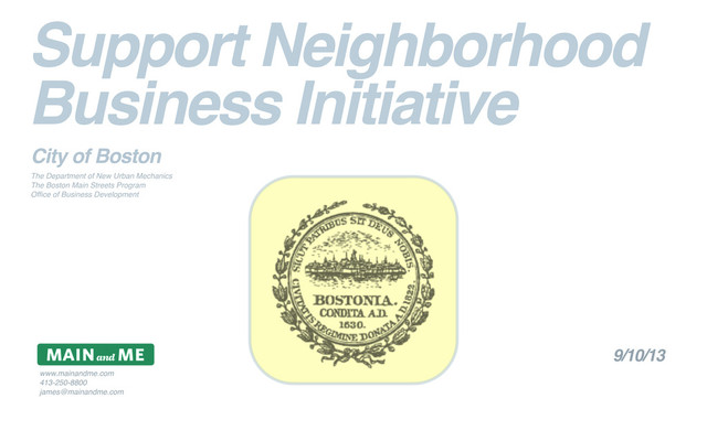 9/10/13 presentation made to City of Boston Support Neighborhood Business Initiative wherein it is proposed to use online LOCAL product and service discovery to drive foot traffic to independent Boston neighborhood businesses.