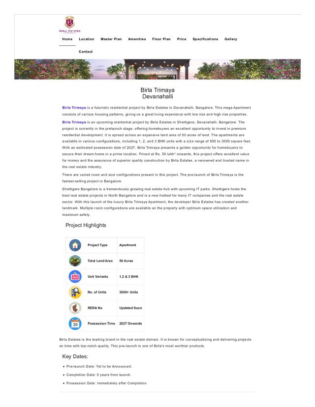 North Bangalore has given space to the majority of IT corridors of the city with substantial-tech parks and IT industries. The most famous IT parks like the Hardware Tech Park, Aero SEZ, and International Tech Park have already started offering job opportunities to many of India's working professionals, impacting the real estate sector. Along with other developments, Information Technology Investment Region (ITIR), Upcoming Science Park and Financial City have created a considerable buzz in the vicinity, increasing the locality potential. After establishing various commercial hubs and software parks in and around Devanahalli, the daily commute to work should be hassle-free, attracting investors to this zone. Locality Go in for the places near the workplace Ensure it has excellent infrastructure and connectivity features. We do not have to roam around for primary ones like bus, train, and flight facilities. Be it any product we purchase, we look for edges that keep us delightful. When it comes to high-cost properties, we all should be heedful about the money we put in for buying the property and its appropriate properties. Birla Trimaya Bangalore is ideal for its fashion, quality, and resale value. Bangalore is the prominent place anyone could think of for prosperous Opportunities. Aspirants across the country wish to settle in this city for its invariable offers. So the city also should be well prepared to accommodate and please the inflow population. The city does a tremendous job by offering many connecting roads which seamlessly connect many parts of the city. Thus the Birla Estates will also craft its extensive Apartment shortly to give us a great living experience. Importance of Connectivity in Residential Real Estate: For any city, connectivity is the backbone. If it is not proper, the city doesn't operate or function well. Namma Metro - Metro Line The Apartment locality has proposed that Metro services come in shortly, further simplifying the commuting experience. Many bus stands are present in the area with a railway station and Airport in the same Devanahalli region. Apartments in Devanahalli Birla Apartments in Devanahalli will be a remarkable landmark in the region for its grandeur and compelling features. Advantages: As the property is a Apartment, we get a variety of residential clusters like plots, apartments, villas, and commercial spaces like malls, hospitals, or schools. We get to live in a mini-city atmosphere where facilities like shopping malls and recreational facilities like swimming pools and spas are all available. The property looks exquisite with many natural and charming views with extensive landscaped gardens, parks, open spaces, play areas, and walking tracks. As we know, Apartments are trendsetters these days. Hence the resale value is pretty high. Connectivity: