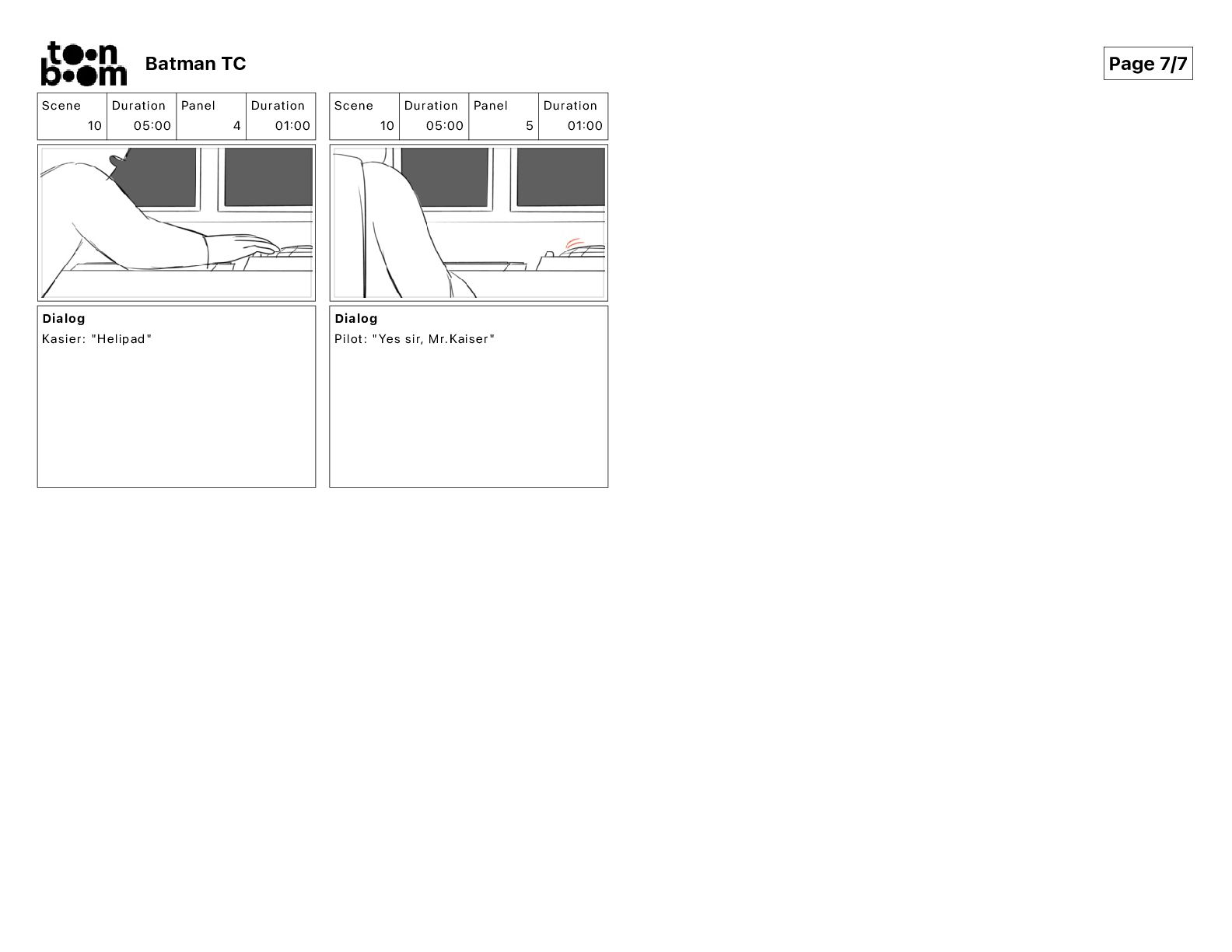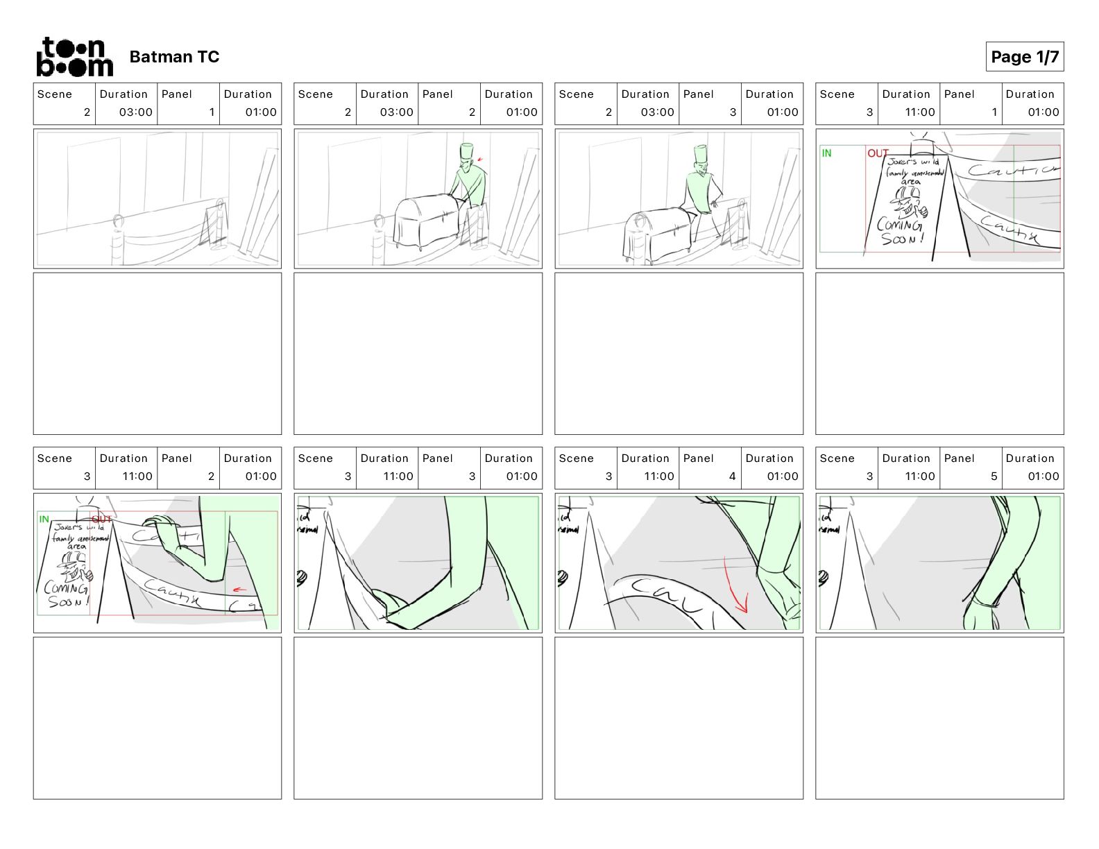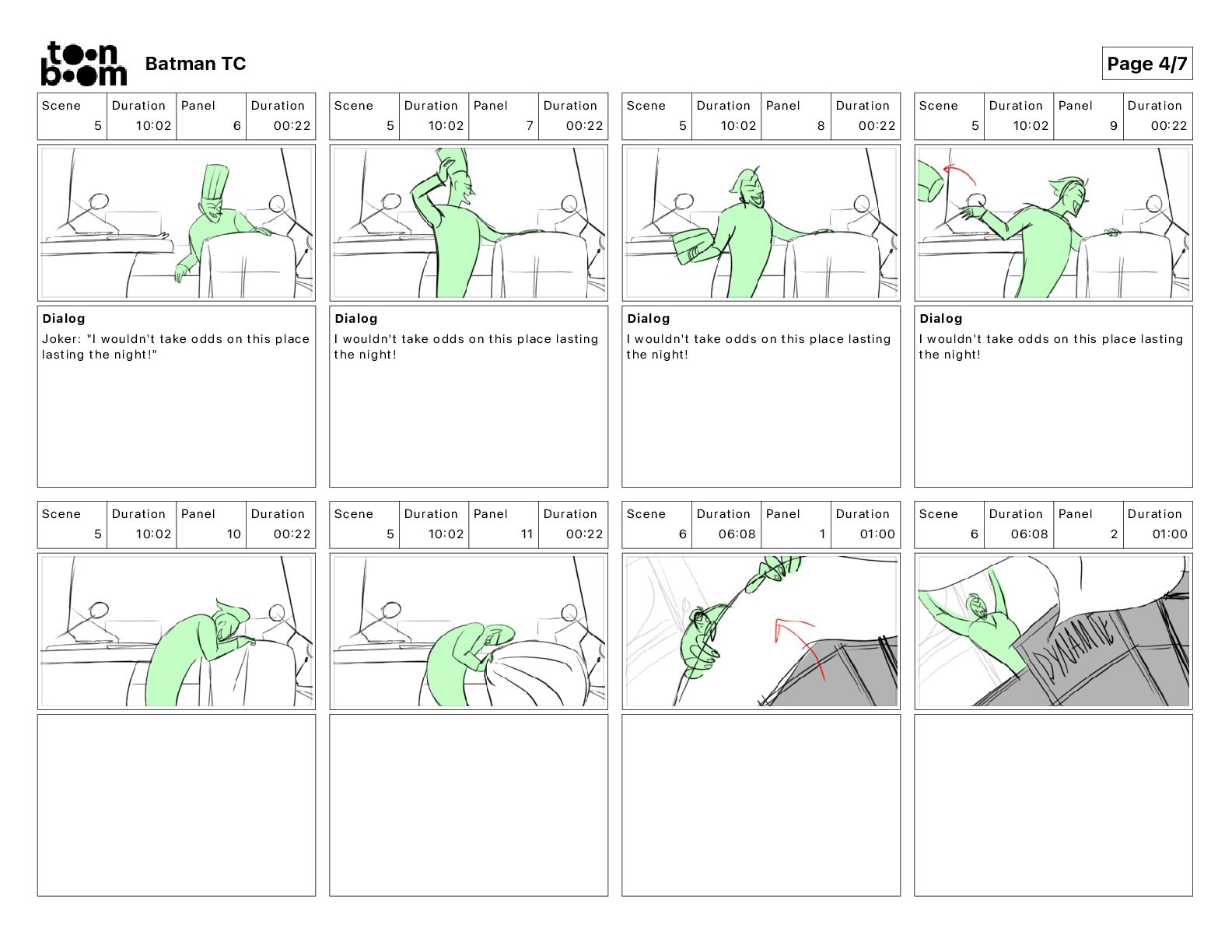 Dialog Joker: "I wouldn't take odds on this place lasting the night!" Scene 5 Duration 10 02 Panel 7 Duration 00 22 Dialog I wouldn't take odds on this place lasting the night! Scene 5 Duration 10 02 Panel 8 Duration 00 22 Dialog I wouldn't take odds on this place lasting the night! Scene 5 Duration 10 02 Panel 9 Duration 00 22 Dialog I wouldn't take odds on this place lasting the night! Scene 5 Duration 10 02 Panel 10 Duration 00 22 Scene 5 Duration 10 02 Panel 11 Duration 00 22 Scene 6 Duration 06 08 Panel 1 Duration 01 00 Scene 6 Duration 06 08 Panel 2 Duration 01 00 Batman TC Page 4/7