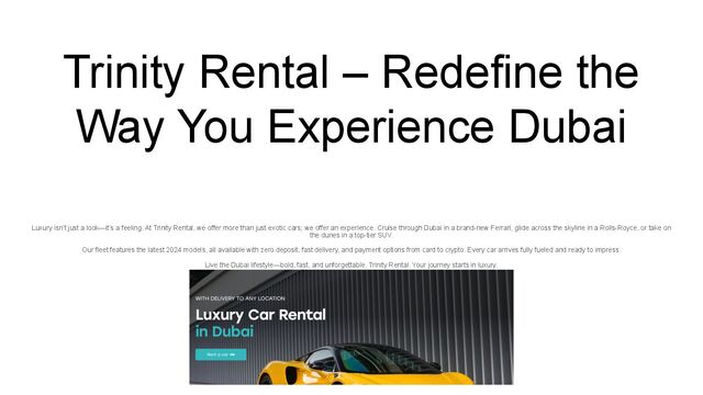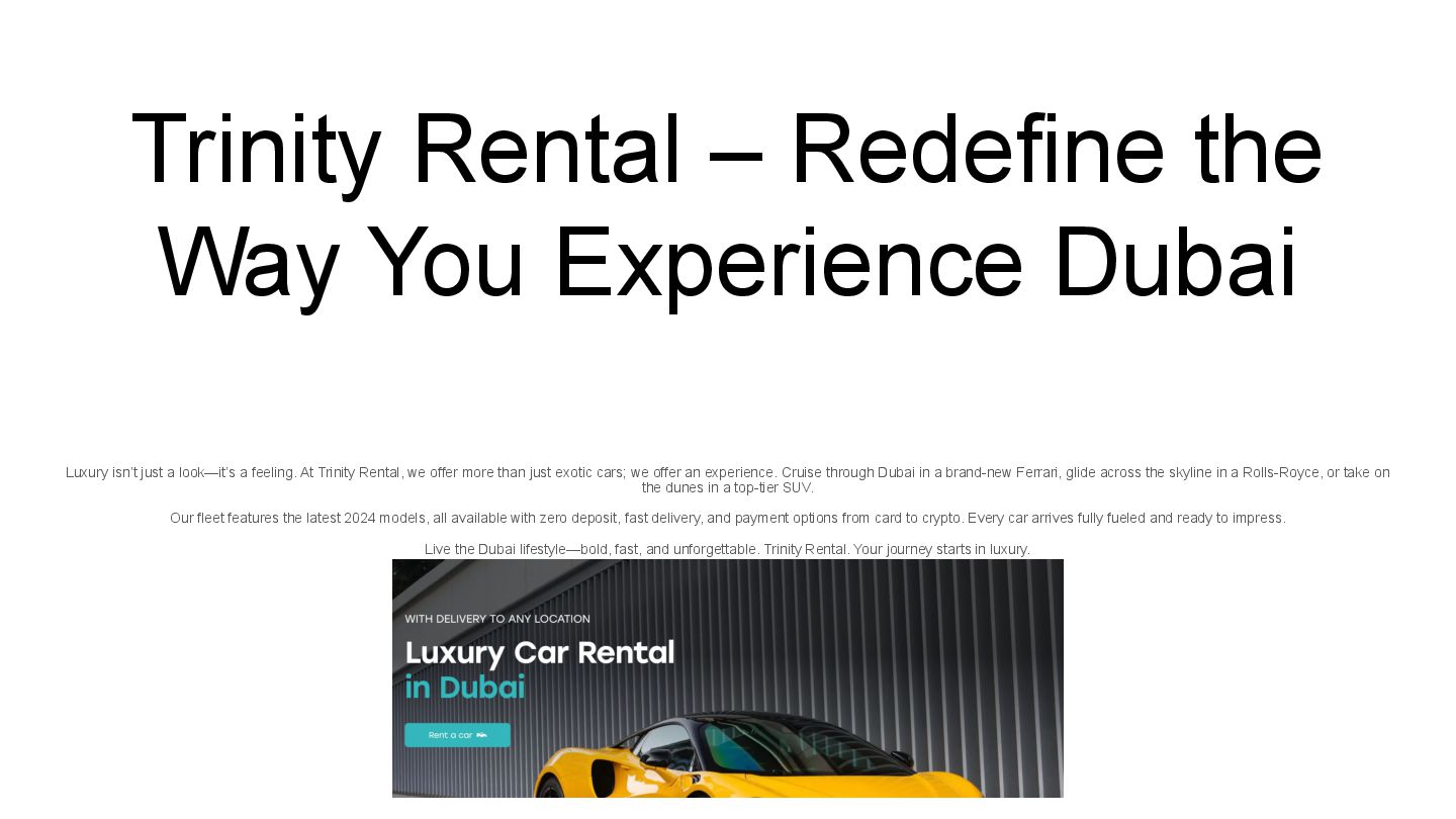 See Dubai the way it’s meant to be seen—behind the wheel of a world-class car. Trinity Rental offers a handpicked fleet of luxury vehicles including Lamborghini, Bentley, Ferrari, and Rolls-Royce.