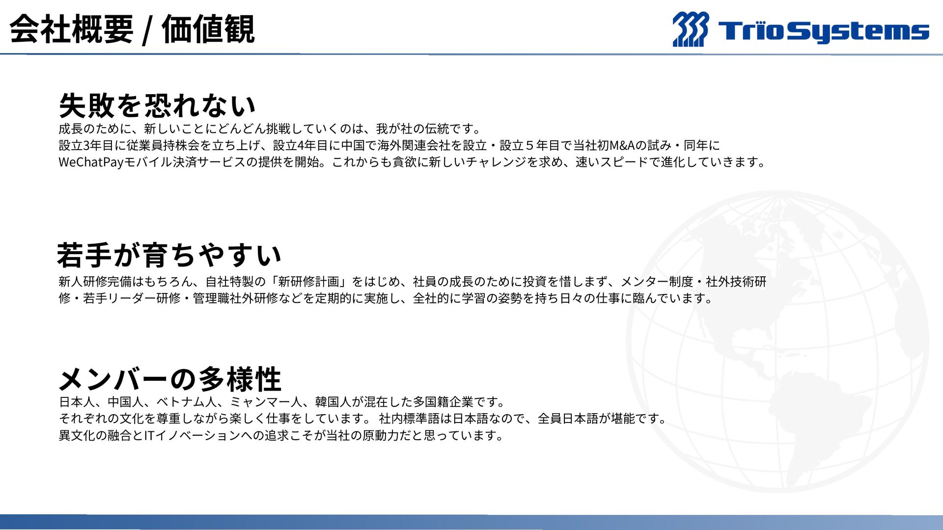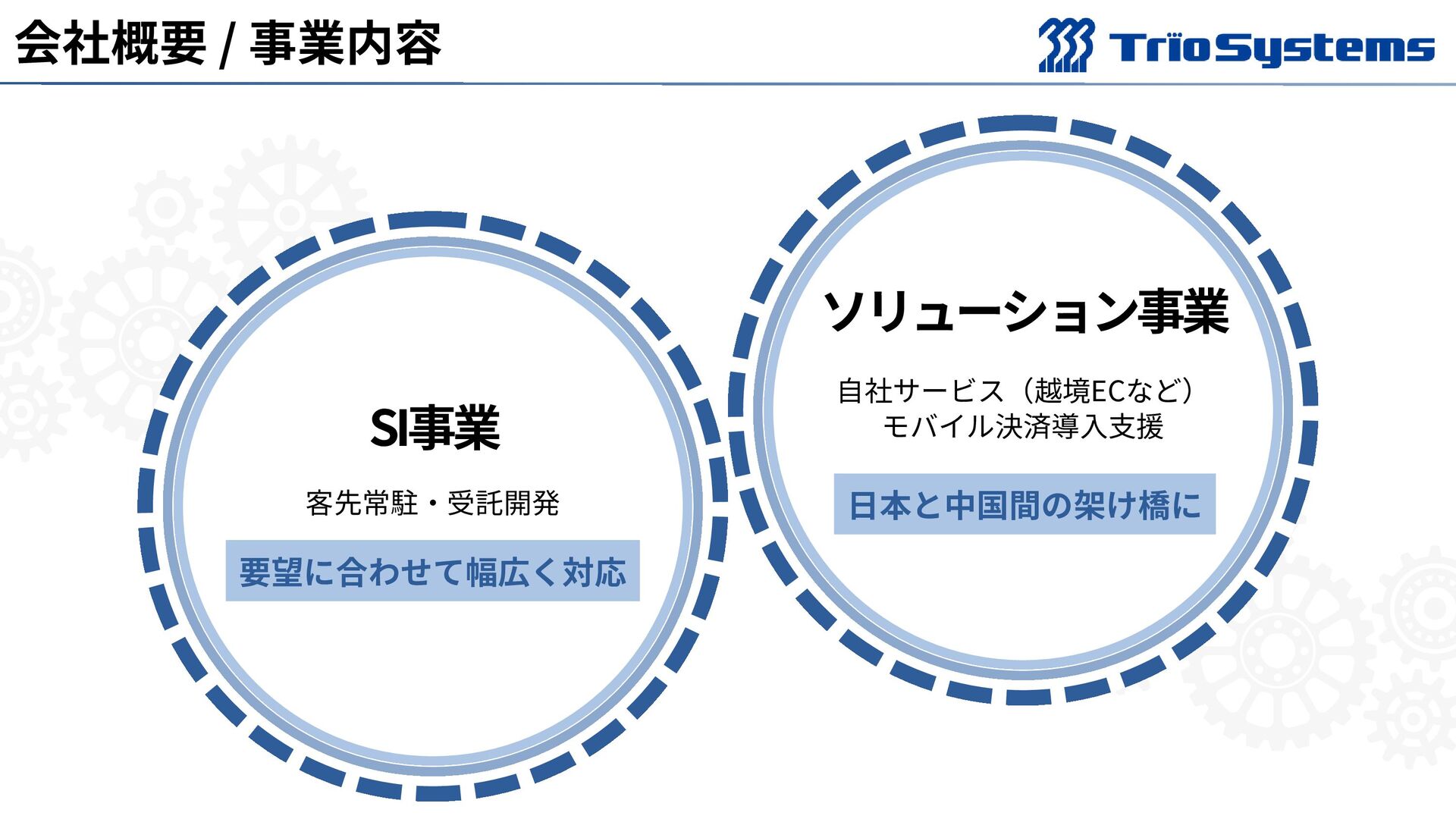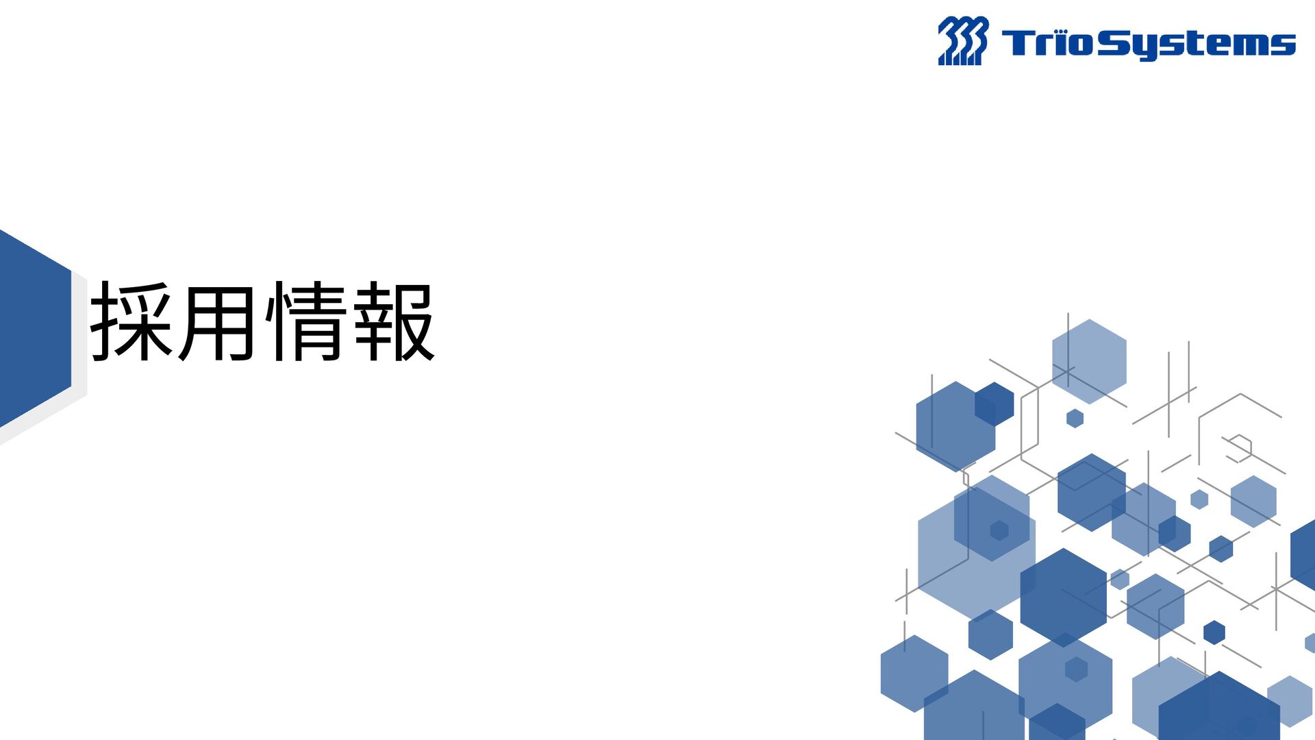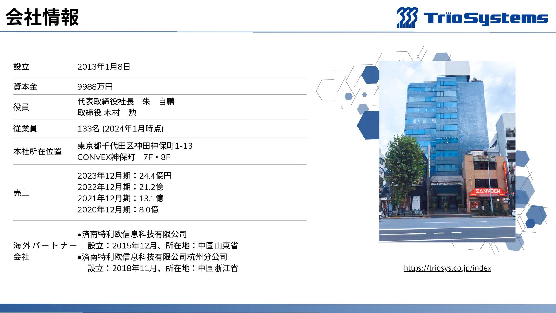 取締役 木村 勲 従業員 133 名 (2024 年1 月時点) 本社所在位置 東京都千代田区神田神保町1-13 CONVEX 神保町 7F ・8F 売上 2023 年12 月期:24.4 億円 2022 年12 月期:21.2 億 2021 年12 月期:13.1 億 2020 年12 月期:8.0 億 海外パートナー 会社 • 済南特利欧信息科技有限公司 設立:2015 年12 月、所在地:中国山東省 • 済南特利欧信息科技有限公司杭州分公司 設立:2018 年11 月、所在地:中国浙江省 会社情報 https://triosys.co.jp/index