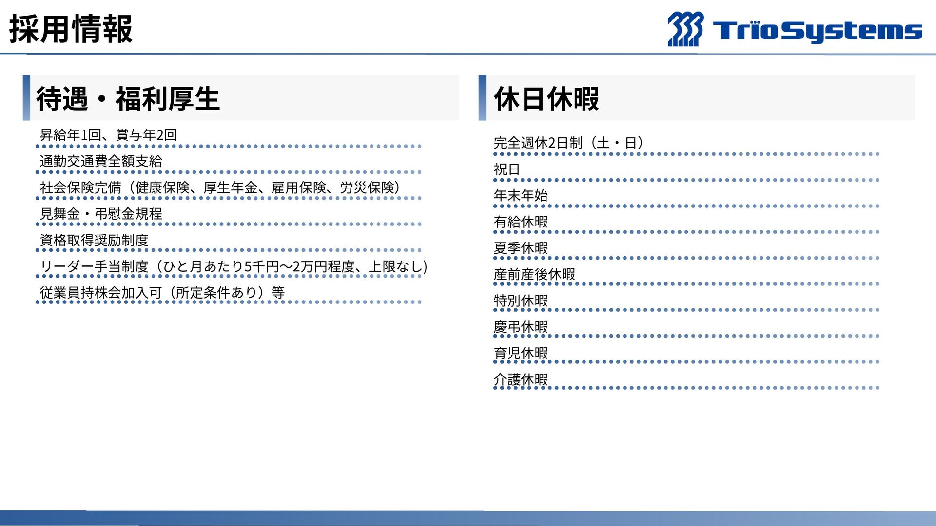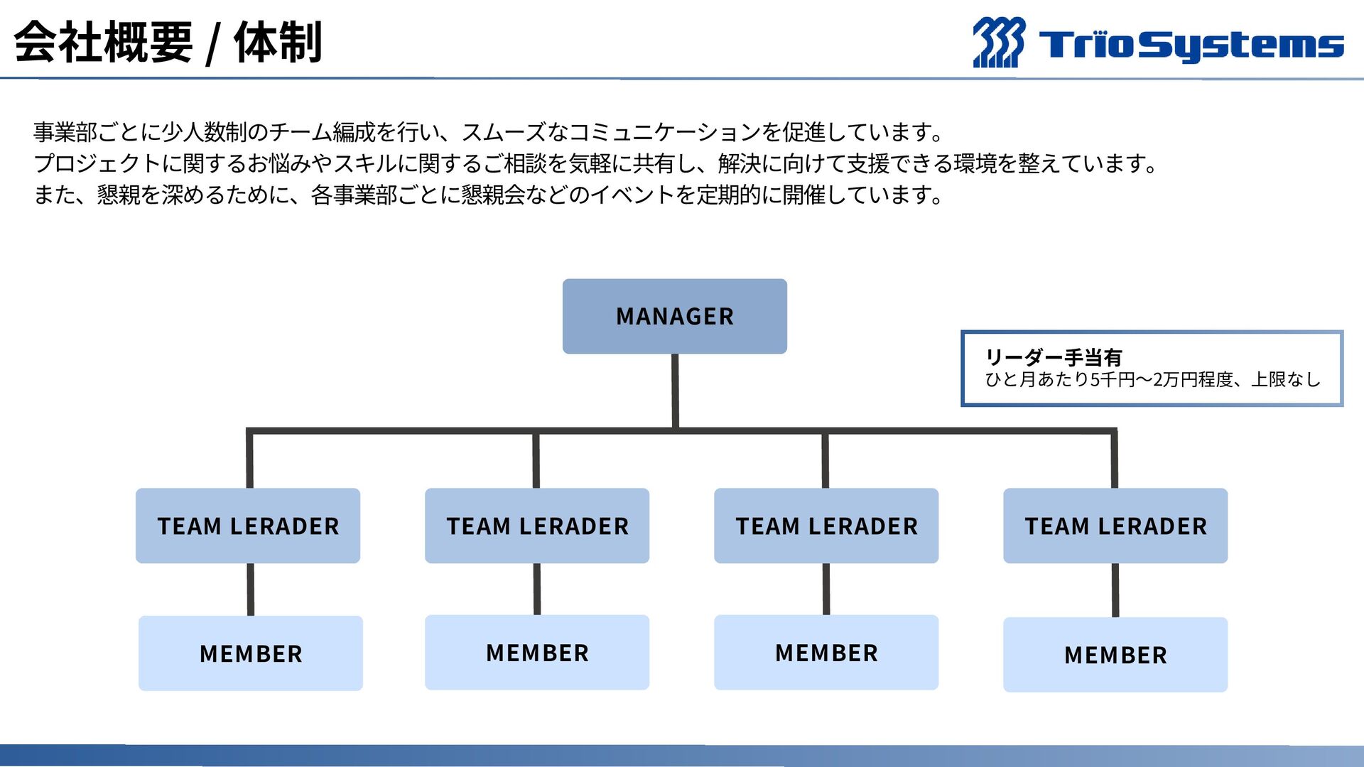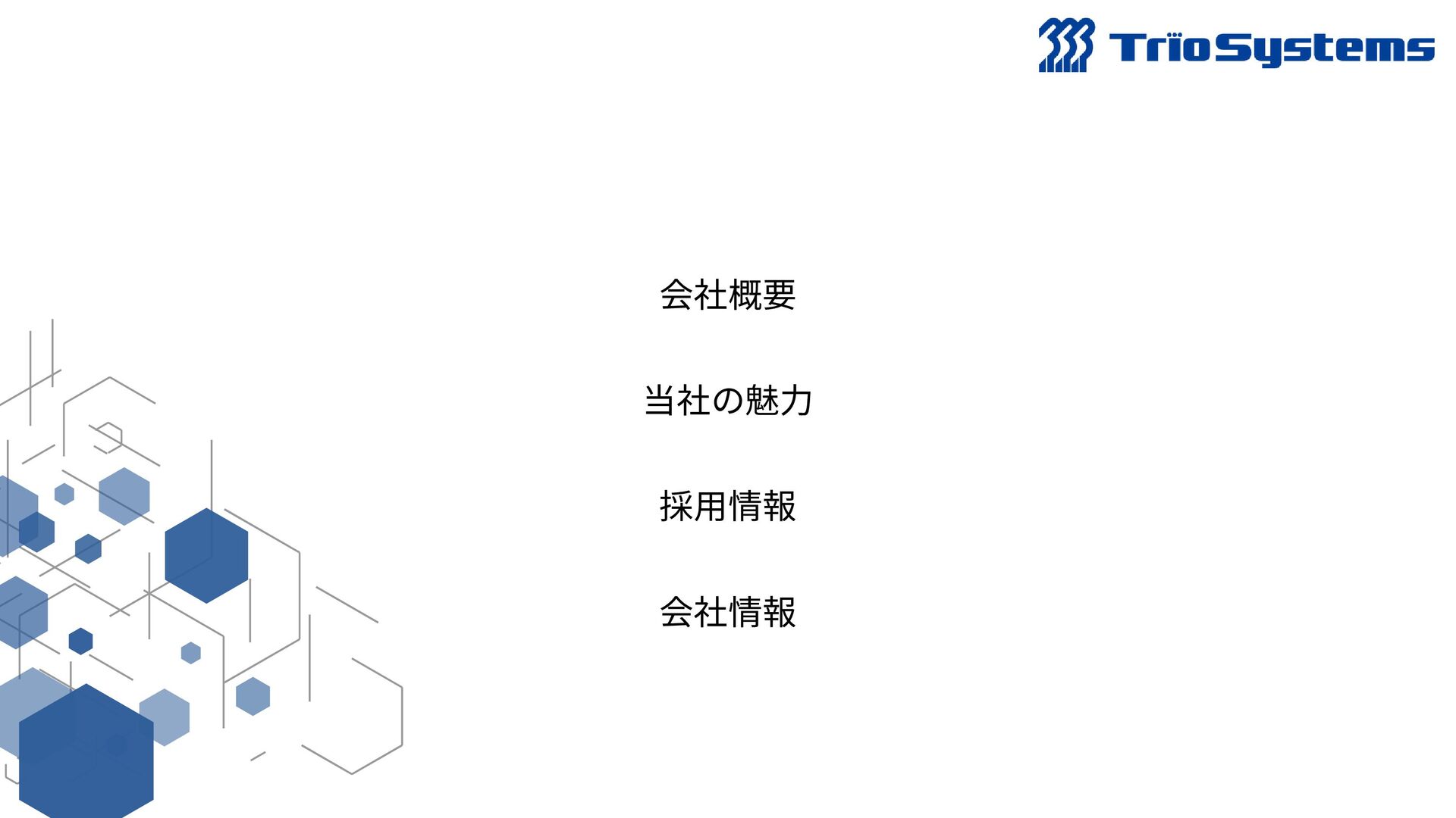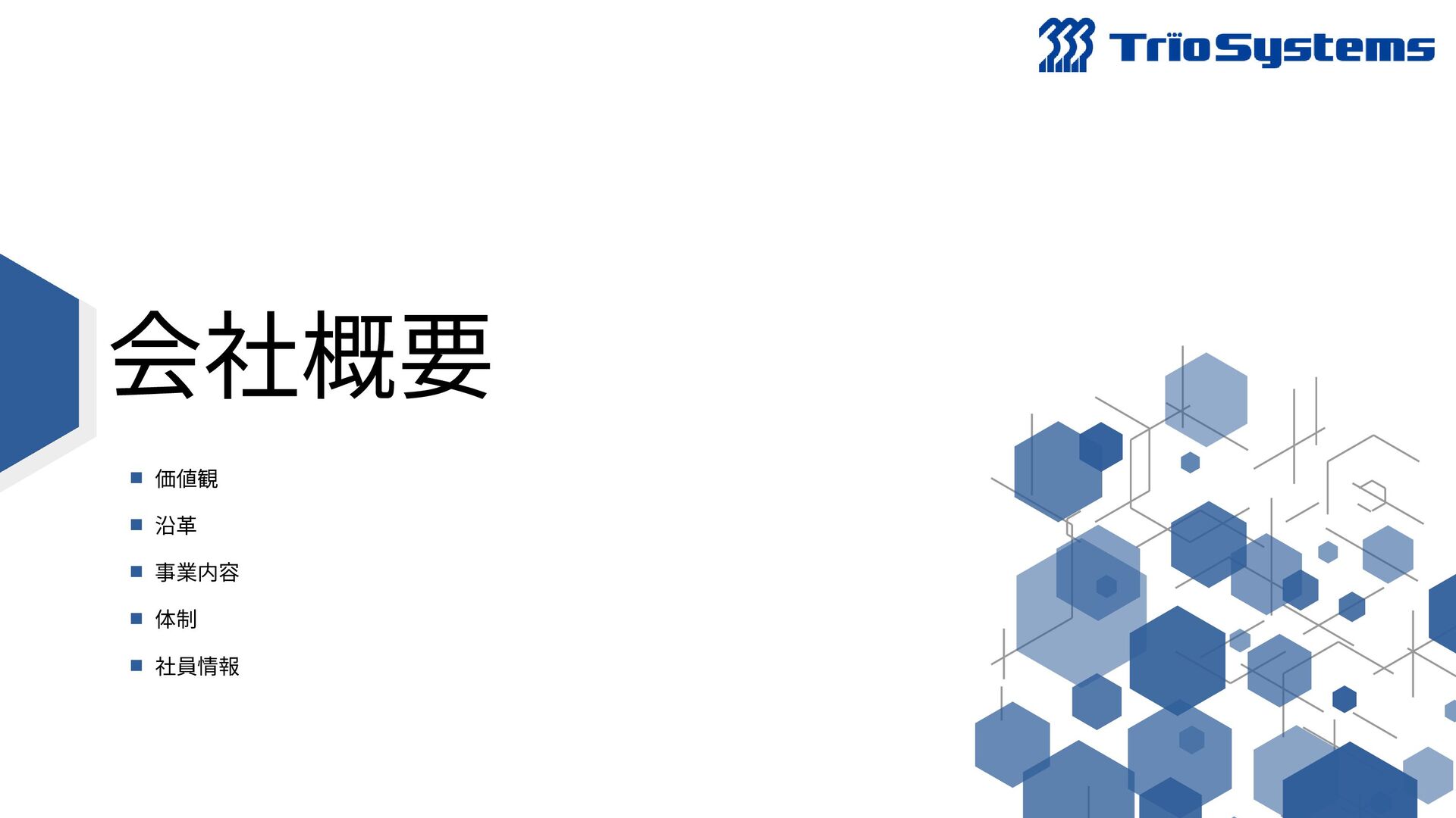 取締役 木村 勲 従業員 133 名 (2024 年1 月時点) 本社所在位置 東京都千代田区神田神保町1-13 CONVEX 神保町 7F ・8F 売上 2023 年12 月期:24.4 億円 2022 年12 月期:21.2 億 2021 年12 月期:13.1 億 2020 年12 月期:8.0 億 海外パートナー 会社 • 済南特利欧信息科技有限公司 設立:2015 年12 月、所在地:中国山東省 • 済南特利欧信息科技有限公司杭州分公司 設立:2018 年11 月、所在地:中国浙江省 会社情報 https://triosys.co.jp/index