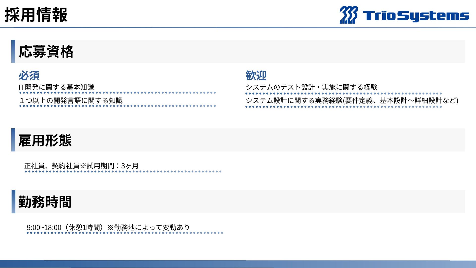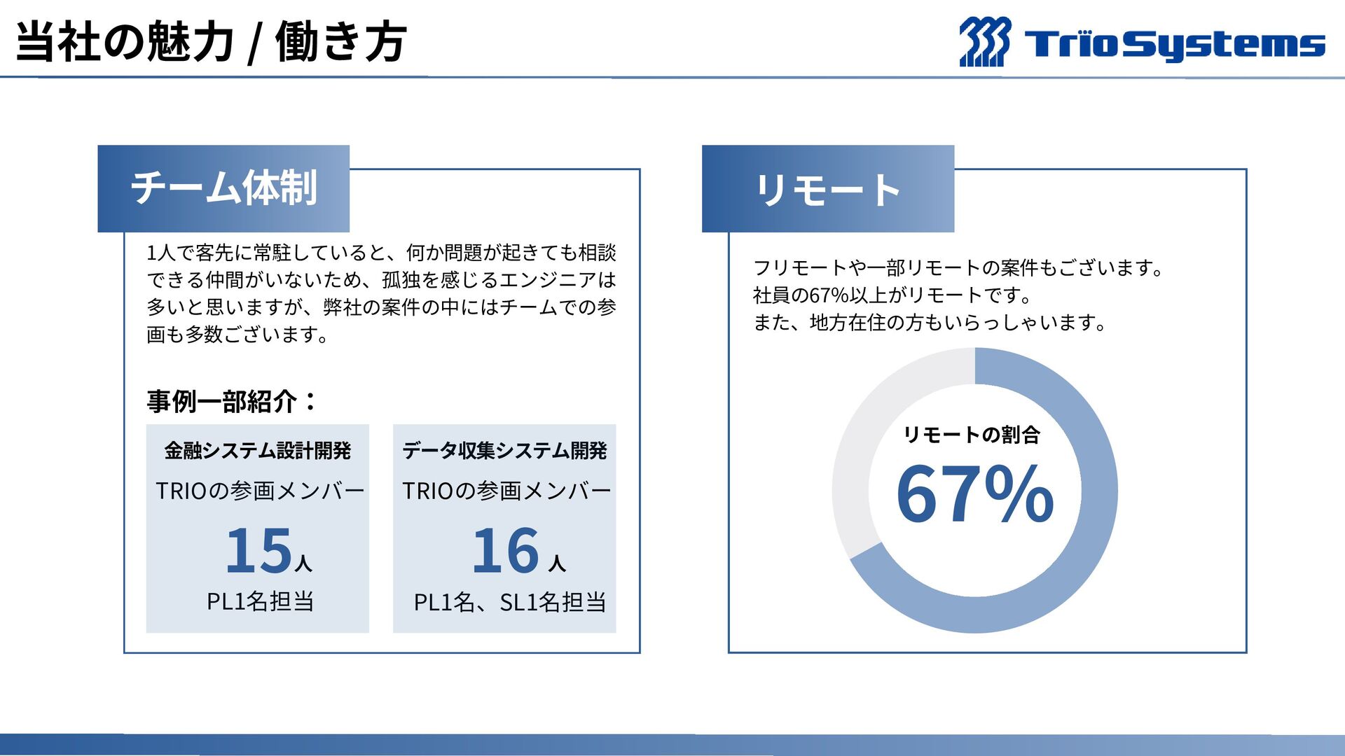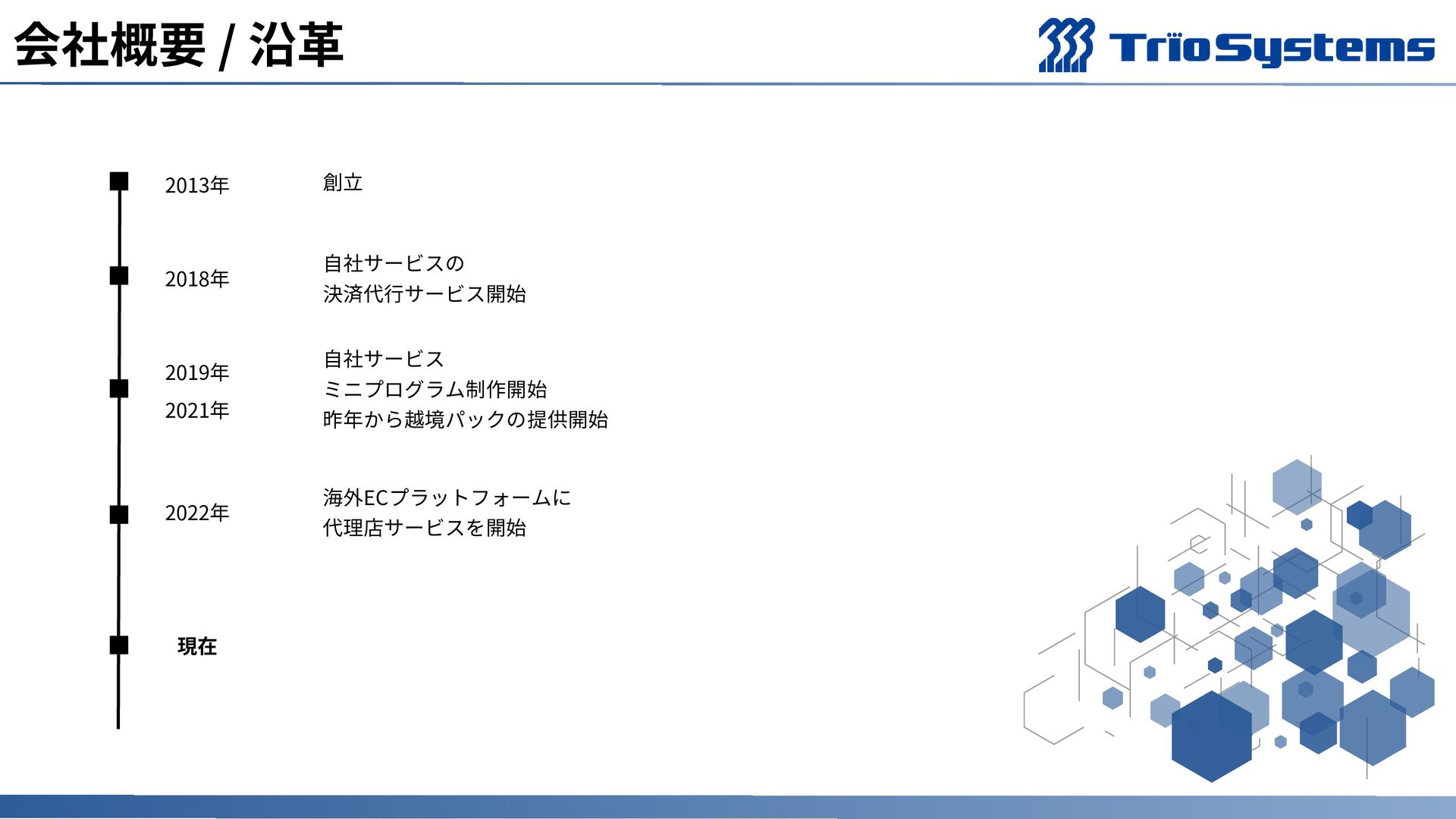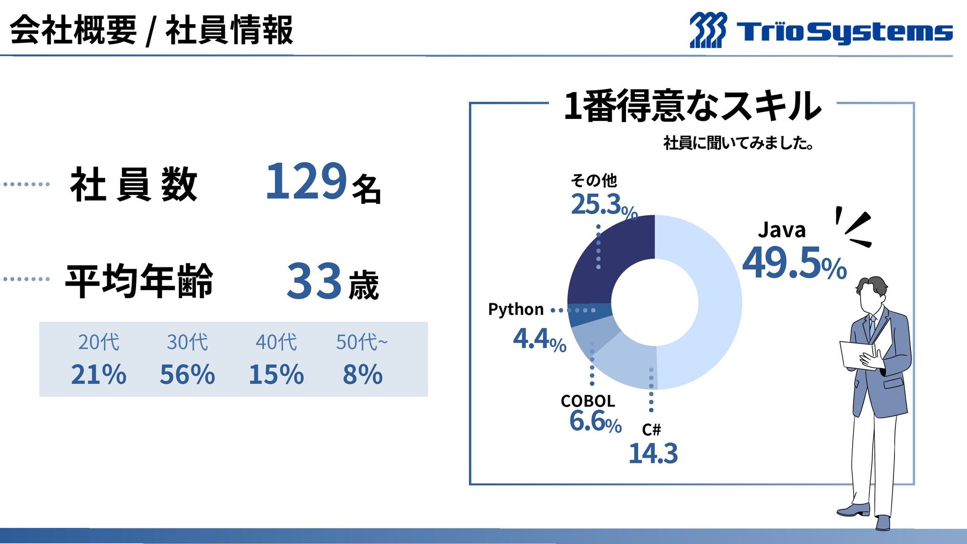 取締役 木村 勲 従業員 133 名 (2024 年1 月時点) 本社所在位置 東京都千代田区神田神保町1-13 CONVEX 神保町 7F ・8F 売上 2023 年12 月期:24.4 億円 2022 年12 月期:21.2 億 2021 年12 月期:13.1 億 2020 年12 月期:8.0 億 海外パートナー 会社 • 済南特利欧信息科技有限公司 設立:2015 年12 月、所在地:中国山東省 • 済南特利欧信息科技有限公司杭州分公司 設立:2018 年11 月、所在地:中国浙江省 会社情報 https://triosys.co.jp/index