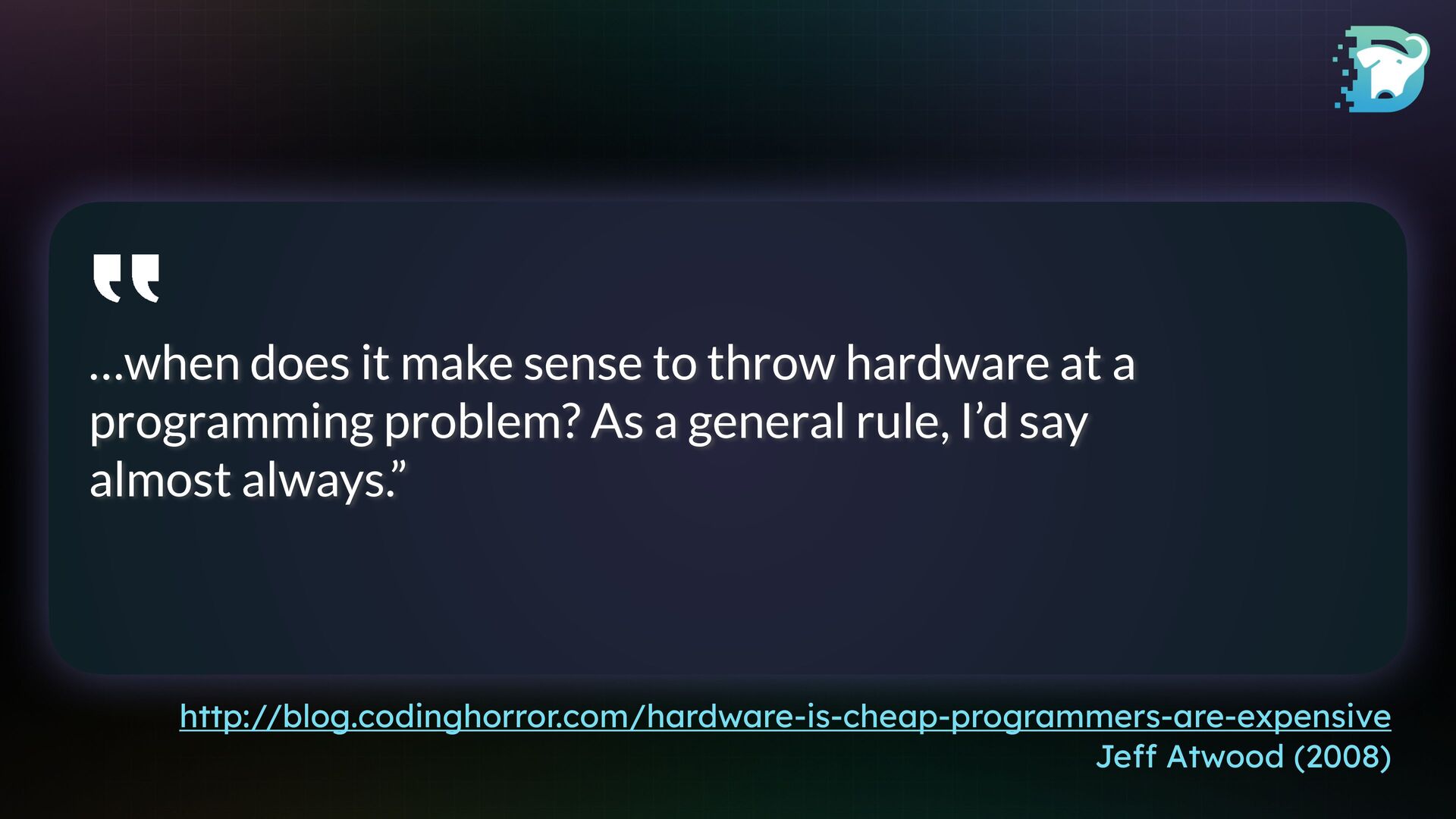 programming problem? As a general rule, I’d say almost always.” http://blog.codinghorror.com/hardware-is-cheap-programmers-are-expensive Jeff Atwood (2008)