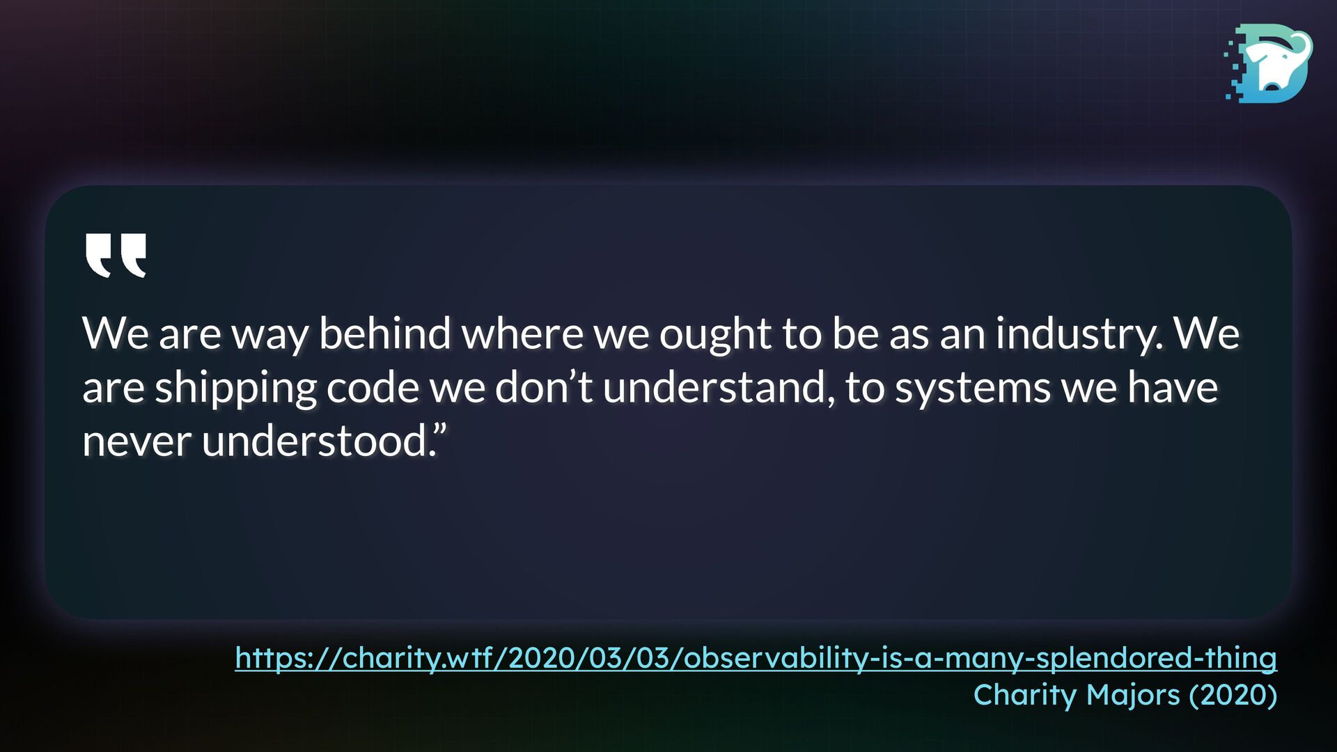 an industry. We are shipping code we don’t understand, to systems we have never understood.” https://charity.wtf/2020/03/03/observability-is-a-many-splendored-thing Charity Majors (2020)