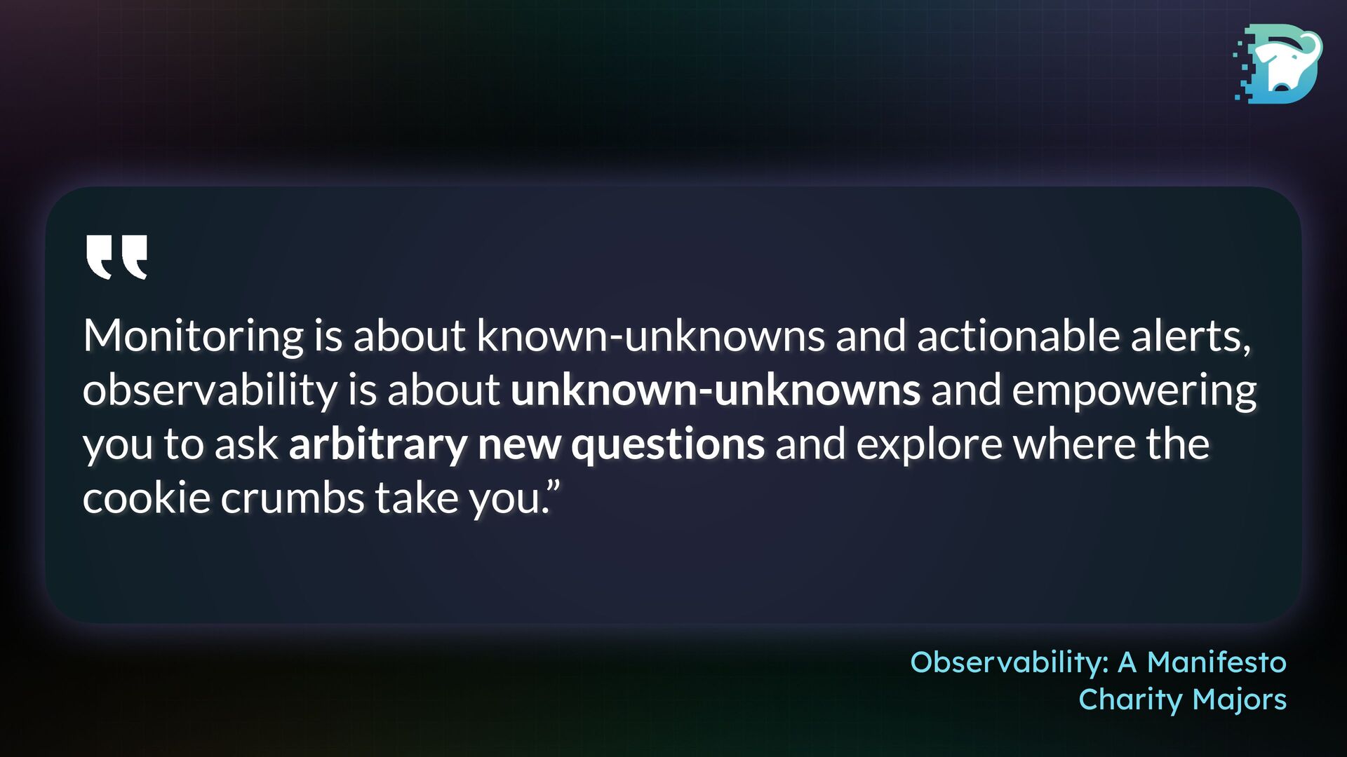 unknown-unknowns and empowering you to ask arbitrary new questions and explore where the cookie crumbs take you.” Observability: A Manifesto Charity Majors