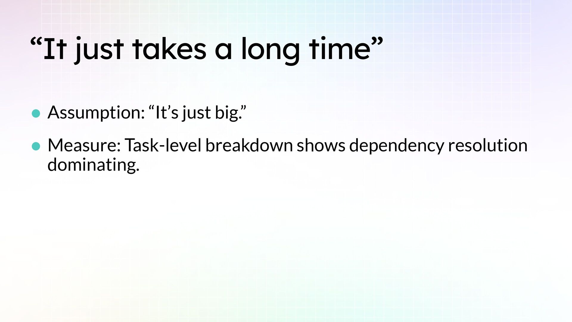 big.” • Measure: Task-level breakdown shows dependency resolution dominating.