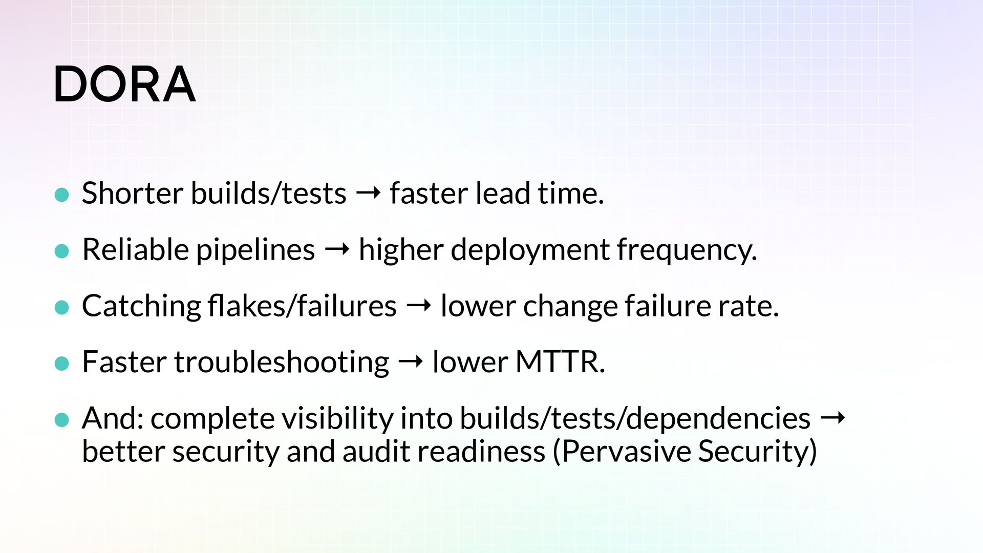 pipelines → higher deployment frequency. • Catching fl akes/failures → lower change failure rate. • Faster troubleshooting → lower MTTR. • And: complete visibility into builds/tests/dependencies → better security and audit readiness (Pervasive Security)