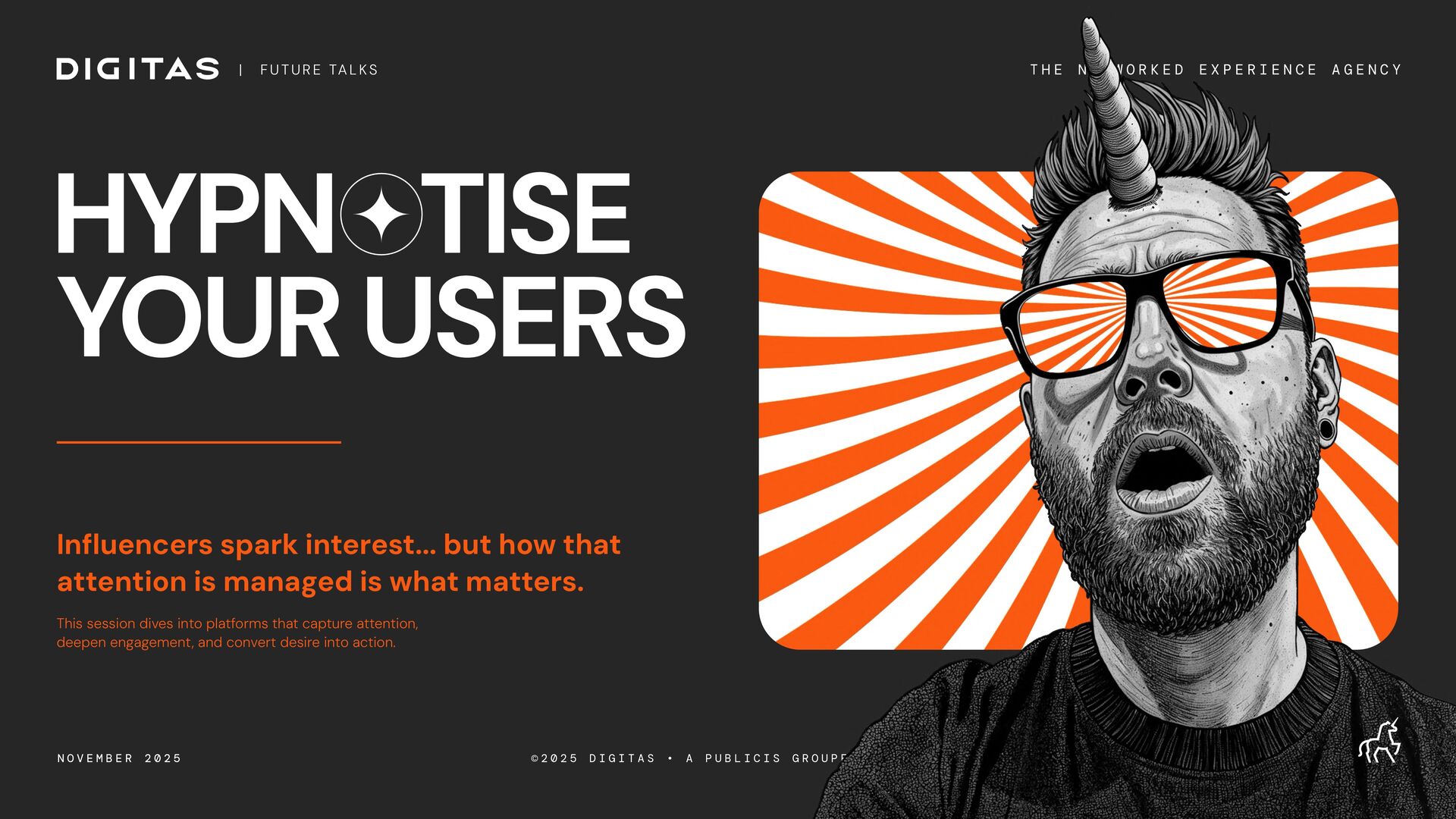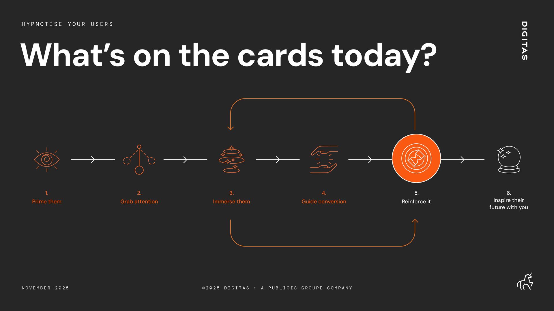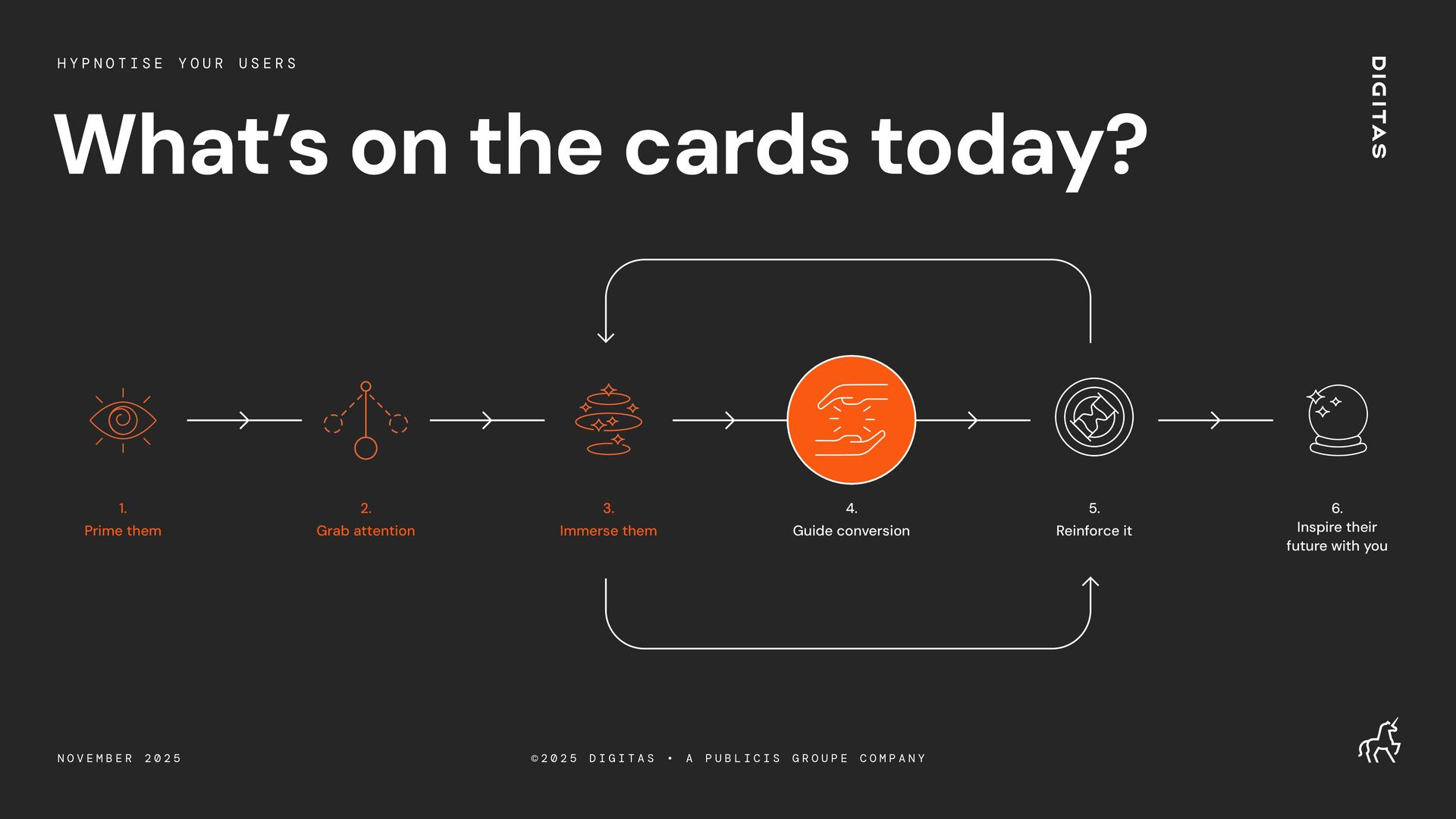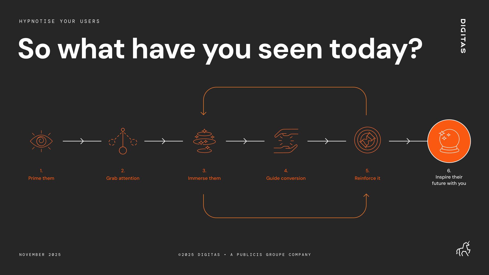Digitas Future Talks - Hypnotise Your Users is a masterclass on behavioural design, platform mechanics, and how digital experiences drive action. Presented by Tristan, Creative Tech Director at Digitas, this session breaks down the six-stage blueprint that moves a user from curiosity to conversion and ultimately into sustained loyalty.