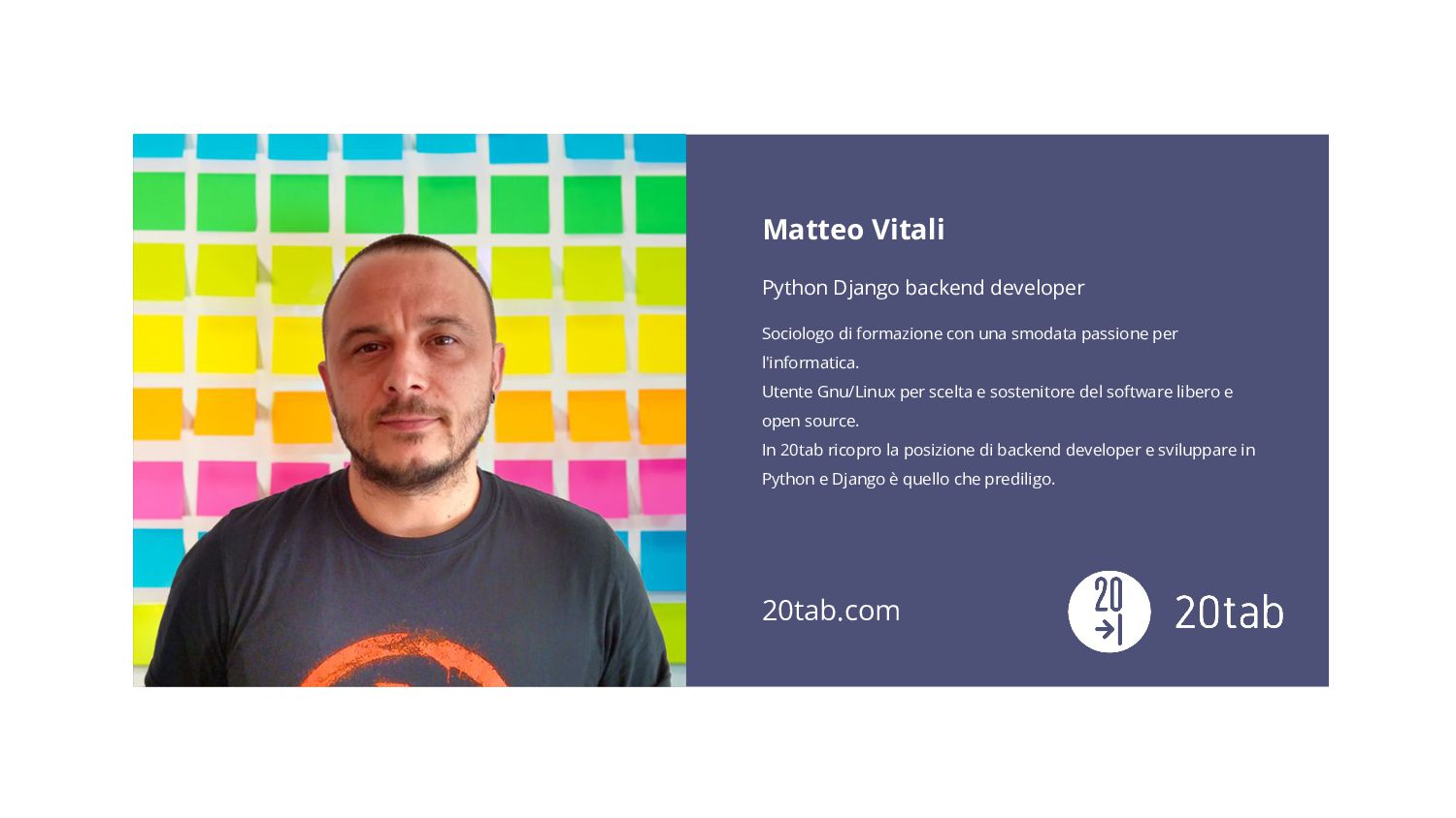 una smodata passione per l'informatica. Utente Gnu/Linux per scelta e sostenitore del software libero e open source. In 20tab ricopro la posizione di backend developer e sviluppare in Python e Django è quello che prediligo. 20tab.com