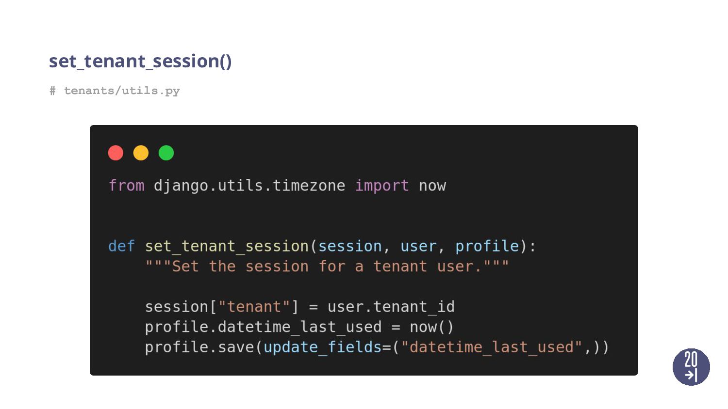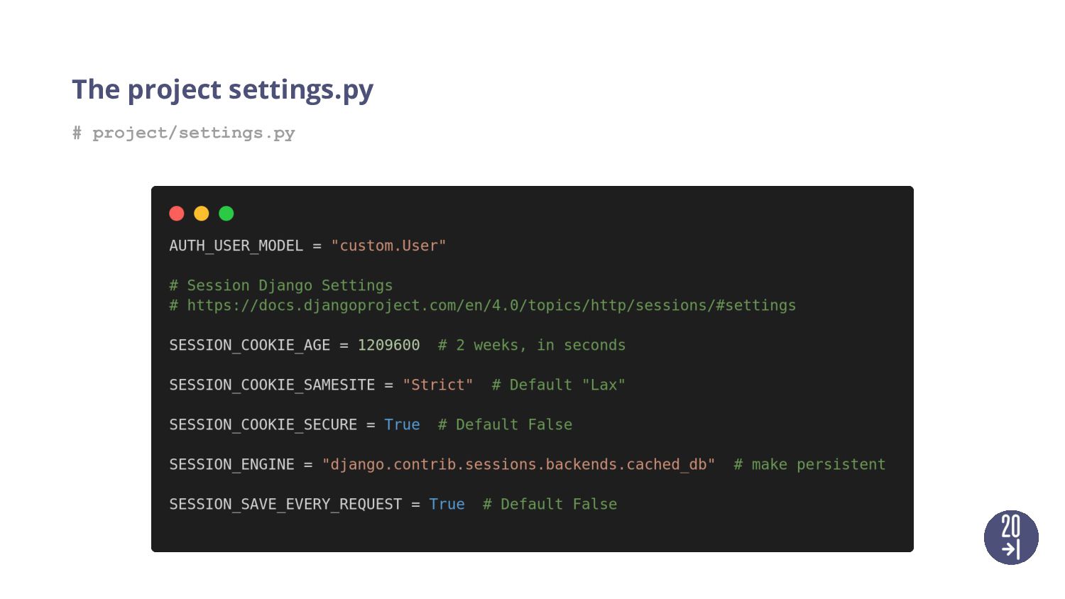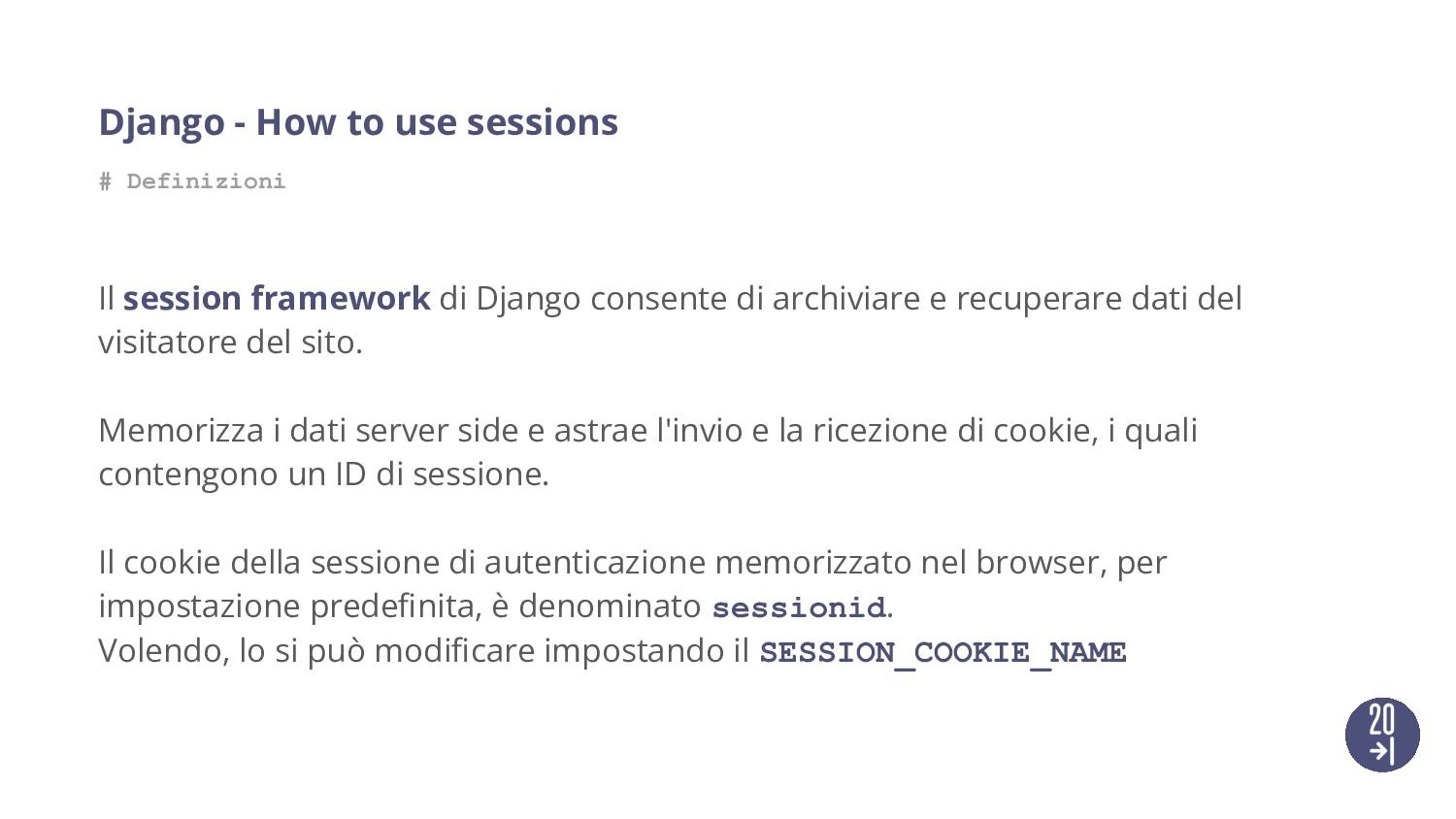 framework di Django consente di archiviare e recuperare dati del visitatore del sito. Memorizza i dati server side e astrae l'invio e la ricezione di cookie, i quali contengono un ID di sessione. Il cookie della sessione di autenticazione memorizzato nel browser, per impostazione predefinita, è denominato sessionid. Volendo, lo si può modificare impostando il SESSION_COOKIE_NAME