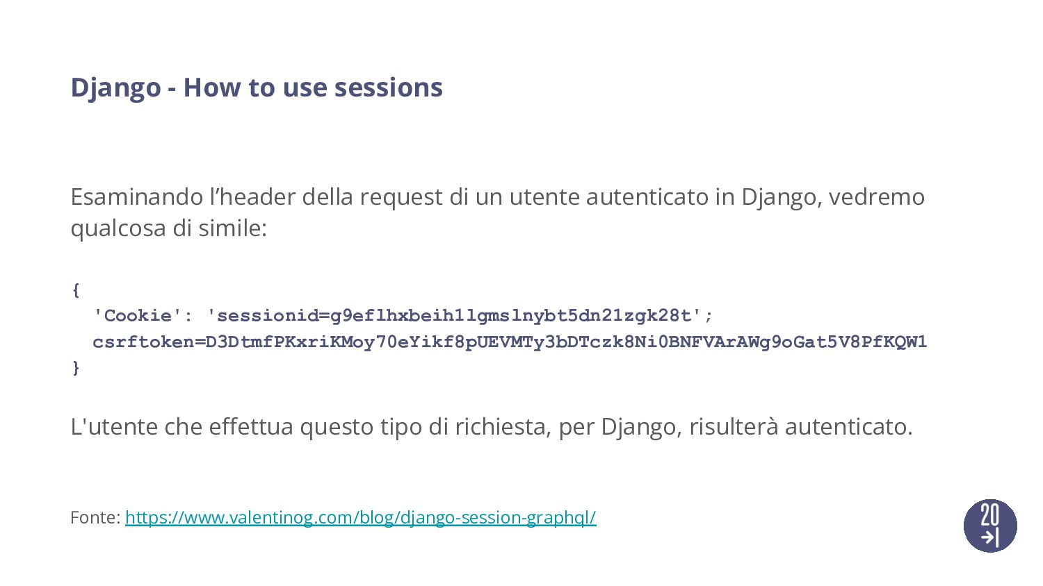 di un utente autenticato in Django, vedremo qualcosa di simile: { 'Cookie': 'sessionid=g9eflhxbeih1lgmslnybt5dn21zgk28t'; csrftoken=D3DtmfPKxriKMoy70eYikf8pUEVMTy3bDTczk8Ni0BNFVArAWg9oGat5V8PfKQW1 } L'utente che effettua questo tipo di richiesta, per Django, risulterà autenticato. Fonte: https://www.valentinog.com/blog/django-session-graphql/