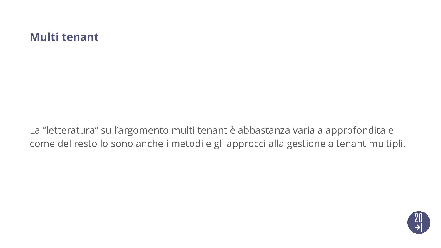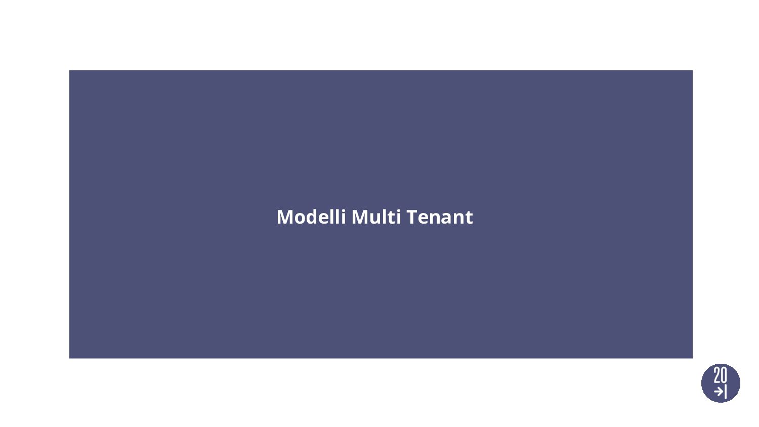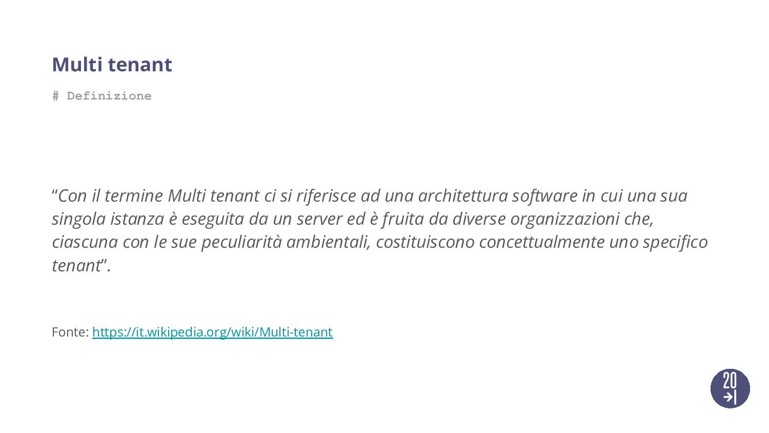 architettura software in cui una sua singola istanza è eseguita da un server ed è fruita da diverse organizzazioni che, ciascuna con le sue peculiarità ambientali, costituiscono concettualmente uno specifico tenant”. Fonte: https://it.wikipedia.org/wiki/Multi-tenant Multi tenant # Definizione