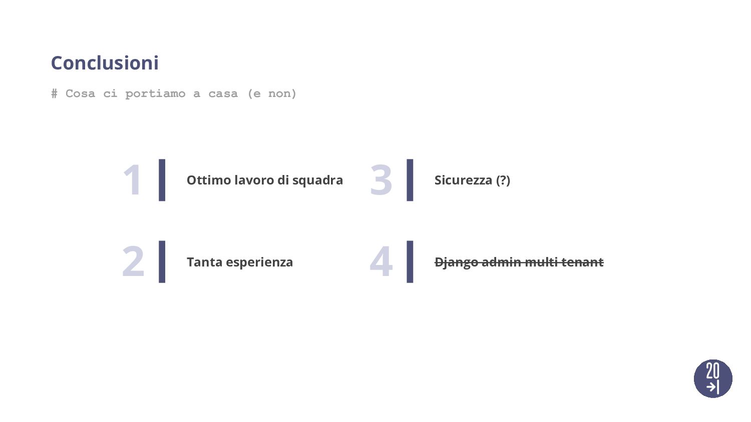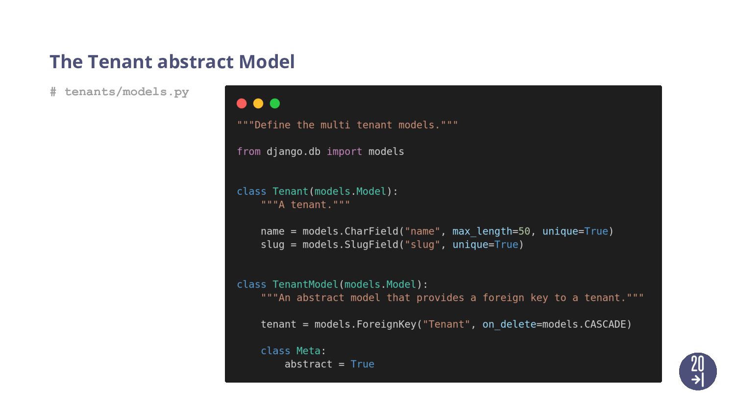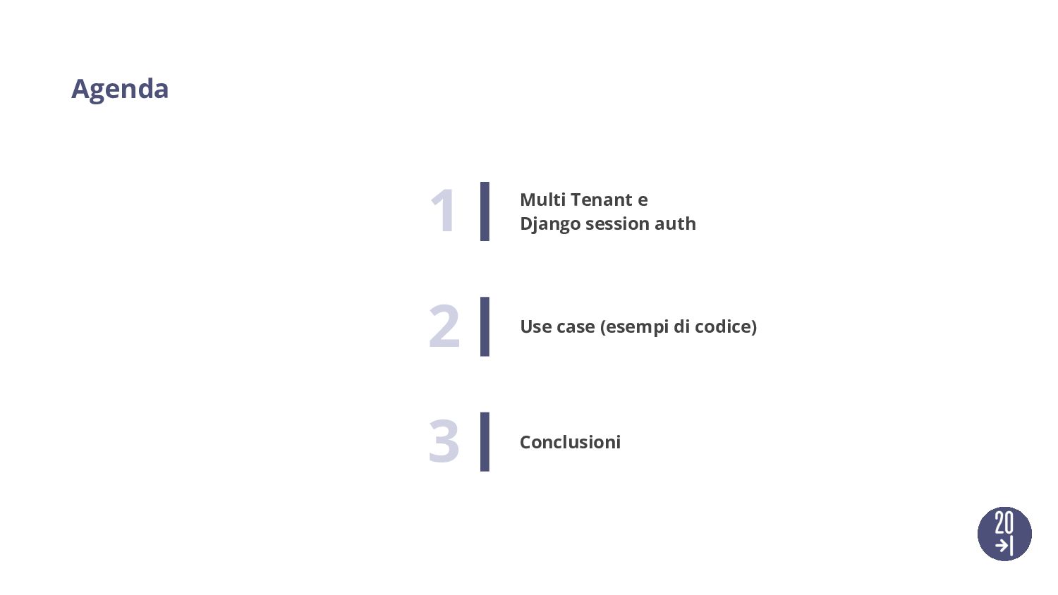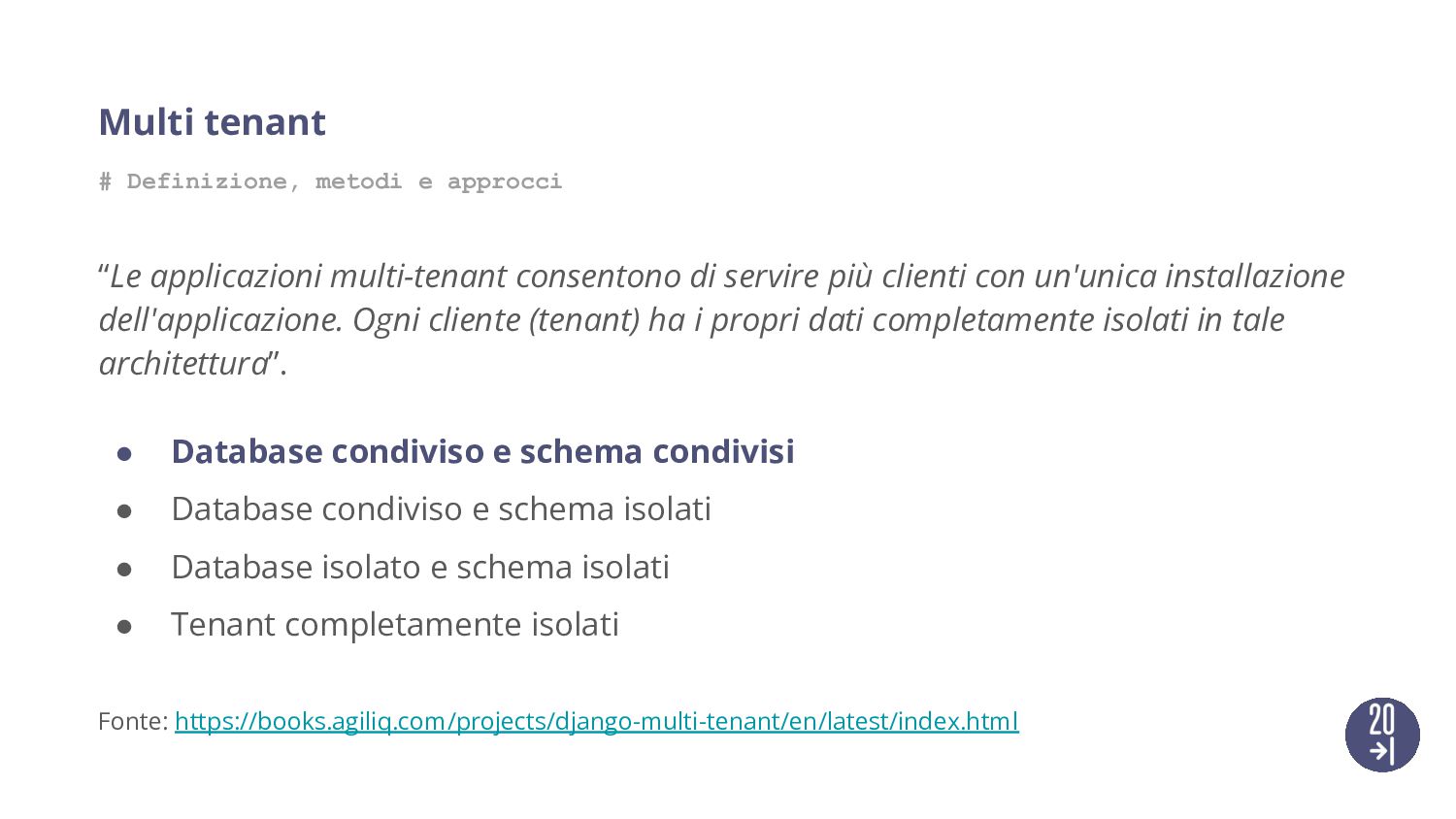 consentono di servire più clienti con un'unica installazione dell'applicazione. Ogni cliente (tenant) ha i propri dati completamente isolati in tale architettura”. • Database condiviso e schema condivisi • Database condiviso e schema isolati • Database isolato e schema isolati • Tenant completamente isolati Fonte: https://books.agiliq.com/projects/django-multi-tenant/en/latest/index.html