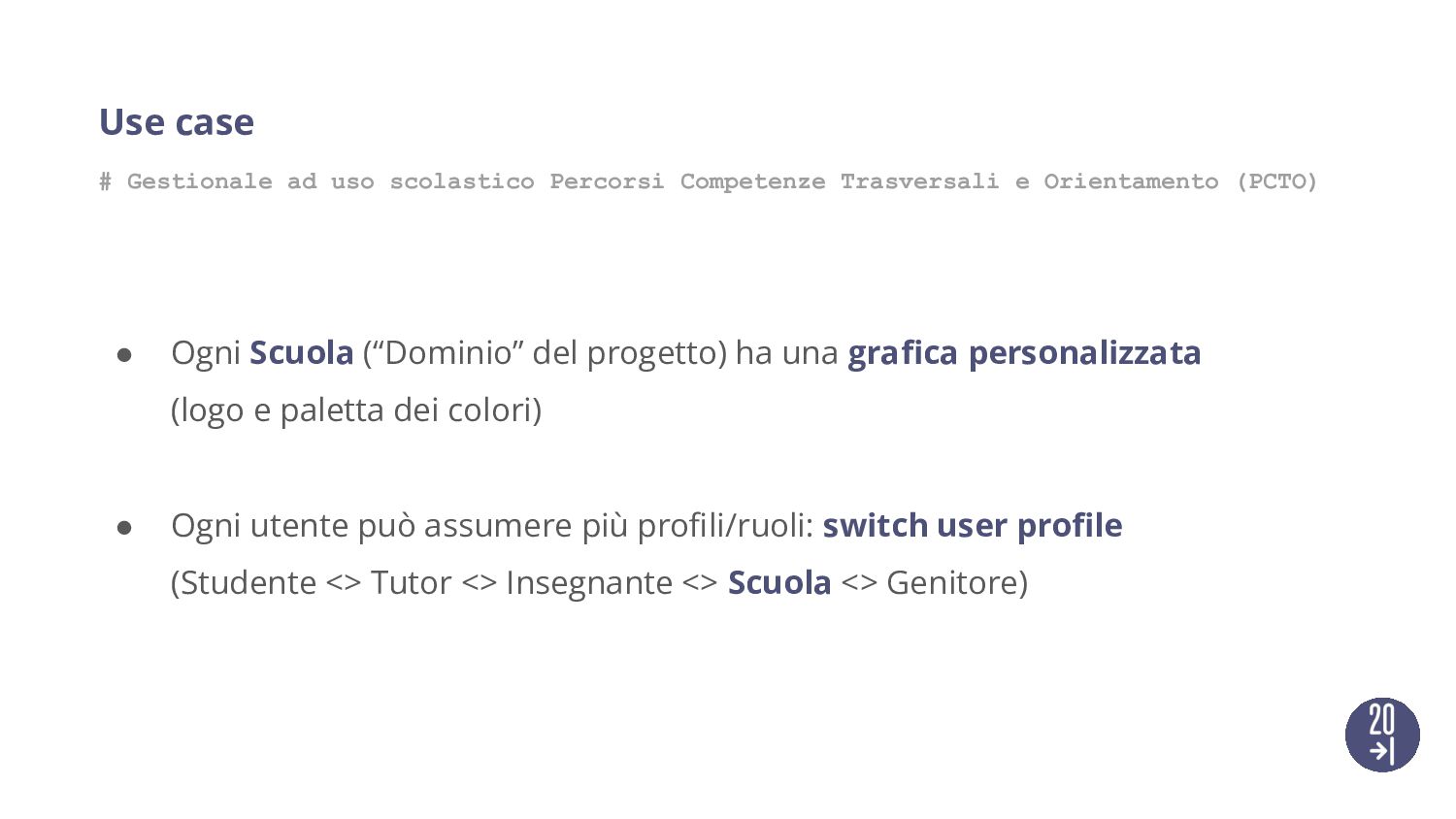 e Orientamento (PCTO) • Ogni Scuola (“Dominio” del progetto) ha una grafica personalizzata (logo e paletta dei colori) • Ogni utente può assumere più profili/ruoli: switch user profile (Studente <> Tutor <> Insegnante <> Scuola <> Genitore)
