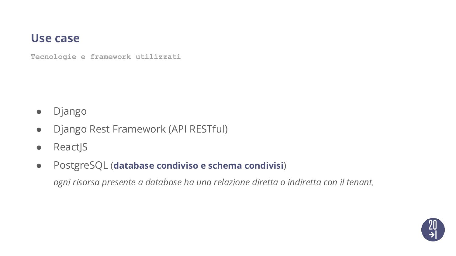 Rest Framework (API RESTful) • ReactJS • PostgreSQL (database condiviso e schema condivisi) ogni risorsa presente a database ha una relazione diretta o indiretta con il tenant.