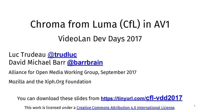 Luc Trudeau @trudluc David Michael Barr @barrbrain Alliance for Open Media Working Group, September 2017 Mozilla and the Xiph.Org Foundation You can download these slides from https://tinyurl.com/cfl-vdd2017 This work is licensed under a Creative Commons Attribution 4.0 International License. 1