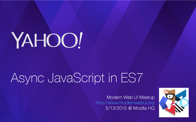 getValues() { yield 64; yield 68; return 71; } ▪ execution suspends @ yield ▪ values can be passed into a generator function* getValues() { var x = yield 64; var y = yield 2*x; return 3*y; } it.next(31); ▪ can iterate infinitely