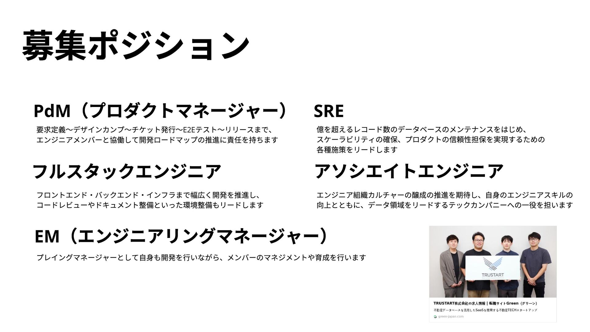 (FE ・BE ・PM1 名ずつ) ユーザーサイト 管理画面 Mizoguchi (PL ・PM ) インターン生2 名 業務委託エンジニア (メガベンチャー新卒) dev-warriors 謄本取得・所有者事項解析 Katanosaka (PL ・PM ) 業務委託エンジニア (画像解析専門2 名) 開発チーム 2024 年7 月から正社員中心の組織に変更し、スモール化 リリースまでのサイクルを高速にし、PMF するプロダクト開発を推進します Nagasaki (FE ・BE ) Nagayama (FE ・BE ) Goa (FE ・BE )