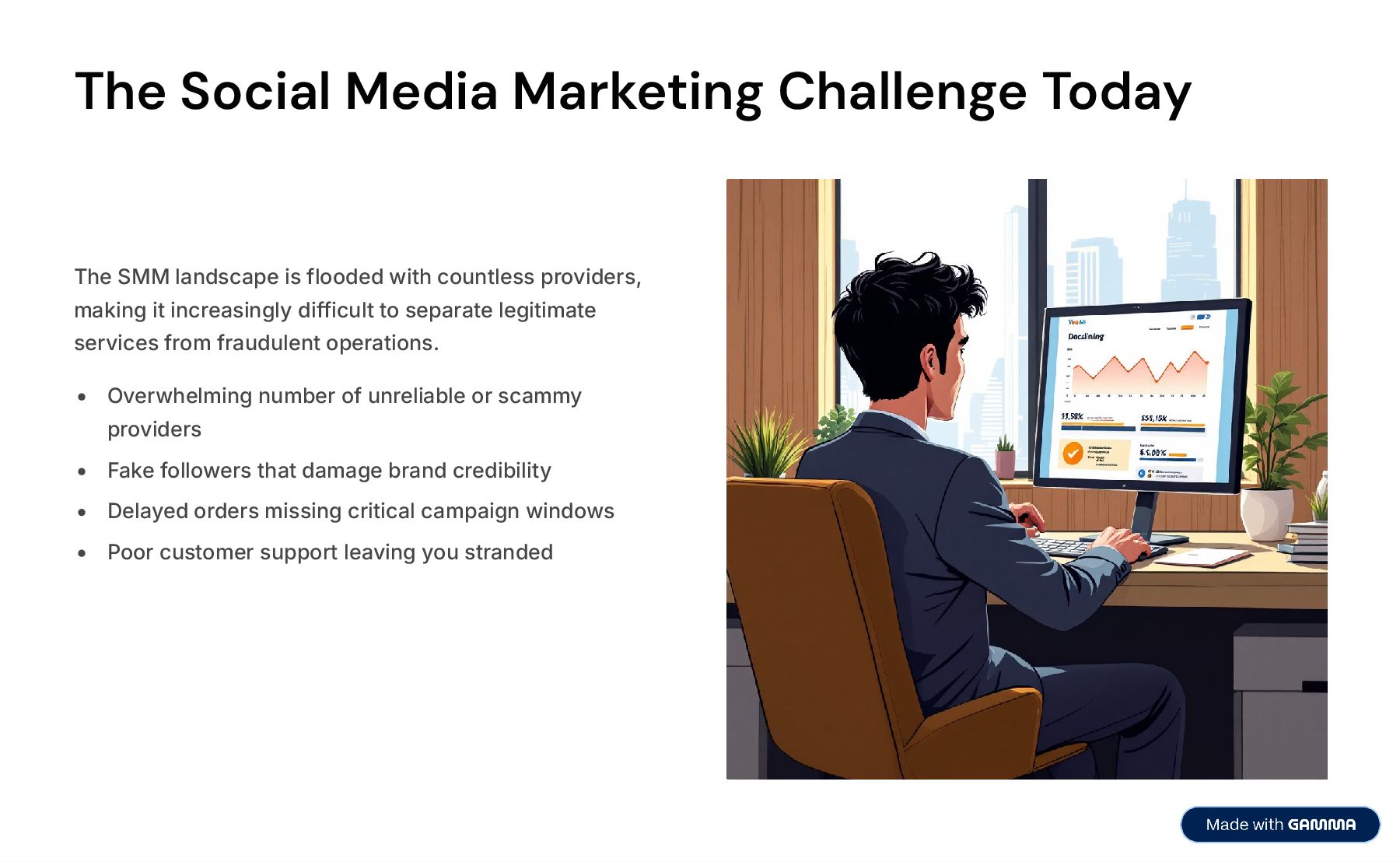 flooded with countless providers, making it increasingly difficult to separate legitimate services from fraudulent operations. Overwhelming number of unreliable or scammy providers Fake followers that damage brand credibility Delayed orders missing critical campaign windows Poor customer support leaving you stranded