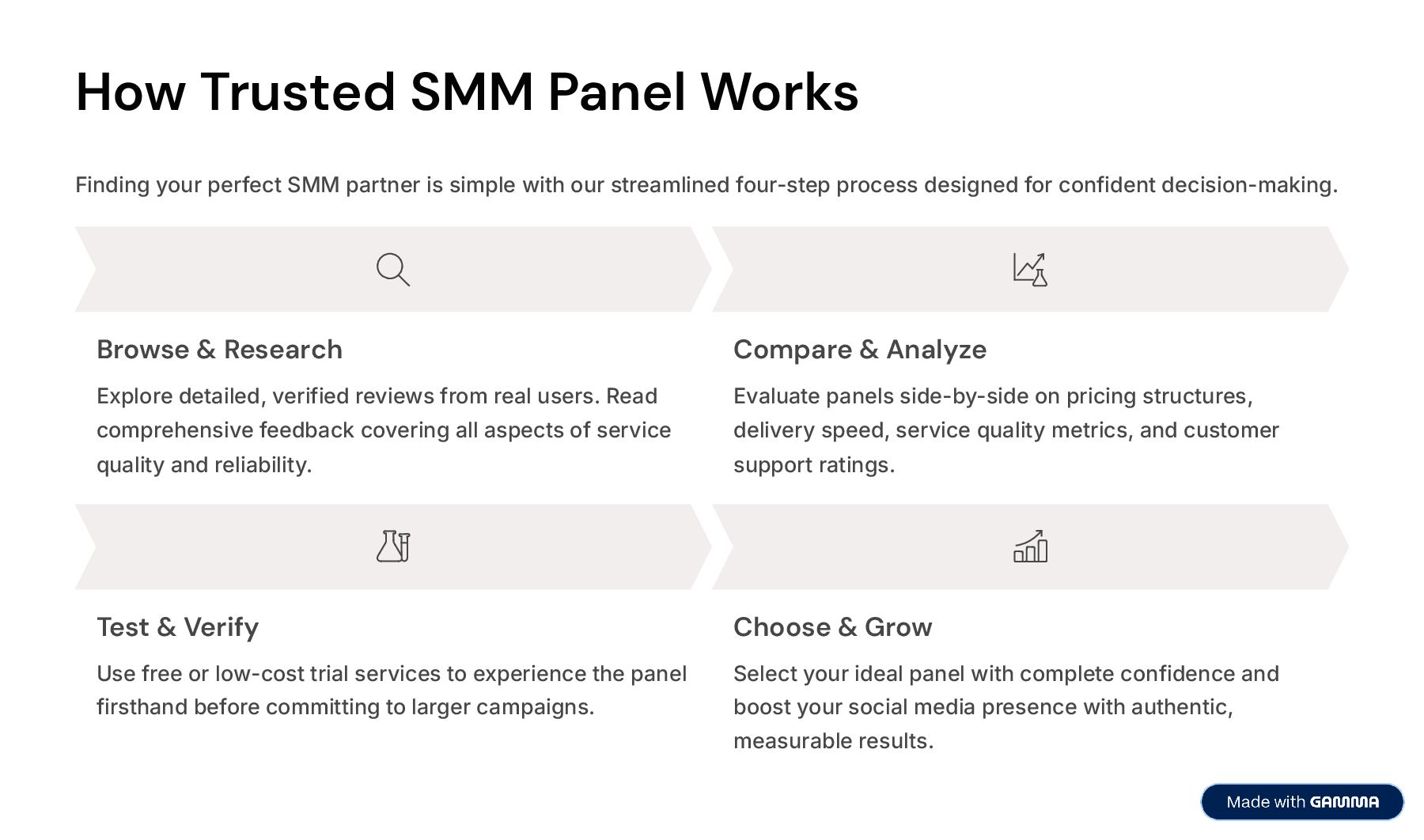 is simple with our streamlined four-step process designed for confident decision-making. Browse & Research Explore detailed, verified reviews from real users. Read comprehensive feedback covering all aspects of service quality and reliability. Compare & Analyze Evaluate panels side-by-side on pricing structures, delivery speed, service quality metrics, and customer support ratings. Test & Verify Use free or low-cost trial services to experience the panel firsthand before committing to larger campaigns. Choose & Grow Select your ideal panel with complete confidence and boost your social media presence with authentic, measurable results.