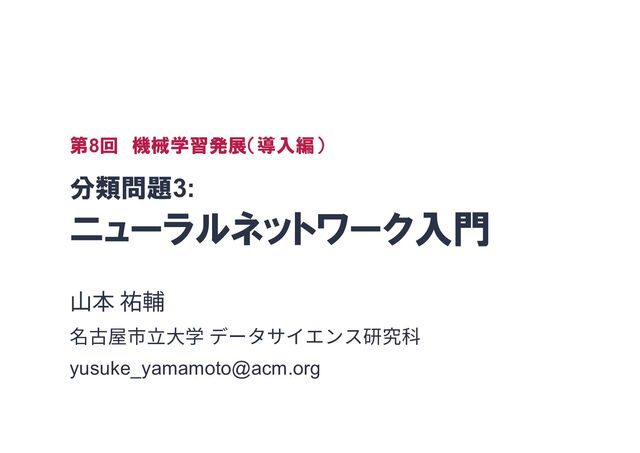 1 … xn … y1 2層⽬ (出⼒層) ⼊⼒層 𝑦! = 1 1 + exp(− ∑ $%! ) 𝑤 !$ (() 𝑧 $ (!) ) 分類問題なら出⼒層が最⼤となるクラスを選択 2クラス分類の場合 𝑧! (!) 𝑧$ (!) 𝑧% (!)