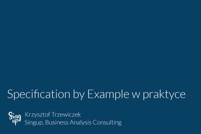 Specification by Example Writing Fake-world data Almost equal Quality feature Asteroids Communication Various artists Conversation token Hands-off business Process Iterative process Too many changes Automation for automation’s sake Traceability 30 praktycznych przykładów 11 wzorców specyfikacji 3 obszary zastosowania