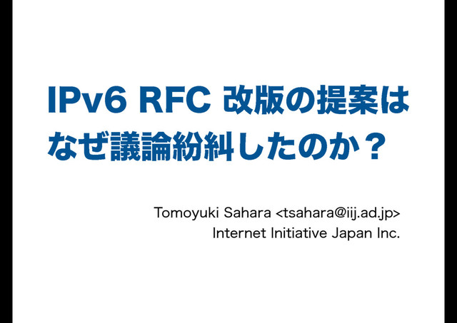JANOG 39.5 の LT 発表資料です。rfc2460bis, rfc4291bis, rfc1981bis の IETF Last Call がなぜ議論紛糾したのか、論点をかんたんにまとめました。