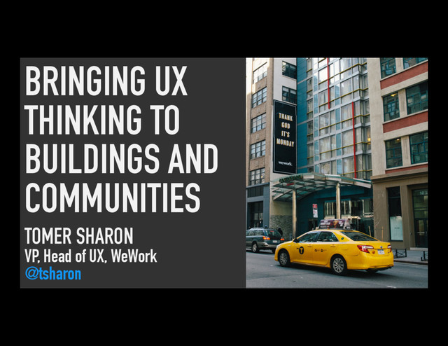 WeWork is a fast growing startup with a mission to create a world where people work to make a life, not just a living. WeWork offers its members a beautiful shared workspace, a lively community of creators to connect with, technology and services. Tomer Sharon, WeWork's Head of UX, will describe his undercover work at WeWork, the WeWork user journeys, and a recent project that combined an integration of physical space, digital product, and service design.