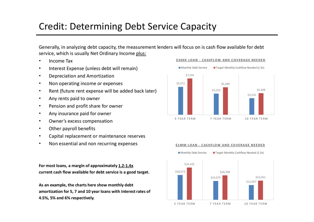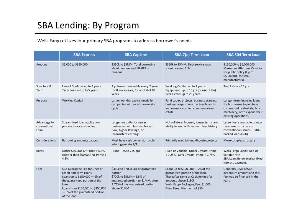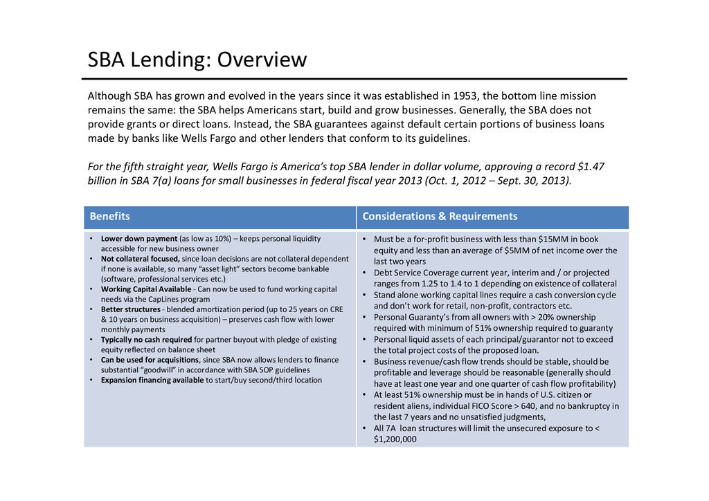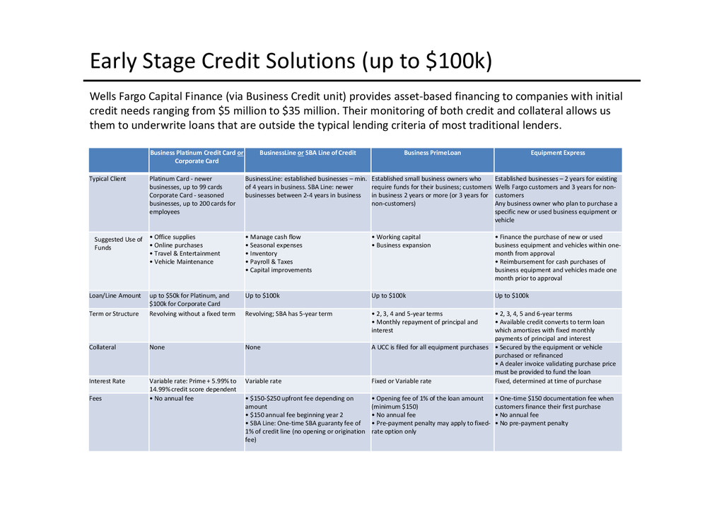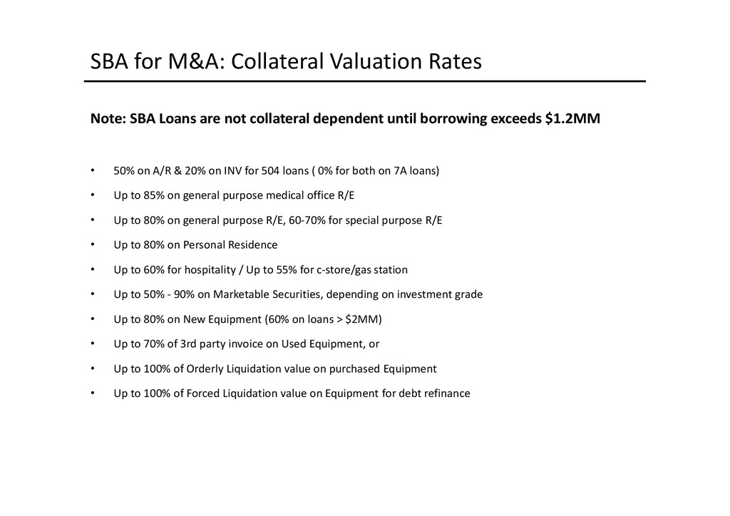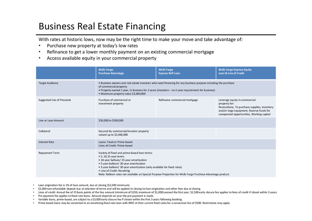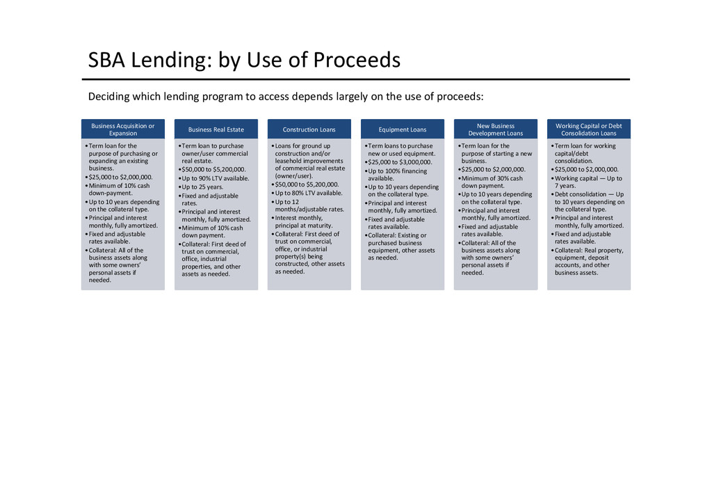 to access depends largely on the use of proceeds: Business Acquisition or Expansion •Term loan for the purpose of purchasing or expanding an existing business. •$25,000 to $2,000,000. •Minimum of 10% cash down-payment. •Up to 10 years depending on the collateral type. •Principal and interest monthly, fully amortized. •Fixed and adjustable rates available. •Collateral: All of the business assets along with some owners’ personal assets if needed. Business Real Estate •Term loan to purchase owner/user commercial real estate. •$50,000 to $5,200,000. •Up to 90% LTV available. •Up to 25 years. •Fixed and adjustable rates. •Principal and interest monthly, fully amortized. •Minimum of 10% cash down payment. •Collateral: First deed of trust on commercial, office, industrial properties, and other assets as needed. Construction Loans •Loans for ground up construction and/or leasehold improvements of commercial real estate (owner/user). •$50,000 to $5,200,000. •Up to 80% LTV available. •Up to 12 months/adjustable rates. •Interest monthly, principal at maturity. •Collateral: First deed of trust on commercial, office, or industrial property(s) being constructed, other assets as needed. Equipment Loans •Term loans to purchase new or used equipment. •$25,000 to $3,000,000. •Up to 100% financing available. •Up to 10 years depending on the collateral type. •Principal and interest monthly, fully amortized. •Fixed and adjustable rates available. •Collateral: Existing or purchased business equipment, other assets as needed. New Business Development Loans •Term loan for the purpose of starting a new business. •$25,000 to $2,000,000. •Minimum of 30% cash down payment. •Up to 10 years depending on the collateral type. •Principal and interest monthly, fully amortized. •Fixed and adjustable rates available. •Collateral: All of the business assets along with some owners’ personal assets if needed. Working Capital or Debt Consolidation Loans •Term loan for working capital/debt consolidation. •$25,000 to $2,000,000. •Working capital — Up to 7 years. •Debt consolidation — Up to 10 years depending on the collateral type. •Principal and interest monthly, fully amortized. •Fixed and adjustable rates available. •Collateral: Real property, equipment, deposit accounts, and other business assets.