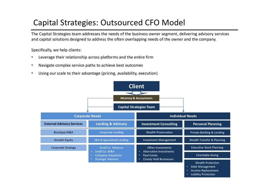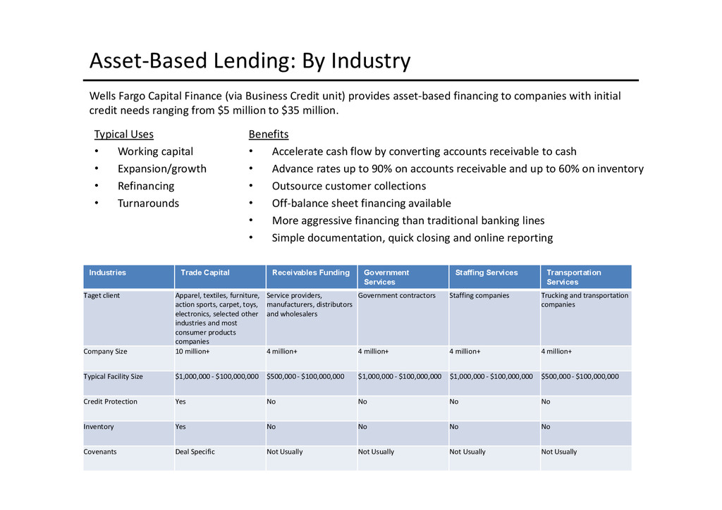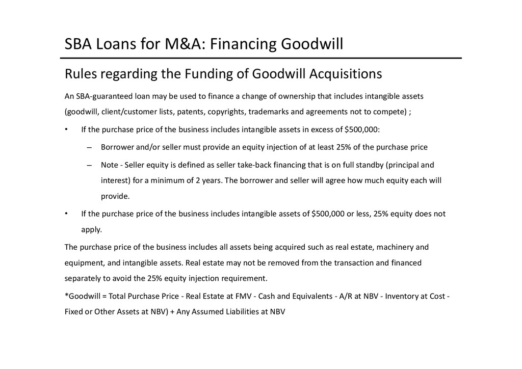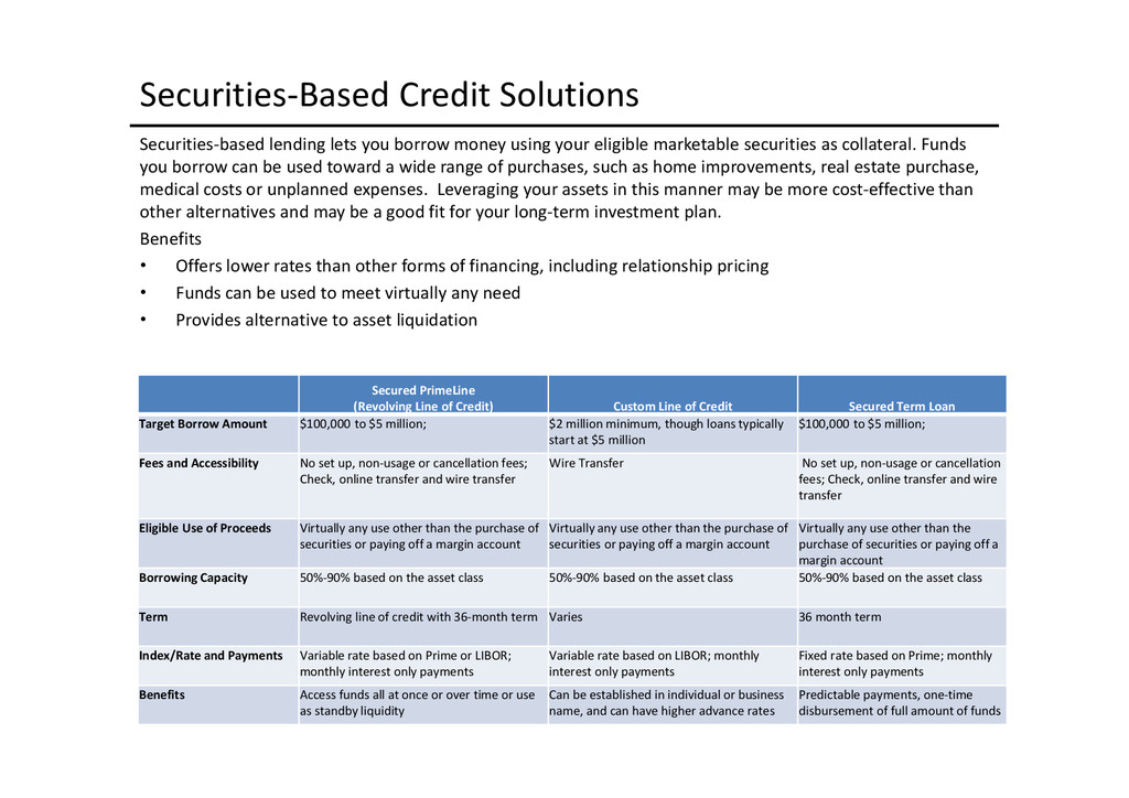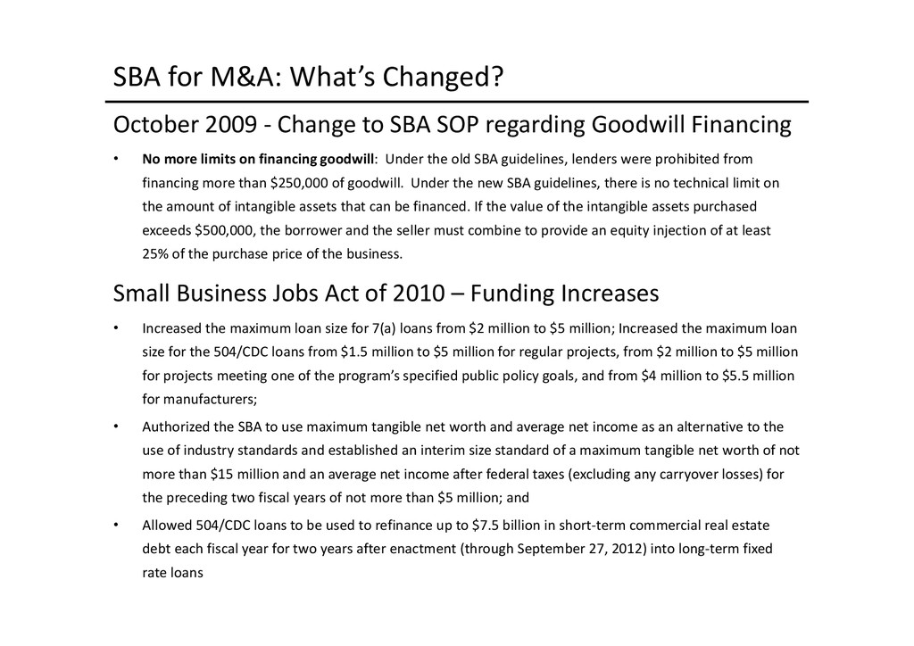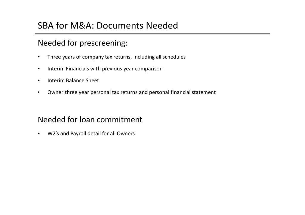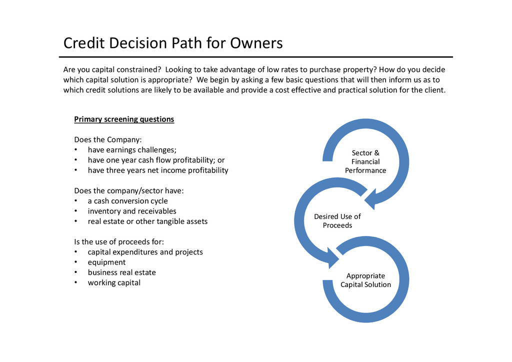 to access depends largely on the use of proceeds: Business Acquisition or Expansion •Term loan for the purpose of purchasing or expanding an existing business. •$25,000 to $2,000,000. •Minimum of 10% cash down-payment. •Up to 10 years depending on the collateral type. •Principal and interest monthly, fully amortized. •Fixed and adjustable rates available. •Collateral: All of the business assets along with some owners’ personal assets if needed. Business Real Estate •Term loan to purchase owner/user commercial real estate. •$50,000 to $5,200,000. •Up to 90% LTV available. •Up to 25 years. •Fixed and adjustable rates. •Principal and interest monthly, fully amortized. •Minimum of 10% cash down payment. •Collateral: First deed of trust on commercial, office, industrial properties, and other assets as needed. Construction Loans •Loans for ground up construction and/or leasehold improvements of commercial real estate (owner/user). •$50,000 to $5,200,000. •Up to 80% LTV available. •Up to 12 months/adjustable rates. •Interest monthly, principal at maturity. •Collateral: First deed of trust on commercial, office, or industrial property(s) being constructed, other assets as needed. Equipment Loans •Term loans to purchase new or used equipment. •$25,000 to $3,000,000. •Up to 100% financing available. •Up to 10 years depending on the collateral type. •Principal and interest monthly, fully amortized. •Fixed and adjustable rates available. •Collateral: Existing or purchased business equipment, other assets as needed. New Business Development Loans •Term loan for the purpose of starting a new business. •$25,000 to $2,000,000. •Minimum of 30% cash down payment. •Up to 10 years depending on the collateral type. •Principal and interest monthly, fully amortized. •Fixed and adjustable rates available. •Collateral: All of the business assets along with some owners’ personal assets if needed. Working Capital or Debt Consolidation Loans •Term loan for working capital/debt consolidation. •$25,000 to $2,000,000. •Working capital — Up to 7 years. •Debt consolidation — Up to 10 years depending on the collateral type. •Principal and interest monthly, fully amortized. •Fixed and adjustable rates available. •Collateral: Real property, equipment, deposit accounts, and other business assets.