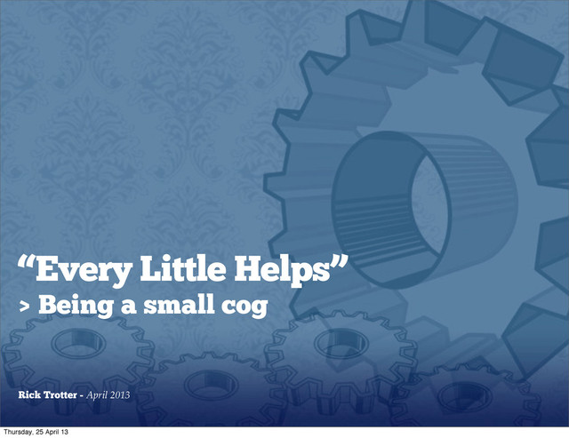 a big machine ✤ Small gears can push bigger gears which make a huge change ✤ Don’t overestimate your size. ✤ Don’t overestimate your abilities. Thursday, 25 April 13