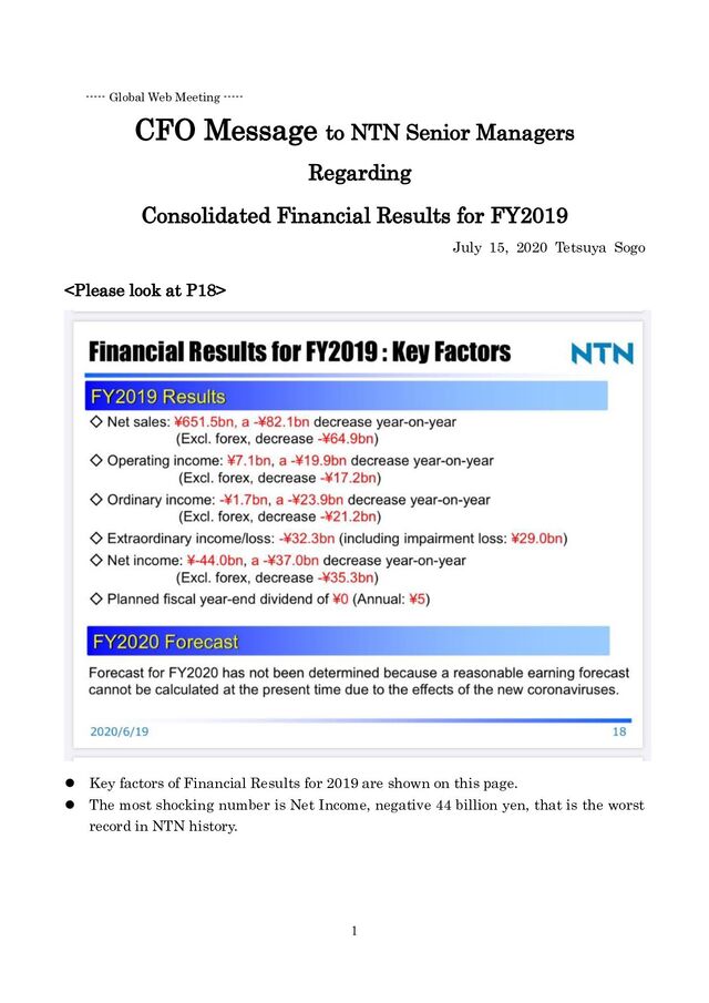 Senior Managers Regarding Consolidated Financial Results for FY2019 July 15, 2020 Tetsuya Sogo <Please look at P18> Key factors of Financial Results for 2019 are shown on this page. The most shocking number is Net Income, negative 44 billion yen, that is the worst record in NTN history.