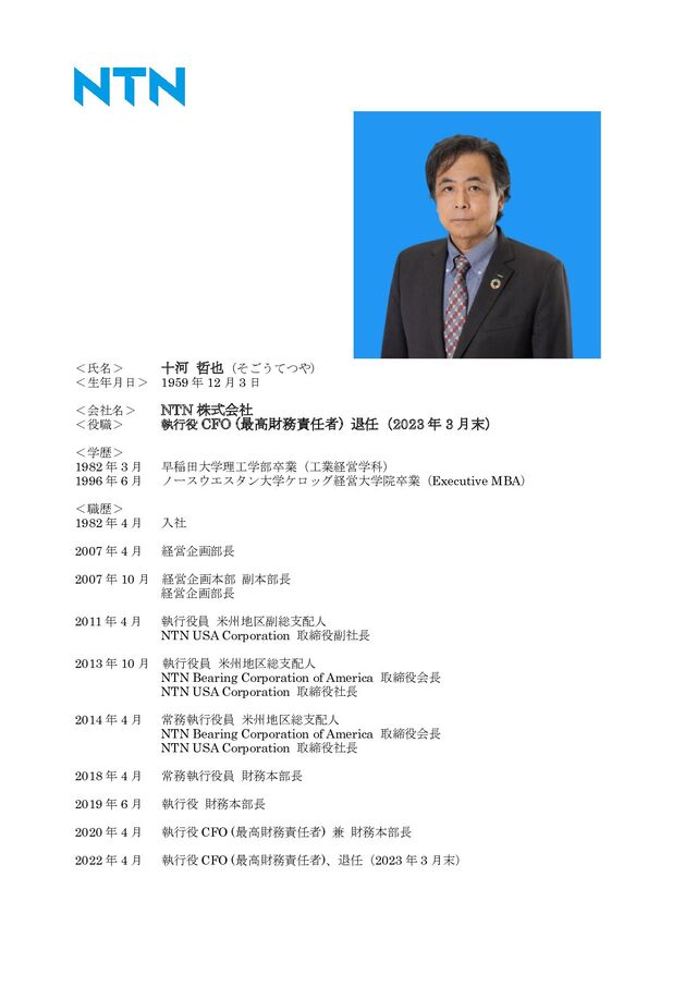 <会社名> NTN 株式会社 <役職> 執行役 CFO (最高財務責任者) 退任(2023 年 3 月末) <学歴> 1982 年 3 月 早稲田大学理工学部卒業(工業経営学科) 1996 年 6 月 ノースウエスタン大学ケロッグ経営大学院卒業(Executive MBA) <職歴> 1982 年 4 月 入社 2007 年 4 月 経営企画部長 2007 年 10 月 経営企画本部 副本部長 経営企画部長 2011 年 4 月 執行役員 米州地区副総支配人 NTN USA Corporation 取締役副社長 2013 年 10 月 執行役員 米州地区総支配人 NTN Bearing Corporation of America 取締役会長 NTN USA Corporation 取締役社長 2014 年 4 月 常務執行役員 米州地区総支配人 NTN Bearing Corporation of America 取締役会長 NTN USA Corporation 取締役社長 2018 年 4 月 常務執行役員 財務本部長 2019 年 6 月 執行役 財務本部長 2020 年 4 月 執行役 CFO (最高財務責任者) 兼 財務本部長 2022 年 4 月 執行役 CFO (最高財務責任者)、退任(2023 年 3 月末)