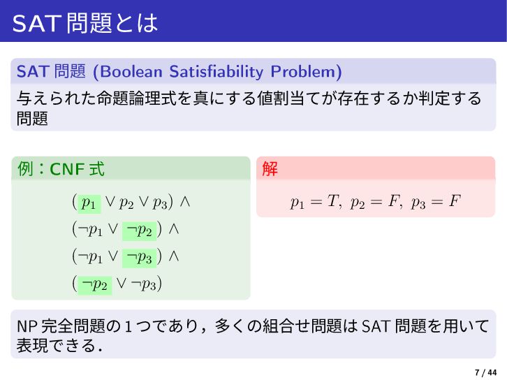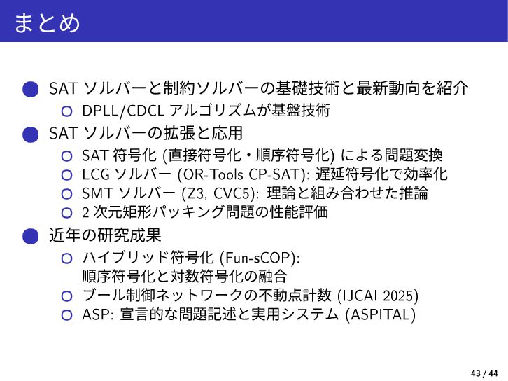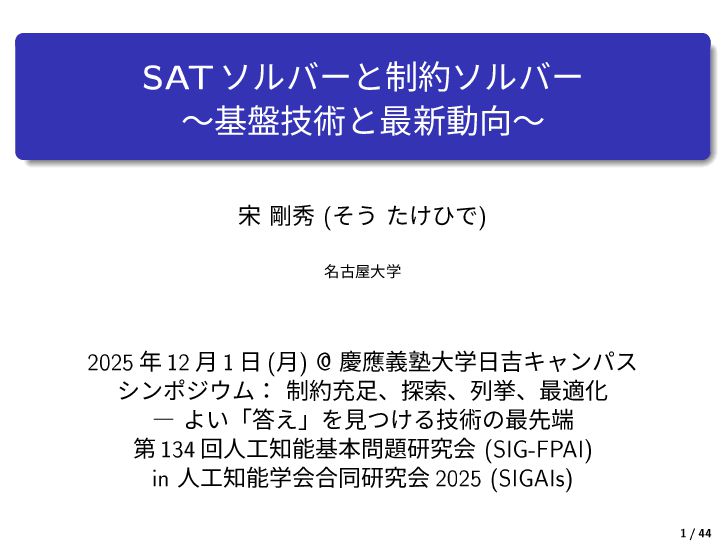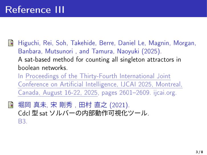 Morgan, Banbara, Mutsunori , and Tamura, Naoyuki (2025). A sat-based method for counting all singleton attractors in boolean networks. In Proceedings of the Thirty-Fourth International Joint Conference on Articial Intelligence, IJCAI 2025, Montreal, Canada, August 16-22, 2025, pages 26012609. ijcai.org. ງԬ ਅະ, ߶ल , ాଜ ೭ (2021). Cdcl ܕ sat ιϧόʔͷ෦ಈ࡞ՄࢹԽπʔϧ. B3. 3 / 8