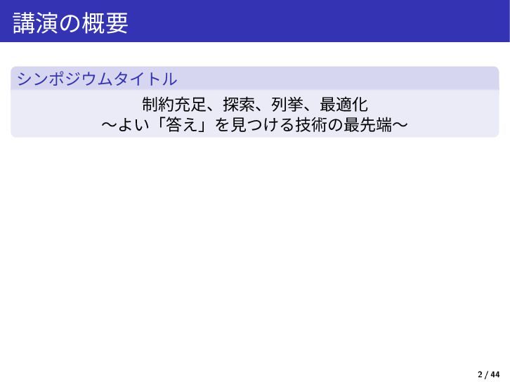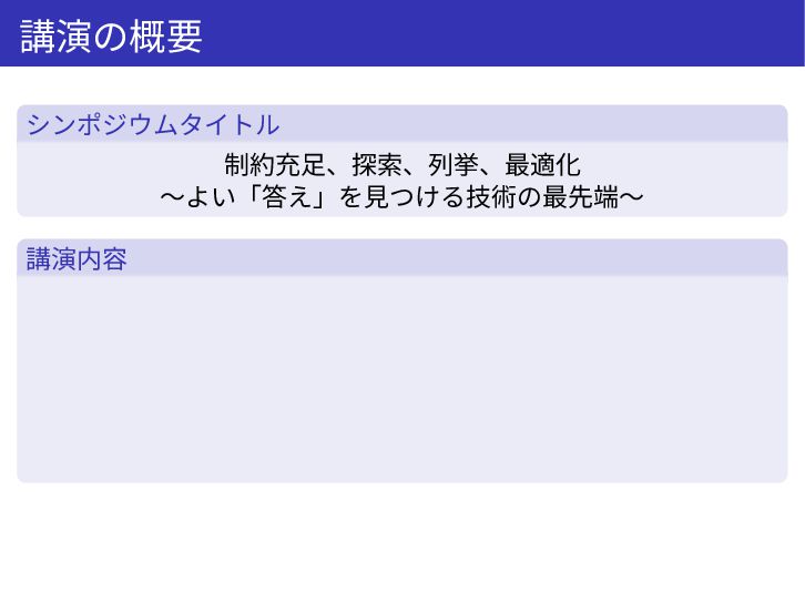 and CSP techniques. In Proceedings of the 11th International Joint Conference on Articial Intelligence (IJCAI 1989), pages 290296. Eén, Niklas and Sörensson, Niklas (2003). An extensible SAT-solver. In Proceedings of the 6th International Conference on Theory and Applications of Satisability Testing (SAT 2003), LNCS 2919, pages 502518. ುౡ ӳ, ؠপ ࣏ , Ҫ্ ࠀາ (2012). Glueminisat 2.2.5: ୯ҐൖΛଅֶ͢शઅͷੵۃత֫ಘઓུʹ جͮ͘ߴ SAT ιϧόʔ. ίϯϐϡʔλιϑτΣΞ, 29(4):211230. 2 / 8