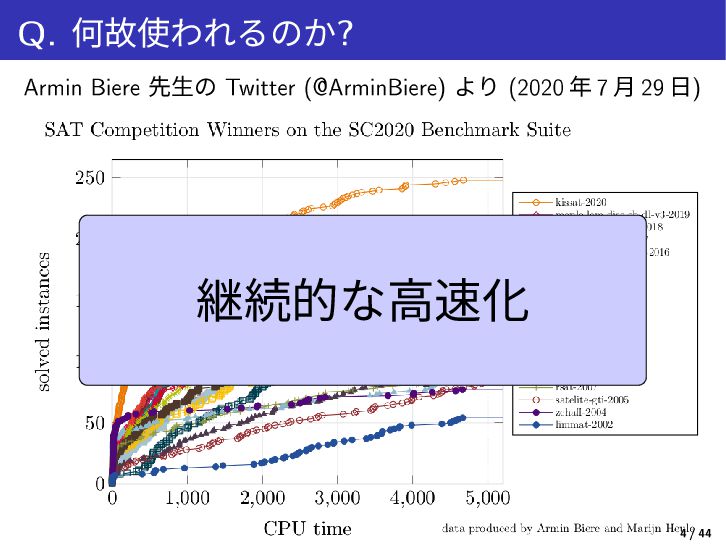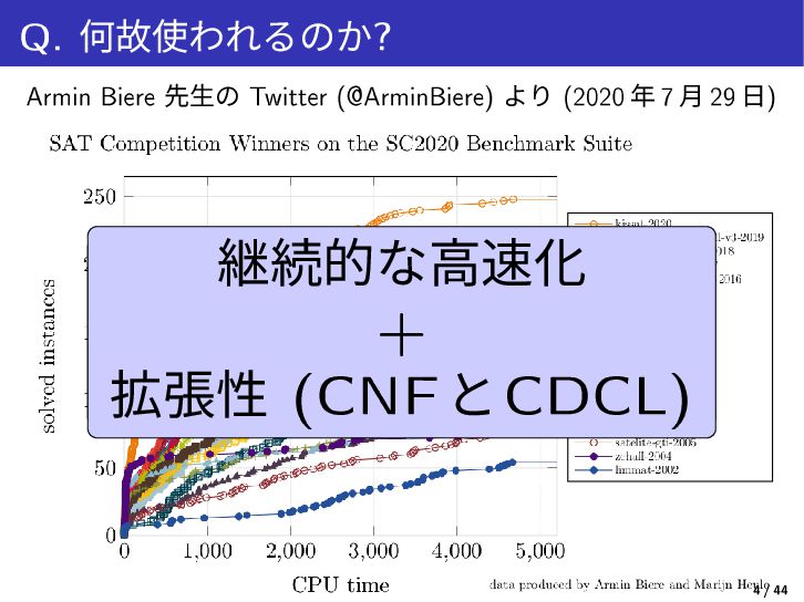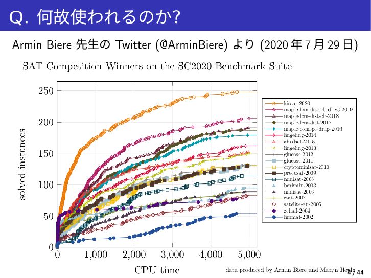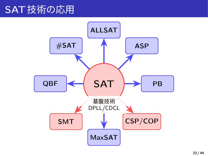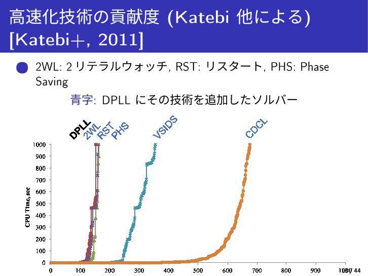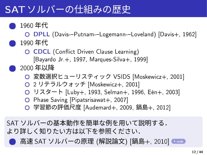 GRASP: A search algorithm for propositional satisability. IEEE Transactions on Computers, 48(5):506521. Moskewicz, Matthew W., Madigan, Conor F., Zhao, Ying, Zhang, Lintao , and Malik, Sharad (2001). Cha: Engineering an ecient SAT solver. In Proceedings of the 38th Design Automation Conference (DAC 2001), pages 530535. ುౡ ӳ , ߶ल (2010). ߴ SAT ιϧόʔͷݪཧ. ਓೳֶձࢽ, 25(1):6876. 5 / 8