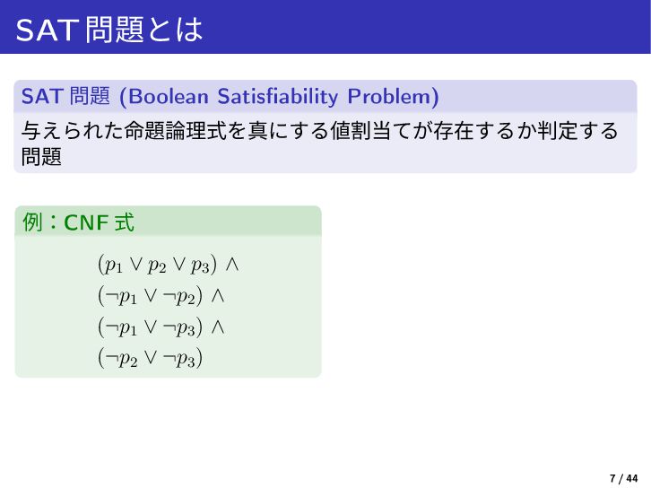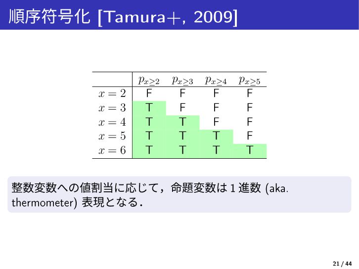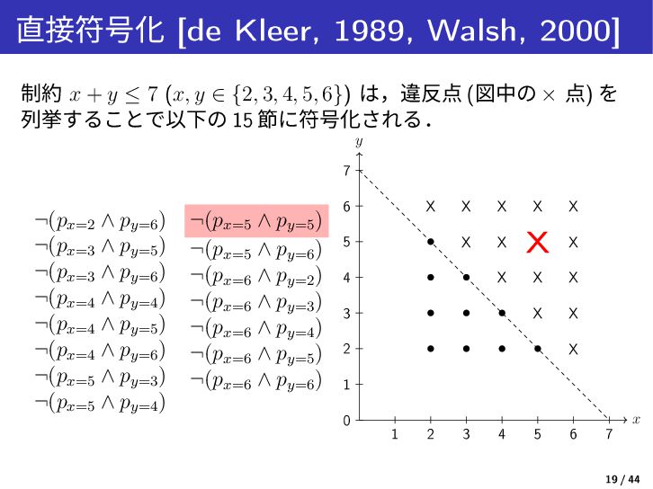 y ∈ {2, 3, 4, 5, 6}) ɼҧ͢ΔൣғΛද͢͜ͱ ͰҎԼͷ 5 અʹූ߸Խ͞ΕΔɽ ¬py≥6 ¬(px≥3 ∧ py≥5 ) ¬(px≥4 ∧ py≥4 ) ¬(px≥5 ∧ py≥3 ) ¬px≥6 x y 1 2 3 4 5 6 7 0 1 2 3 4 5 6 7 X X X X X X X X X X X X X X X 22 / 44