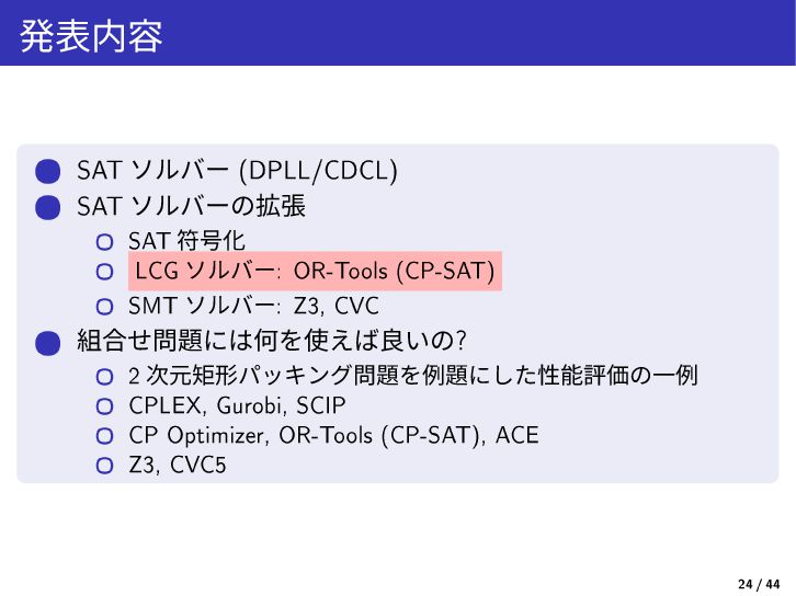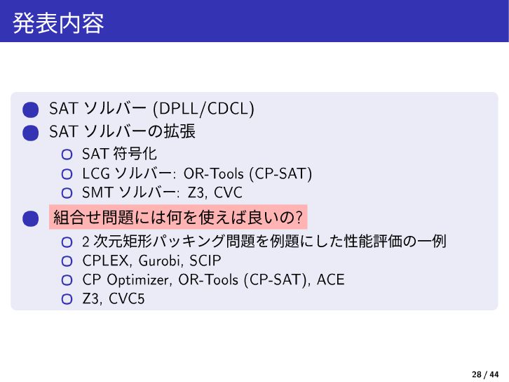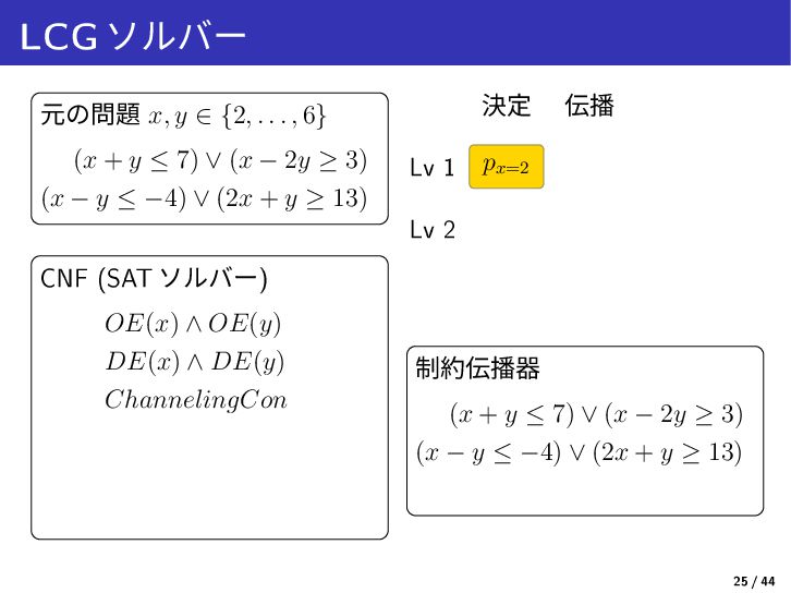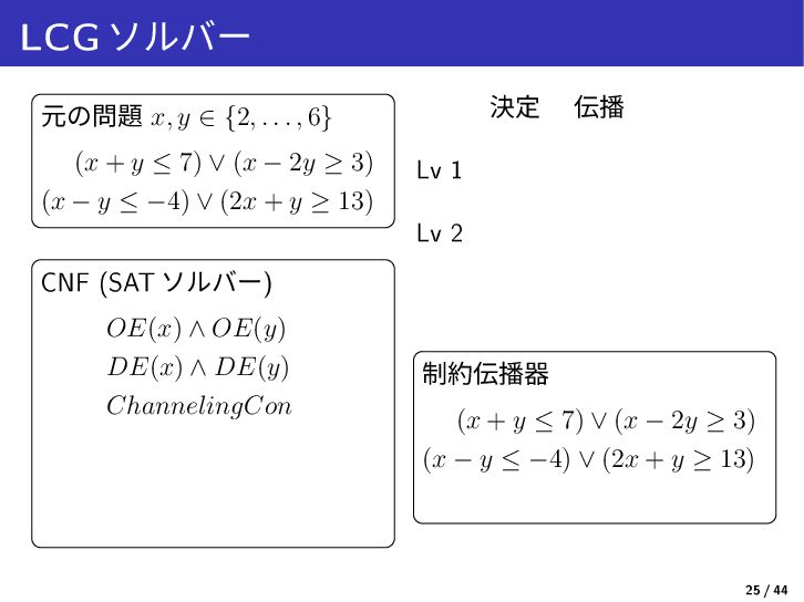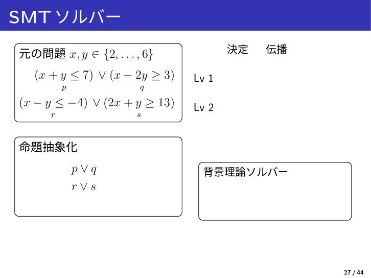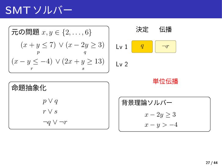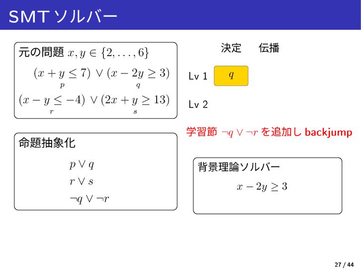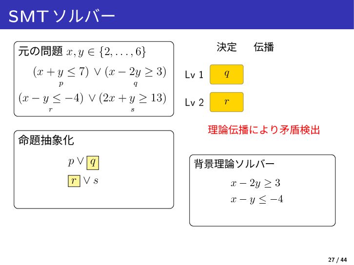 , 6} (x + y ≤ 7) p ∨ (x − 2y ≥ 3) q (x − y ≤ −4) r ∨ (2x + y ≥ 13) s ໋நԽ p ∨ q r ∨ s Lv 1 Lv 2 ܾఆ q r ཧʹΑΓໃ६ݕग़ എܠཧιϧόʔ x − 2y ≥ 3 x − y ≤ −4 27 / 44