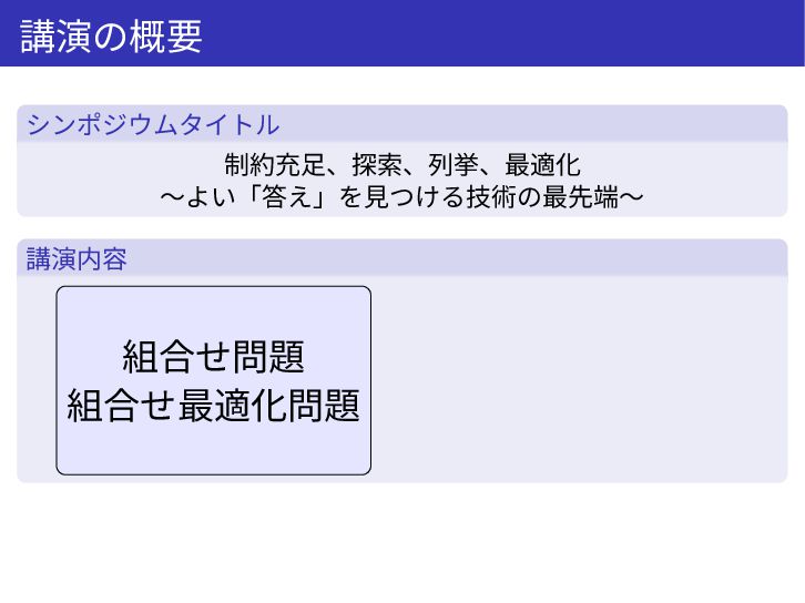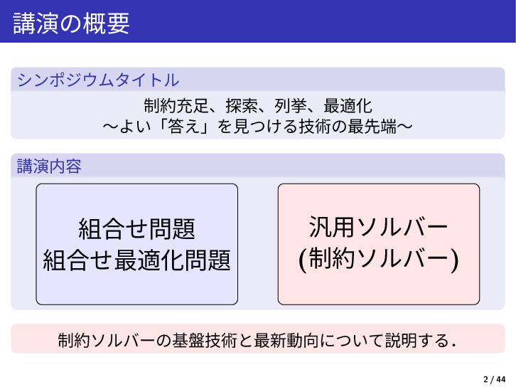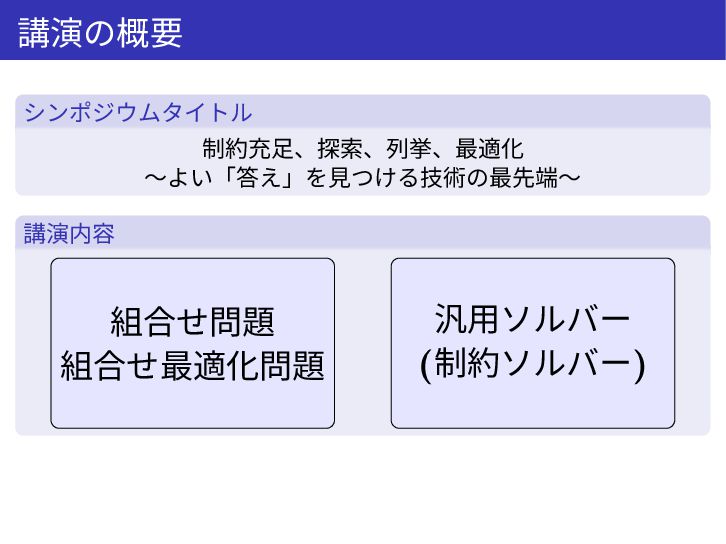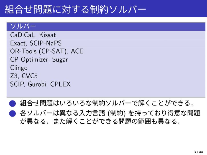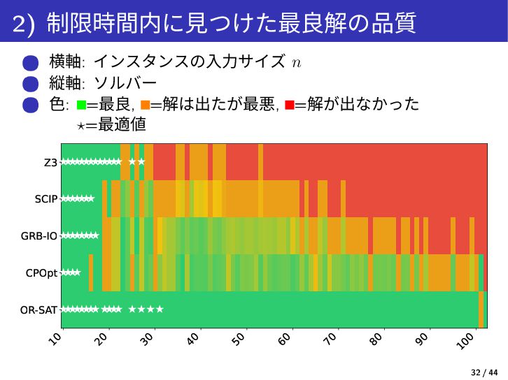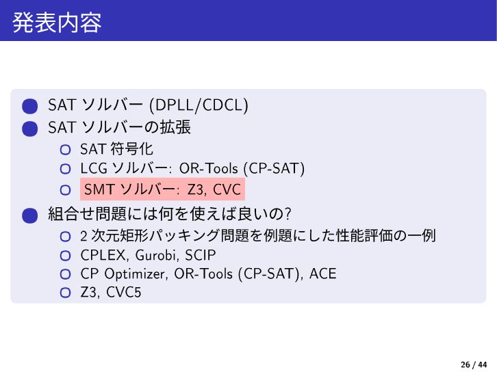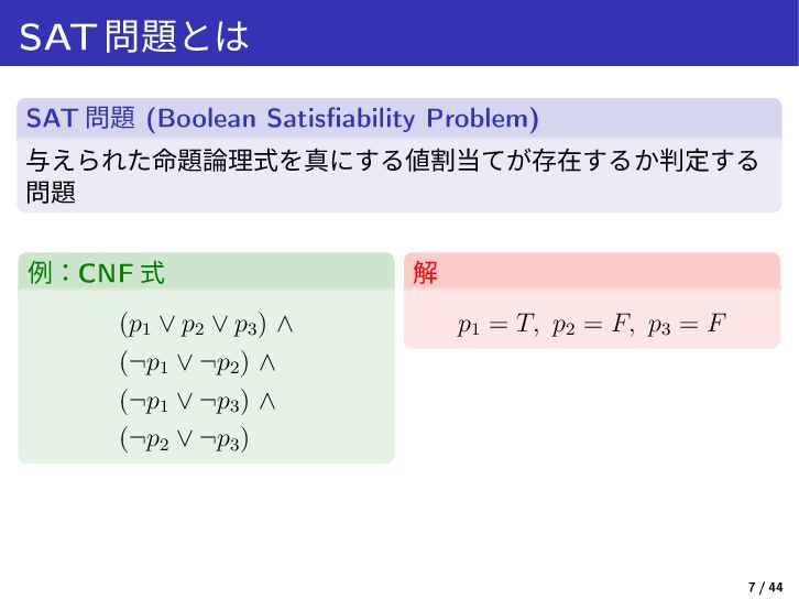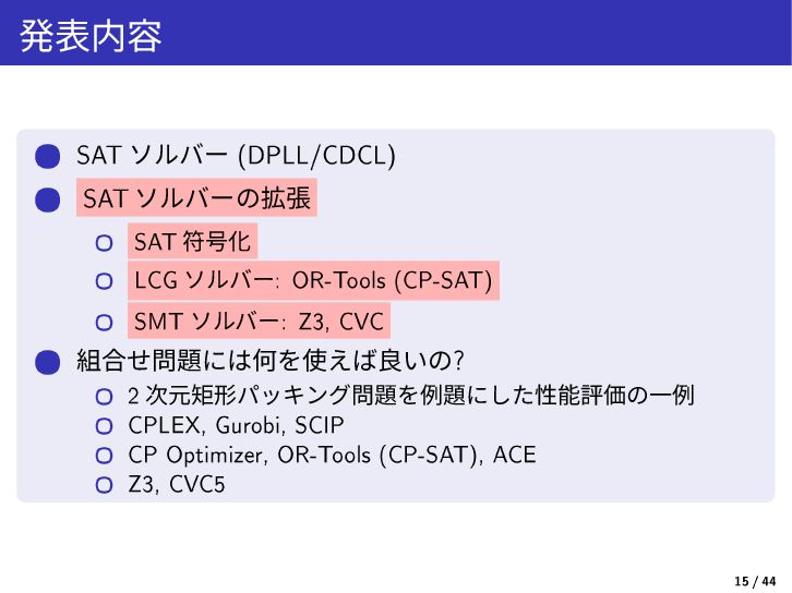 , 6} (x + y ≤ 7) p ∨ (x − 2y ≥ 3) q (x − y ≤ −4) r ∨ (2x + y ≥ 13) s ໋நԽ p ∨ q r ∨ s Lv 1 Lv 2 ܾఆ q r ཧʹΑΓໃ६ݕग़ എܠཧιϧόʔ x − 2y ≥ 3 x − y ≤ −4 27 / 44
