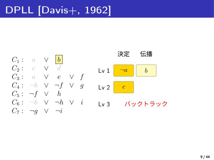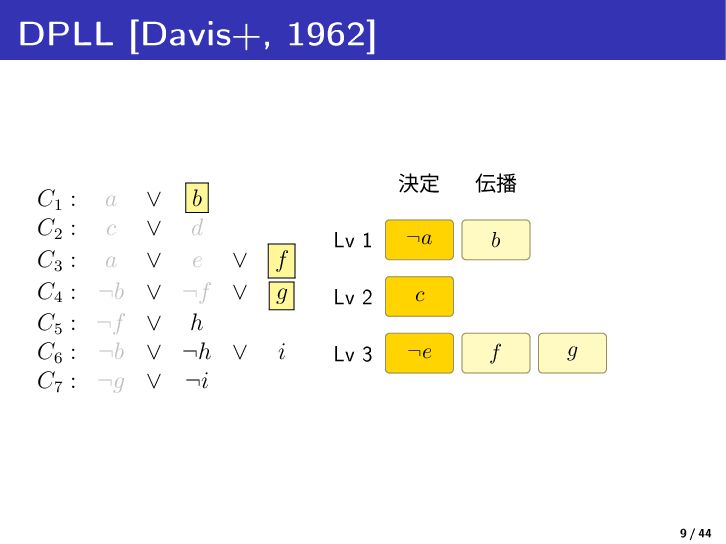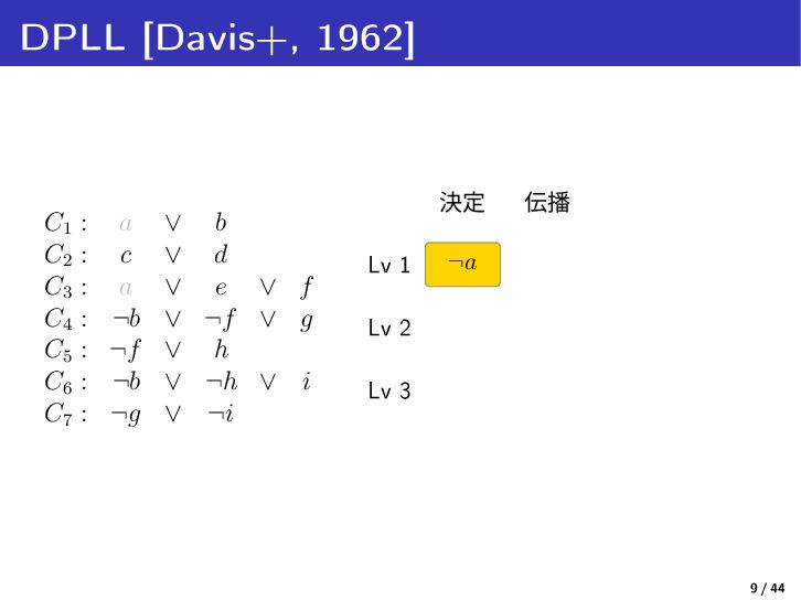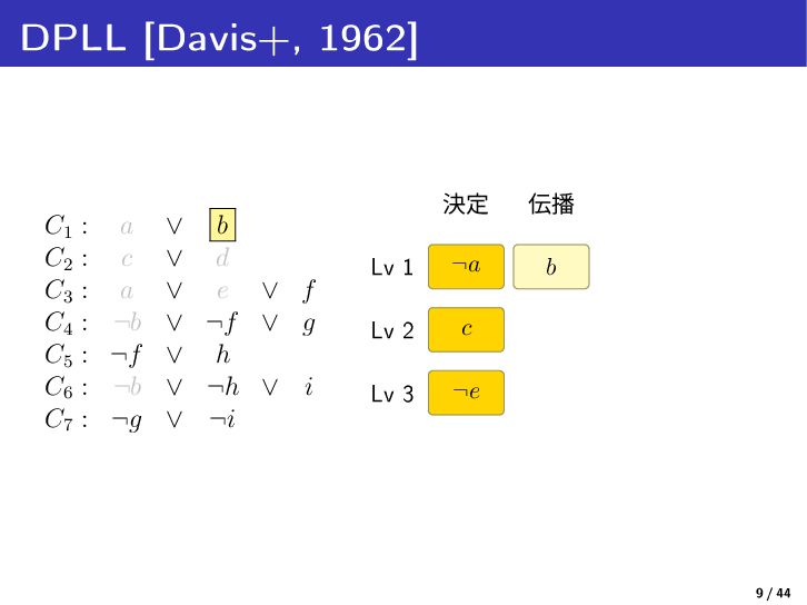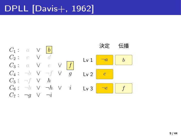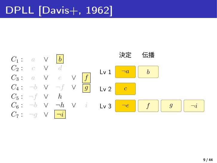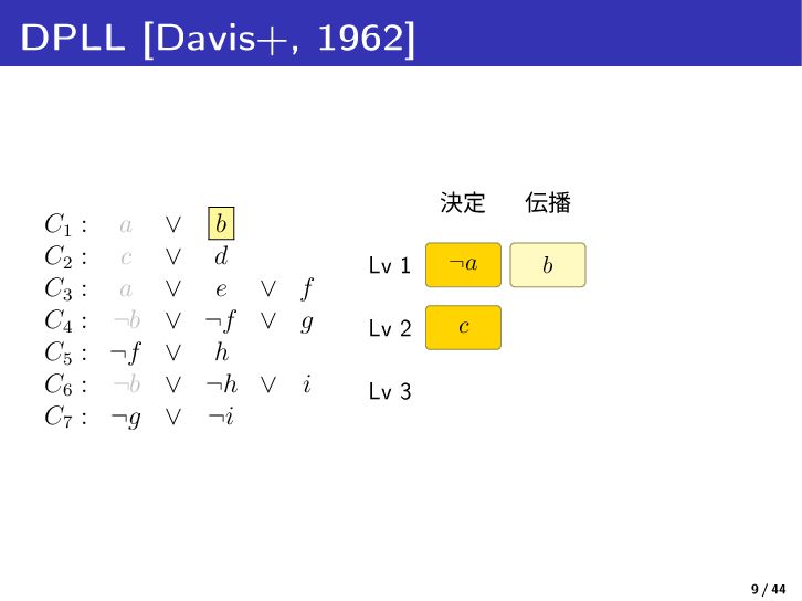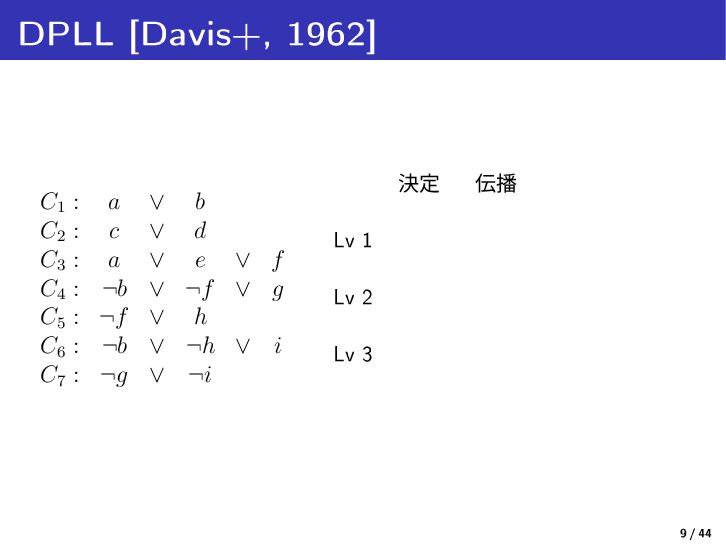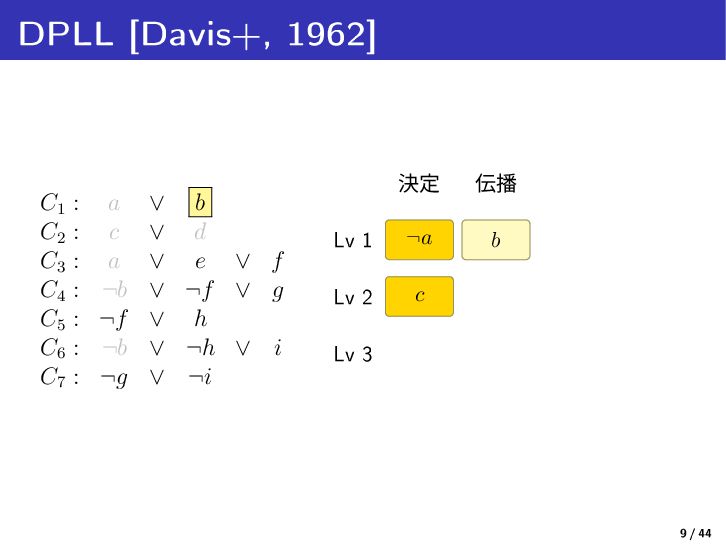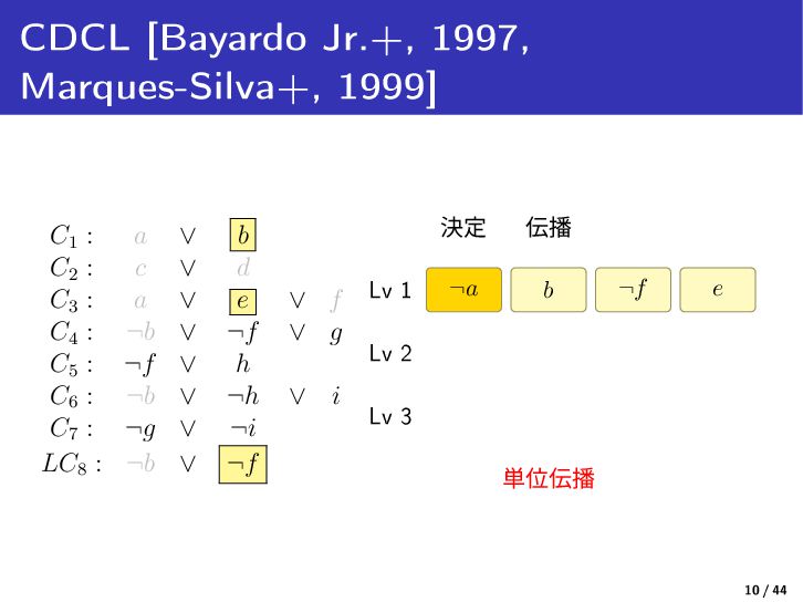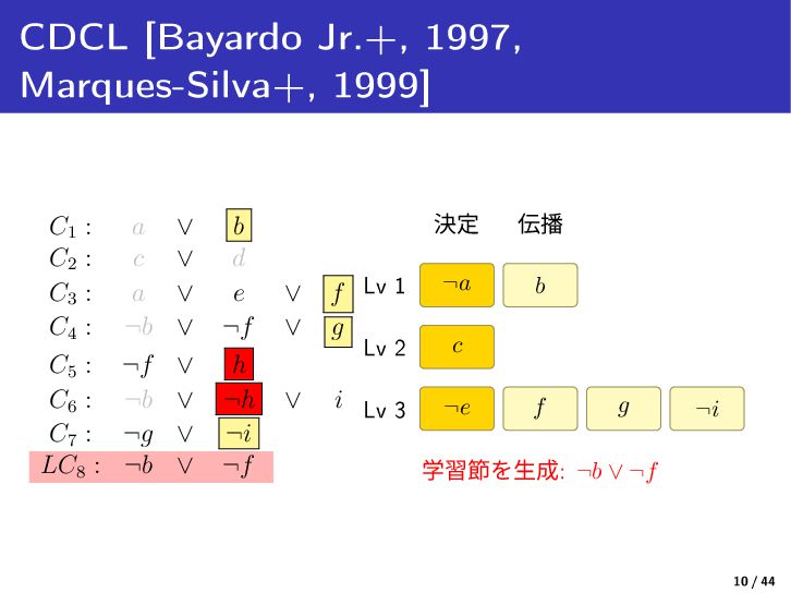 b C2 : c ∨ d C3 : a ∨ e ∨ f C4 : ¬b ∨ ¬f ∨ g C5 : ¬f ∨ h C6 : ¬b ∨ ¬h ∨ i C7 : ¬g ∨ ¬i LC8 : ¬b ∨ ¬f Lv 1 Lv 2 Lv 3 ܾఆ ¬a b c ¬e f g ¬i ֶशઅΛੜ: ¬b ∨ ¬f 10 / 44