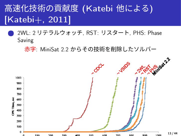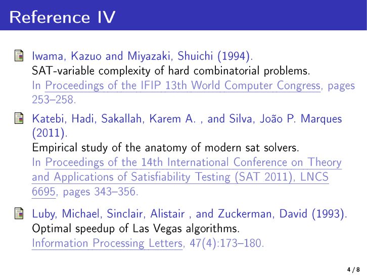 of hard combinatorial problems. In Proceedings of the IFIP 13th World Computer Congress, pages 253258. Katebi, Hadi, Sakallah, Karem A. , and Silva, João P. Marques (2011). Empirical study of the anatomy of modern sat solvers. In Proceedings of the 14th International Conference on Theory and Applications of Satisability Testing (SAT 2011), LNCS 6695, pages 343356. Luby, Michael, Sinclair, Alistair , and Zuckerman, David (1993). Optimal speedup of Las Vegas algorithms. Information Processing Letters, 47(4):173180. 4 / 8