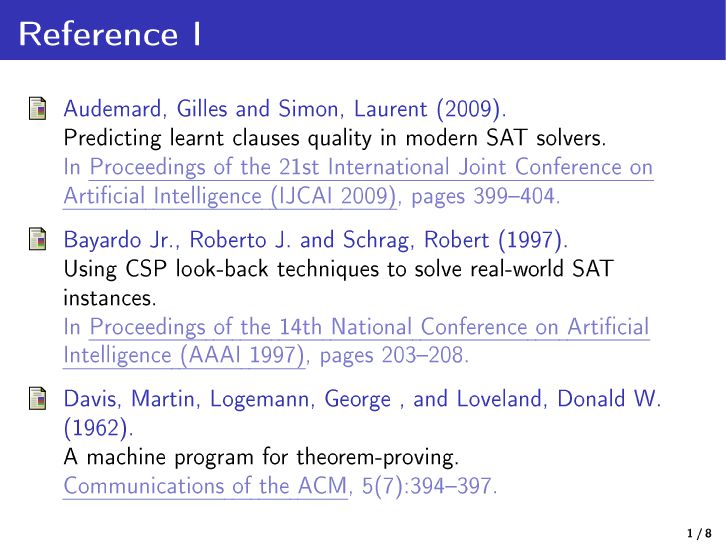 clauses quality in modern SAT solvers. In Proceedings of the 21st International Joint Conference on Articial Intelligence (IJCAI 2009), pages 399404. Bayardo Jr., Roberto J. and Schrag, Robert (1997). Using CSP look-back techniques to solve real-world SAT instances. In Proceedings of the 14th National Conference on Articial Intelligence (AAAI 1997), pages 203208. Davis, Martin, Logemann, George , and Loveland, Donald W. (1962). A machine program for theorem-proving. Communications of the ACM, 5(7):394397. 1 / 8