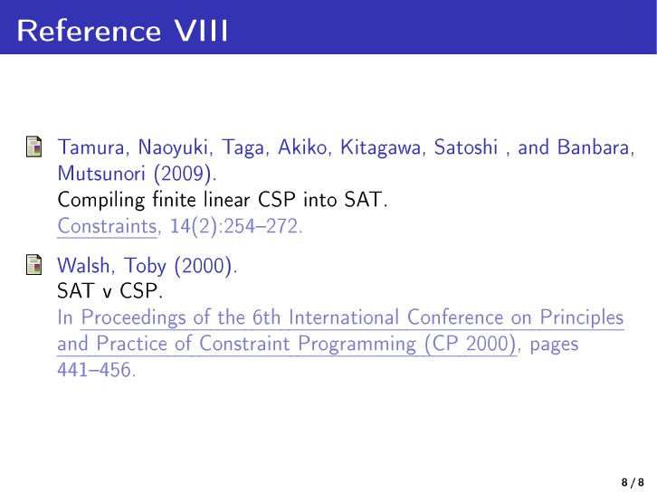 Banbara, Mutsunori (2009). Compiling nite linear CSP into SAT. Constraints, 14(2):254272. Walsh, Toby (2000). SAT v CSP. In Proceedings of the 6th International Conference on Principles and Practice of Constraint Programming (CP 2000), pages 441456. 8 / 8
