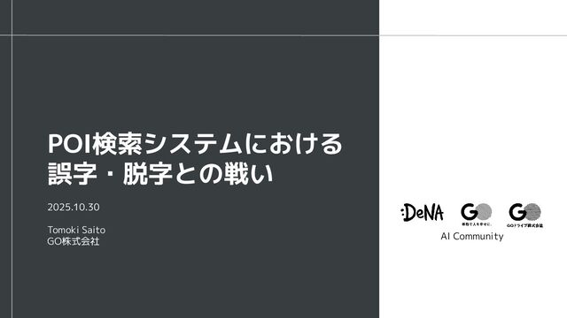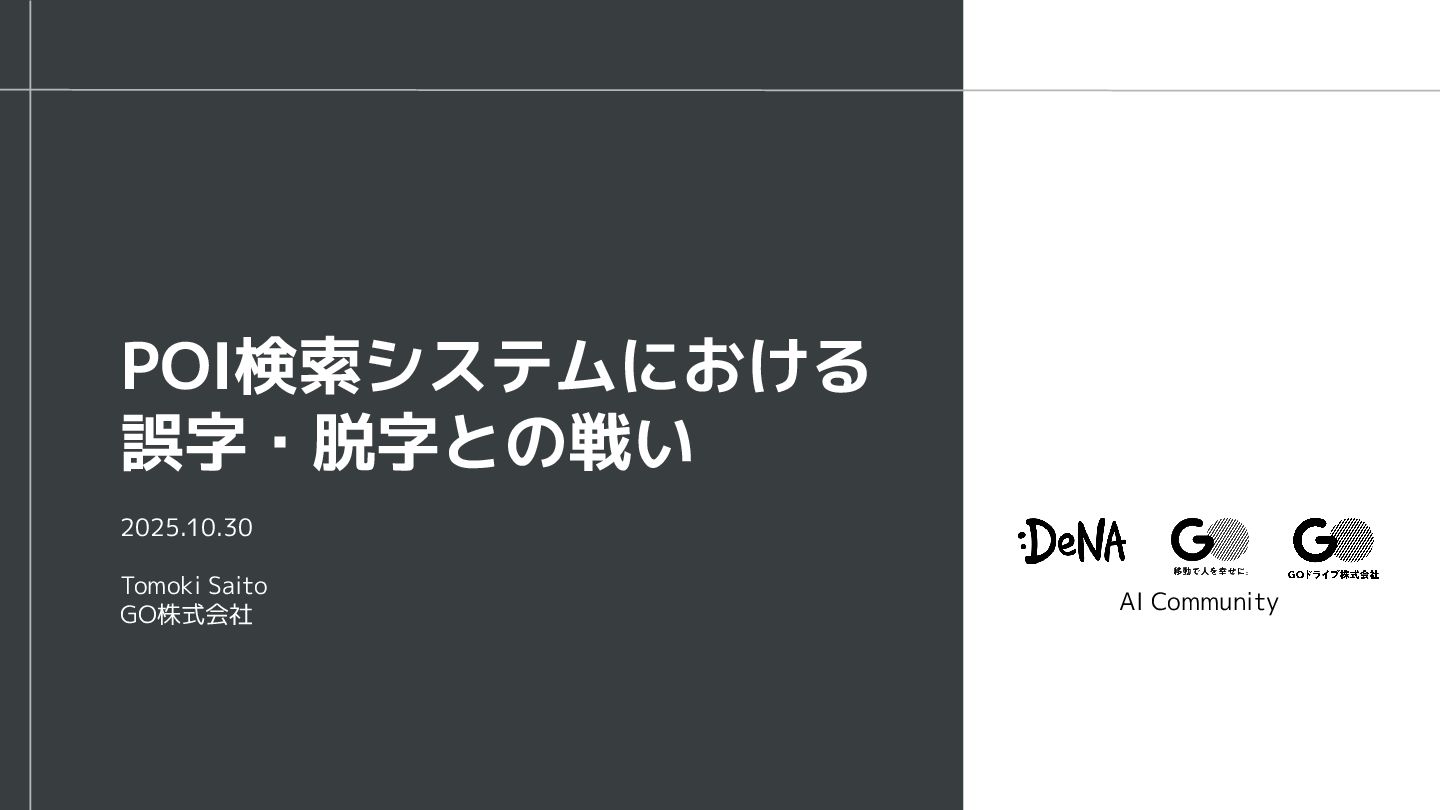 GO株式会社のSaito Tomokiが、地図やナビアプリの「POI(地点)検索」の裏側で起きている課題と、その解決へのアプローチを明かす技術資料です 。