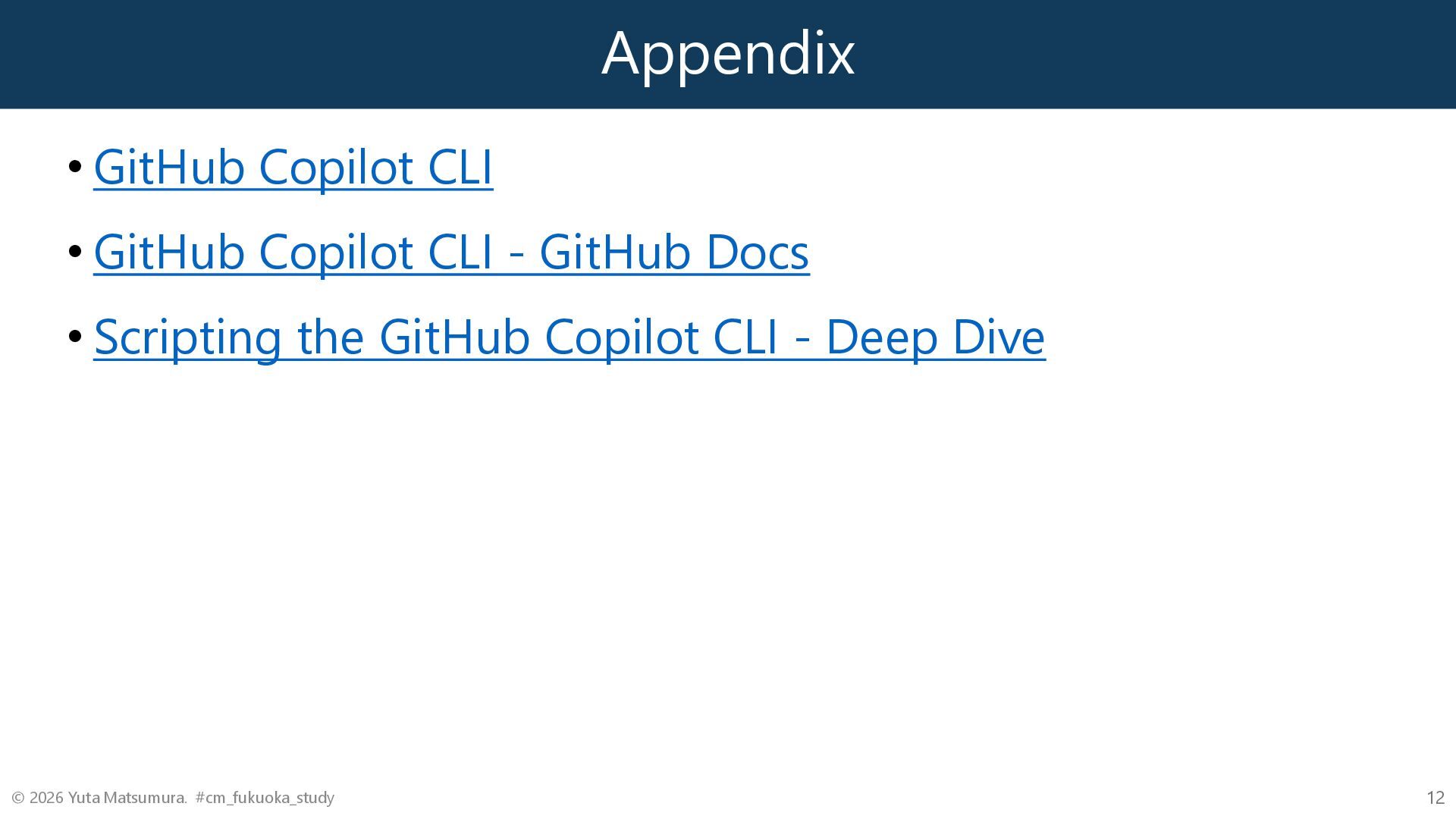 GitHub Docs • Scripting the GitHub Copilot CLI - Deep Dive © 2026 Yuta Matsumura. #cm_fukuoka_study 12