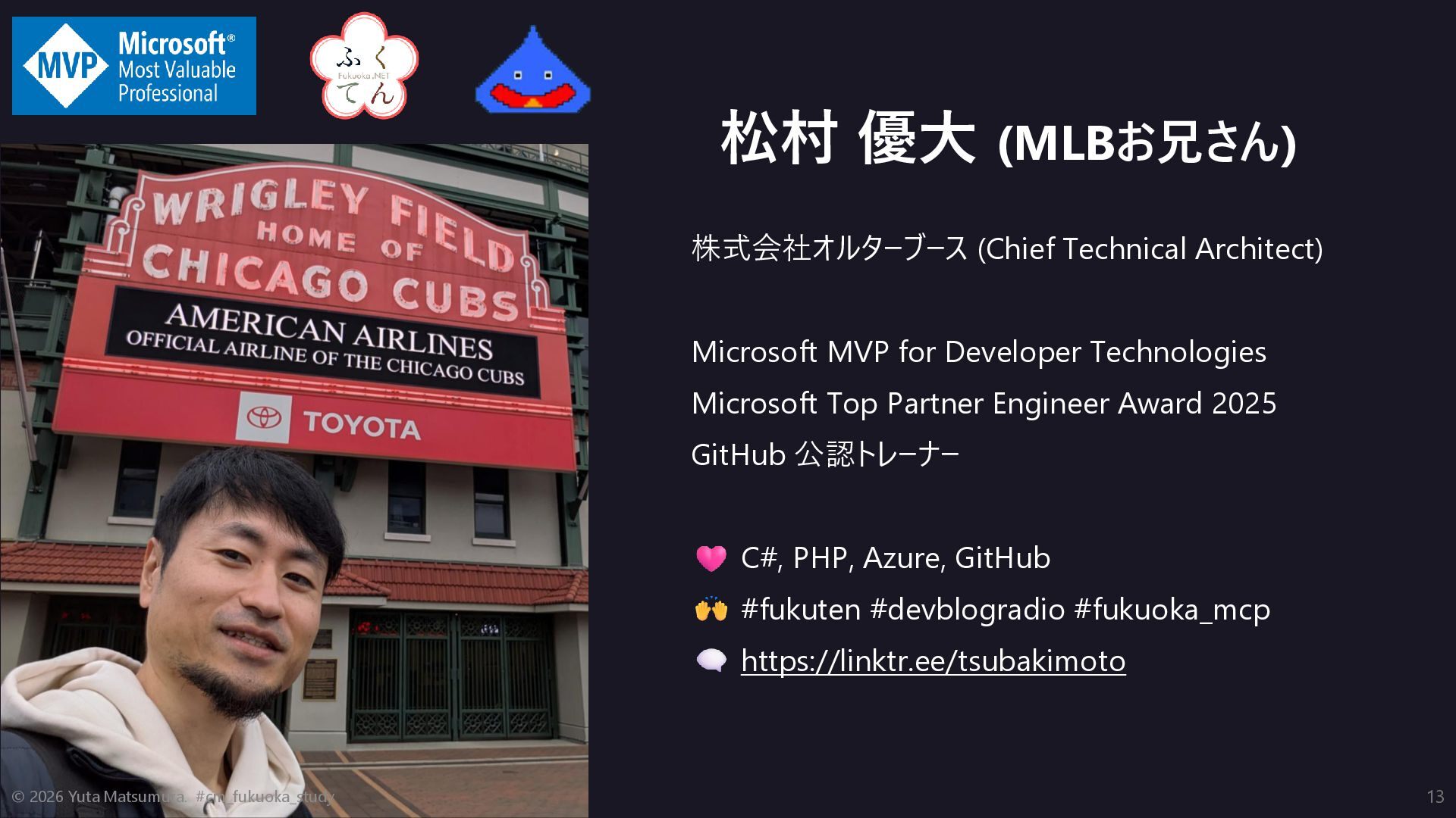 Technical Architect) Microsoft MVP for Developer Technologies Microsoft Top Partner Engineer Award 2025 GitHub 公認トレーナー C#, PHP, Azure, GitHub #fukuten #devblogradio #fukuoka_mcp https://linktr.ee/tsubakimoto 13