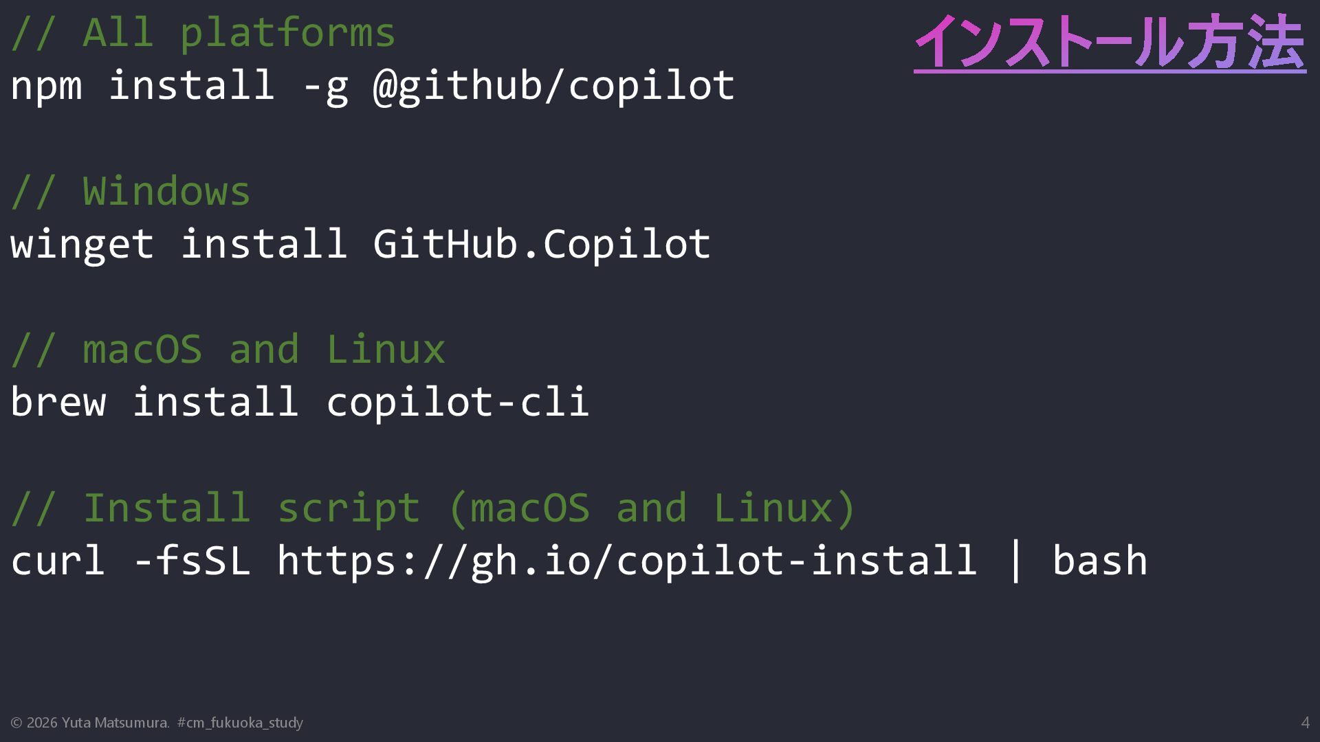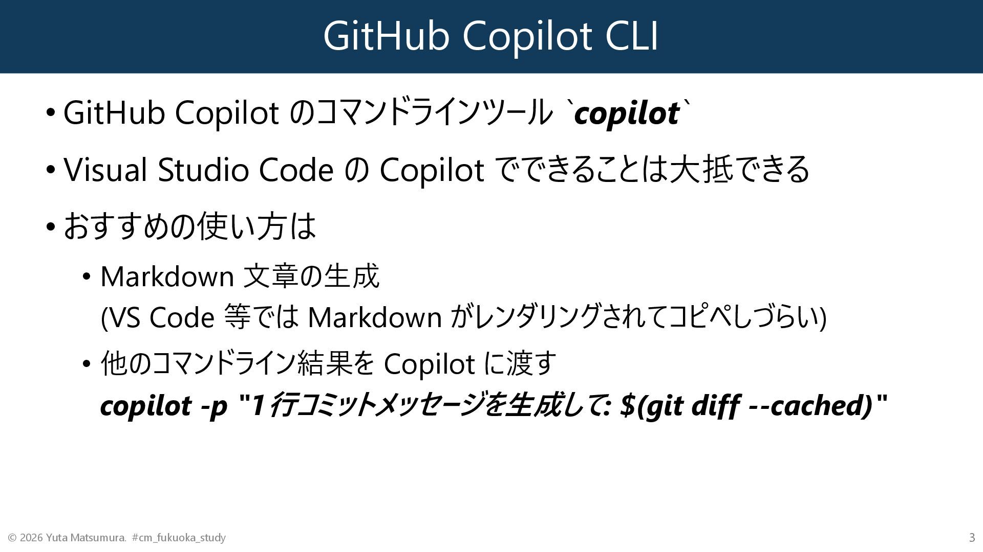 Studio Code の Copilot でできることは大抵できる • おすすめの使い方は • Markdown 文章の生成 (VS Code 等では Markdown がレンダリングされてコピペしづらい) • 他のコマンドライン結果を Copilot に渡す copilot -p "1行コミットメッセージを生成して: $(git diff --cached)" © 2026 Yuta Matsumura. #cm_fukuoka_study 3